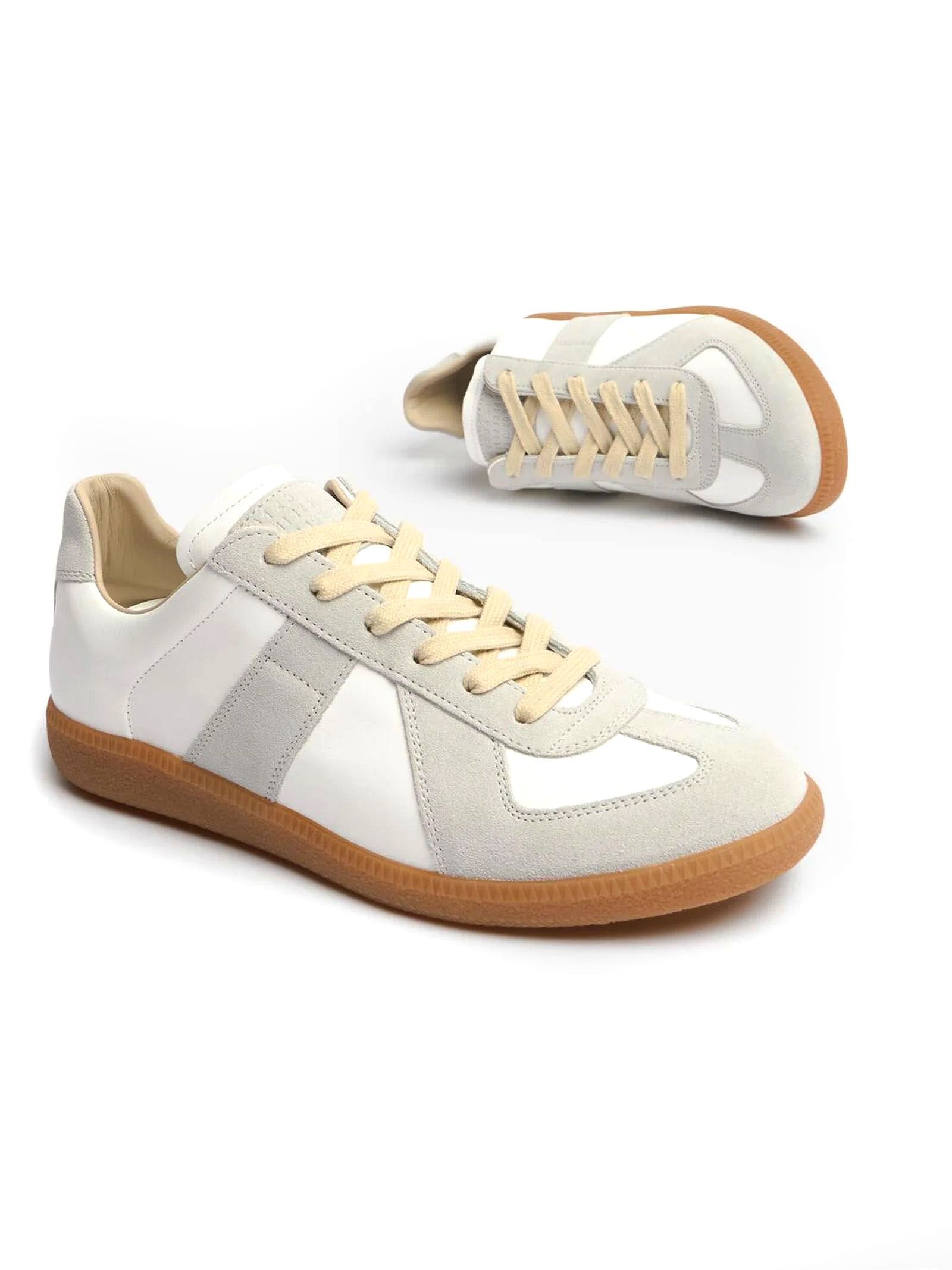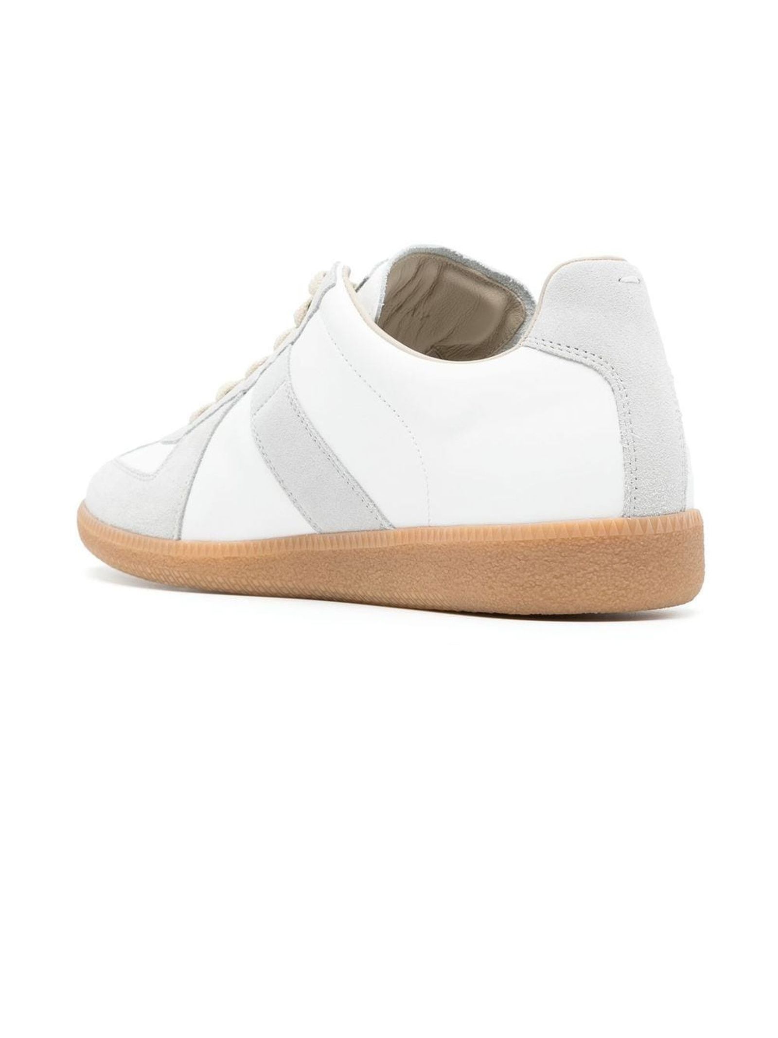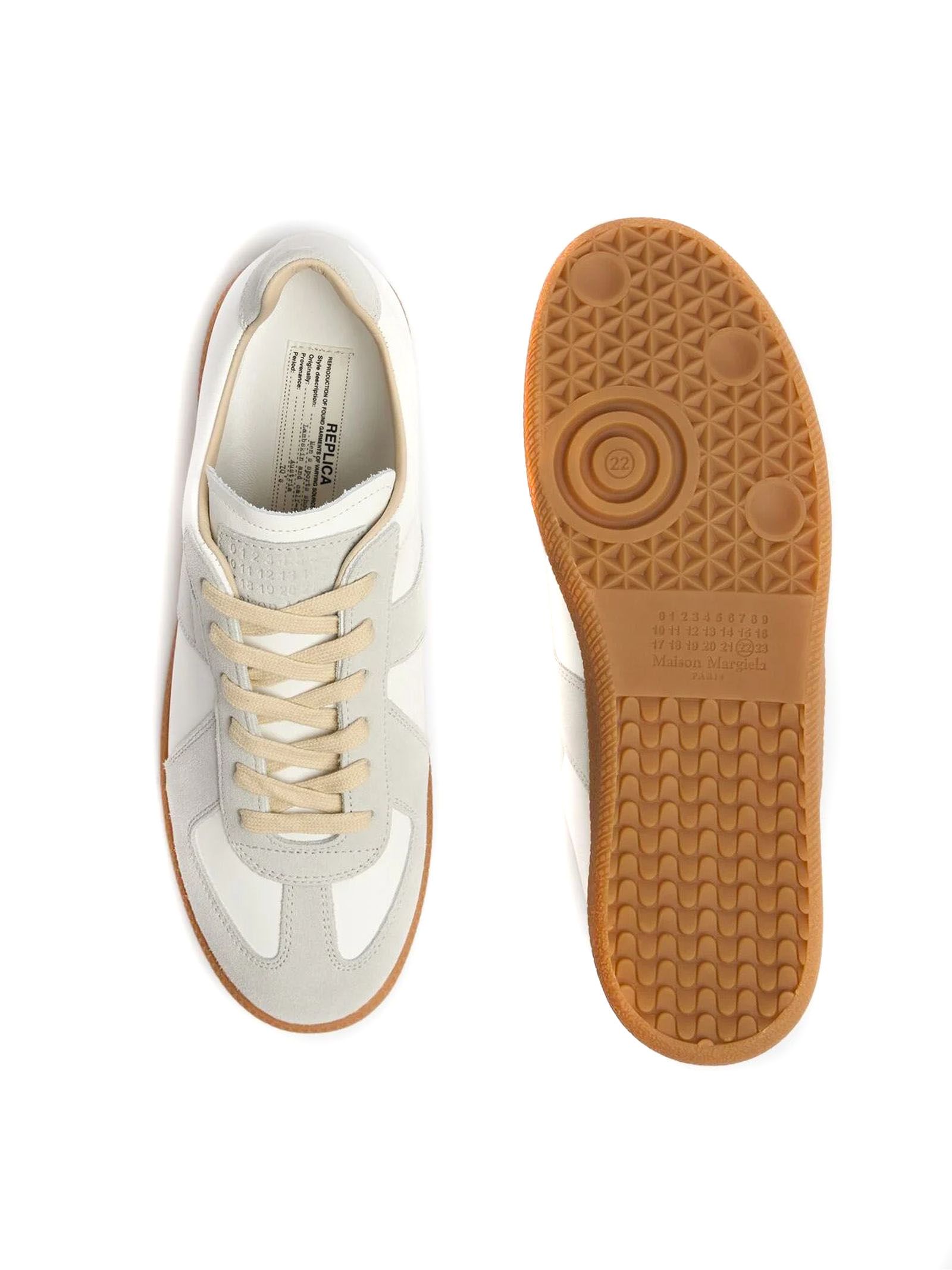 Sneakers stringate in pelle nappa e crosta di pelle, suola a contrasto, etichetta con logo Maison Margiela sulla linguetta, impuntura bianca sul retro, etichetta Replica interna, elastico interno, Logo Maison Margiela all-over sulla soletta, pulire con un prodotto per la pelle delicato
