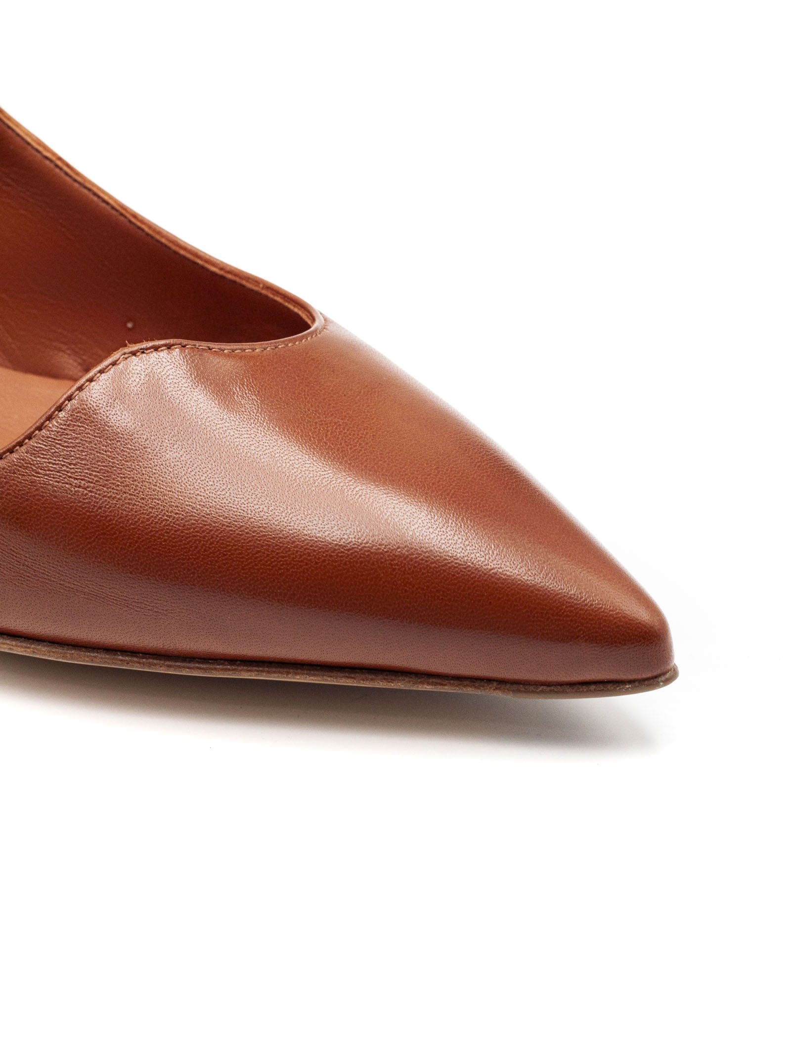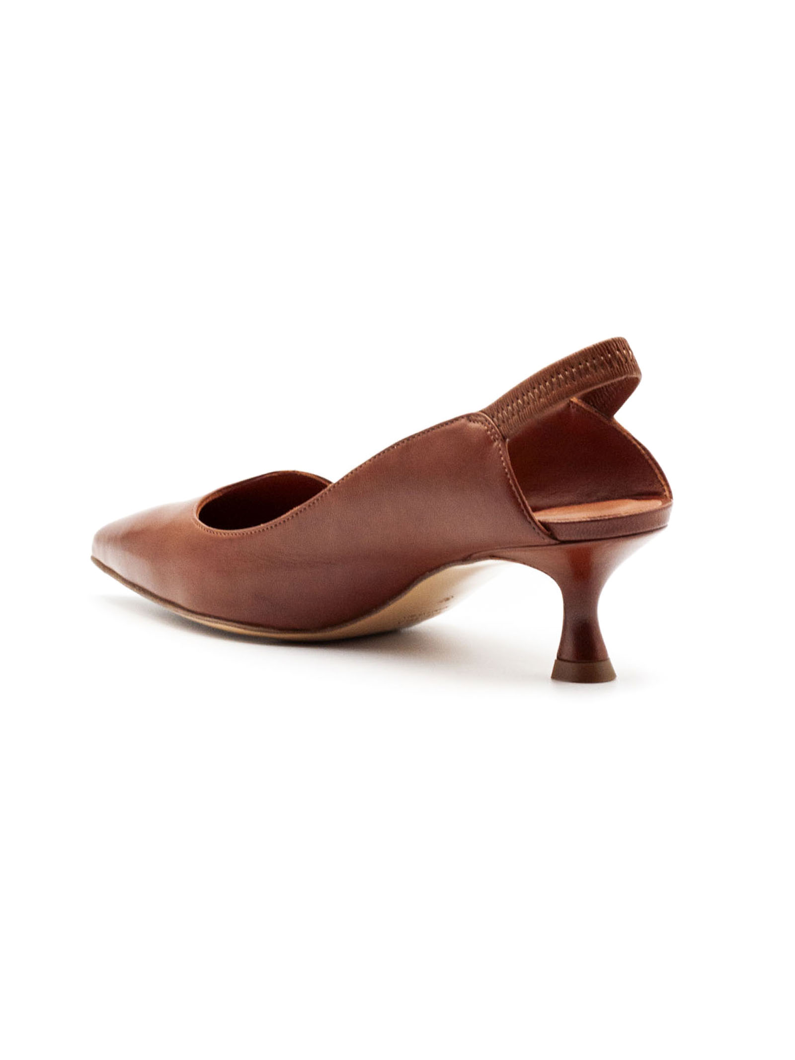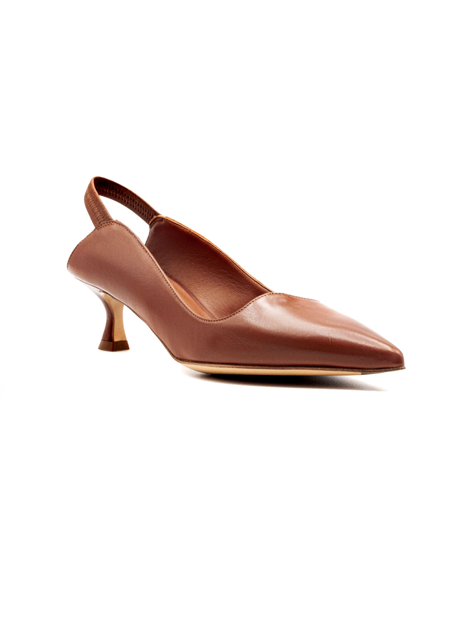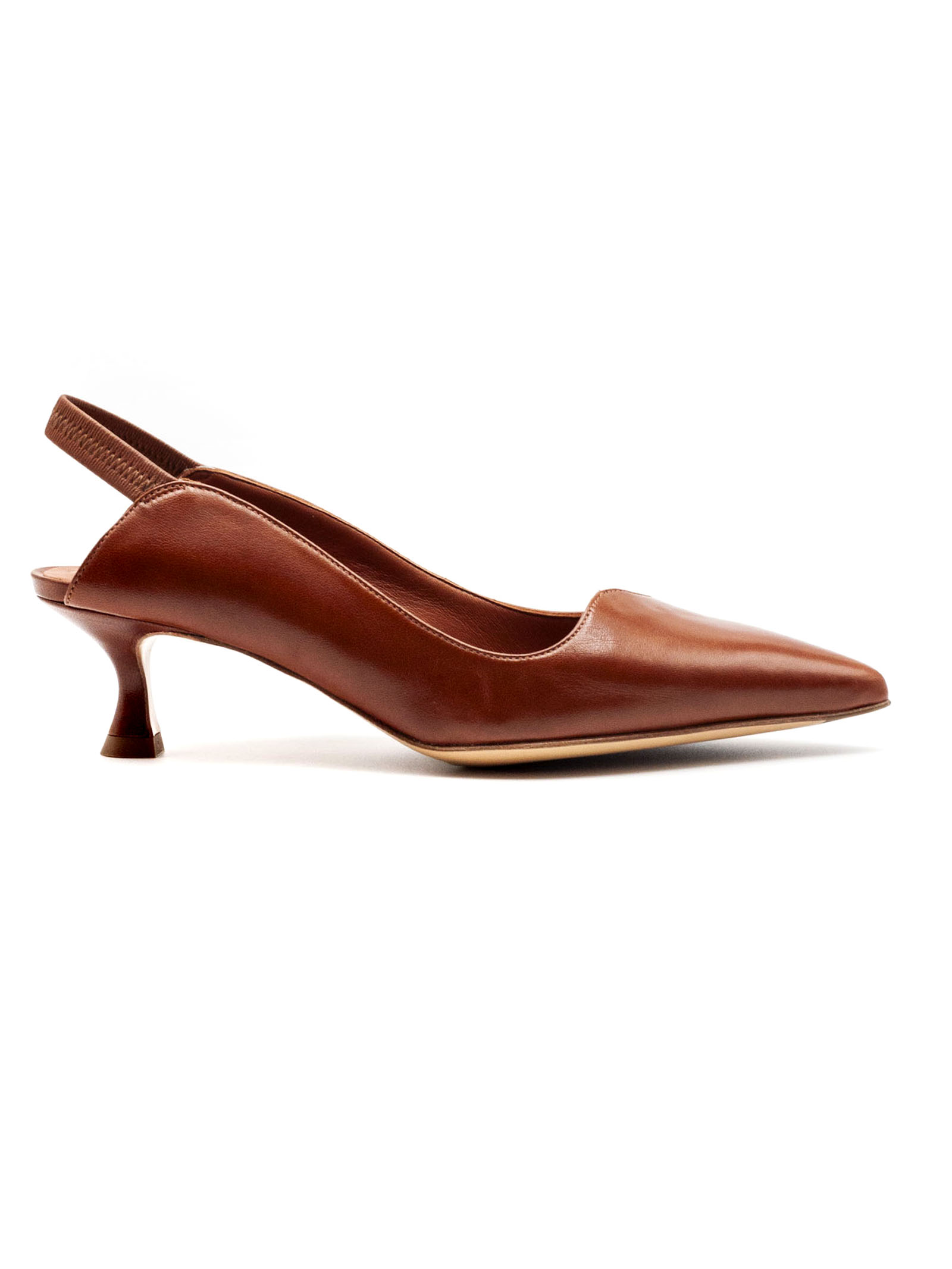 Décolleté slingback in pelle marrone liscia con punta affusolata e cinturino posteriore, tacco medio sagomato, suola in cuoio con logo, altezza tacco 4 cm