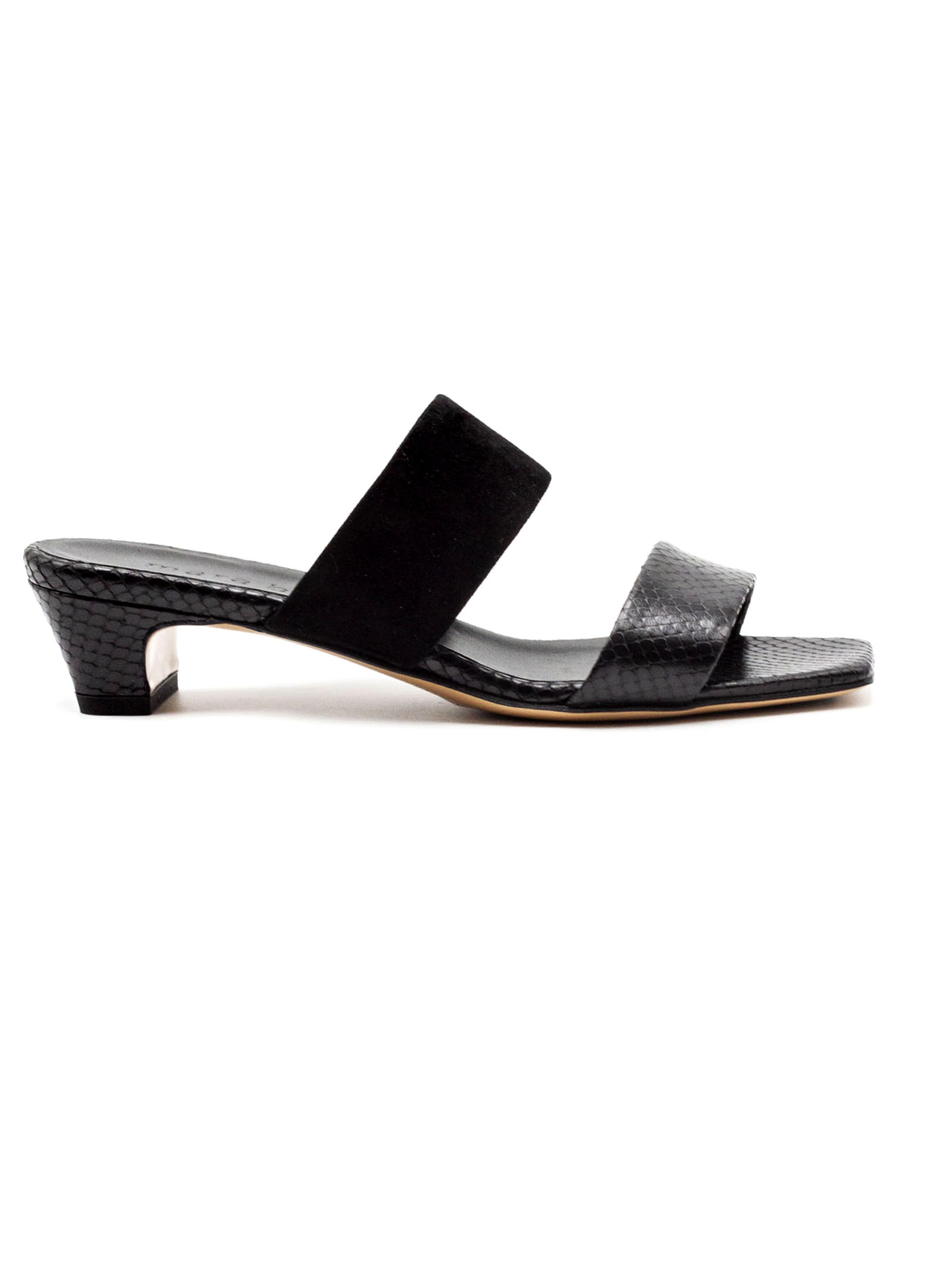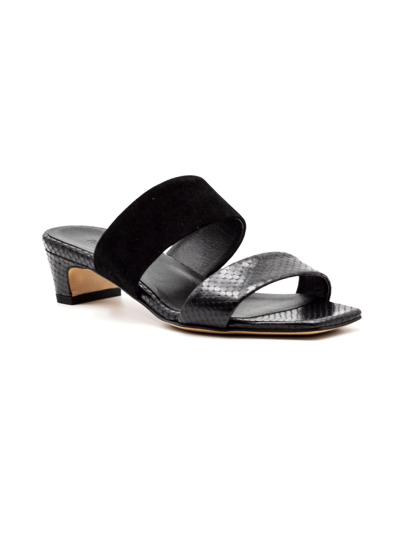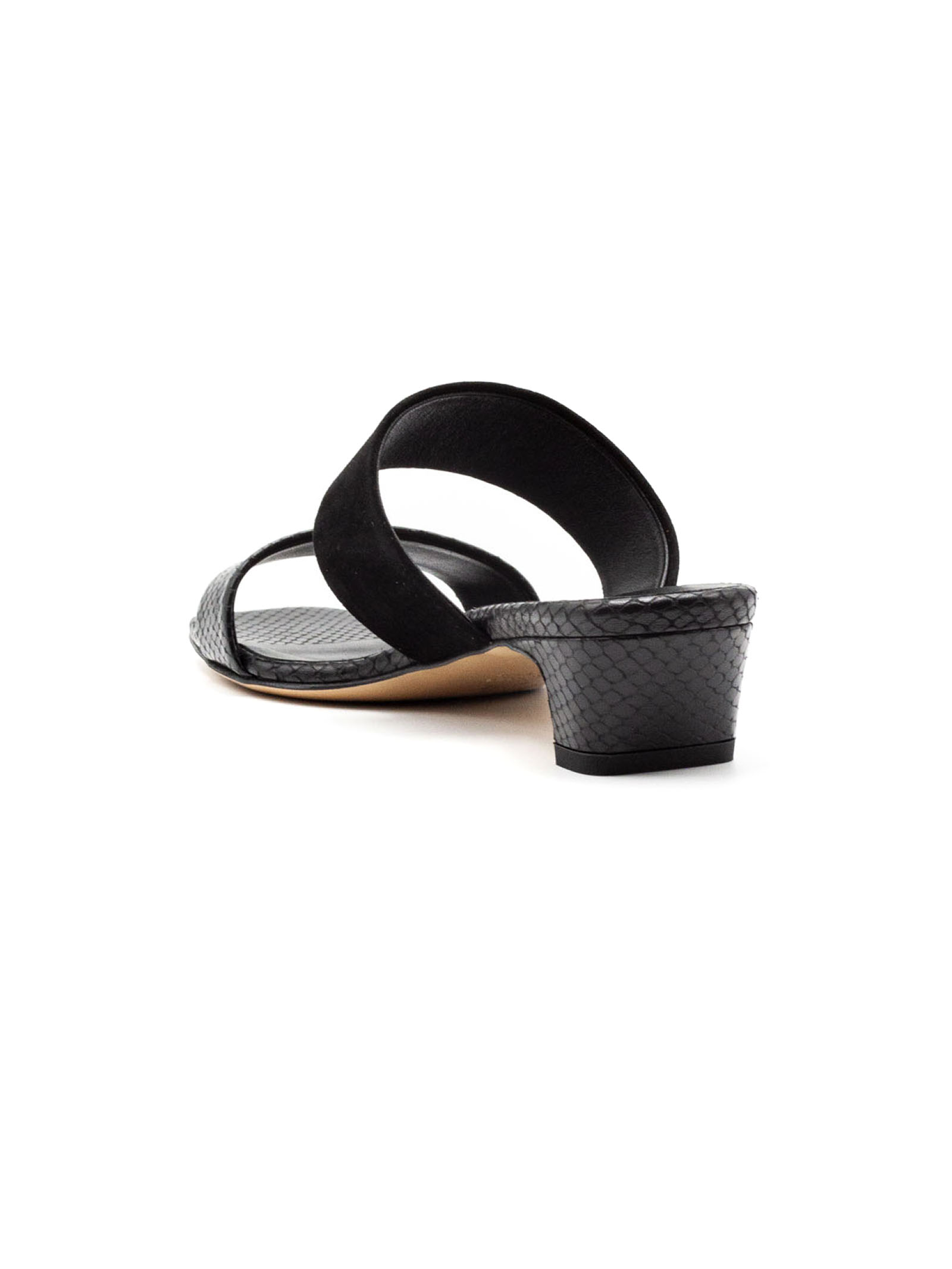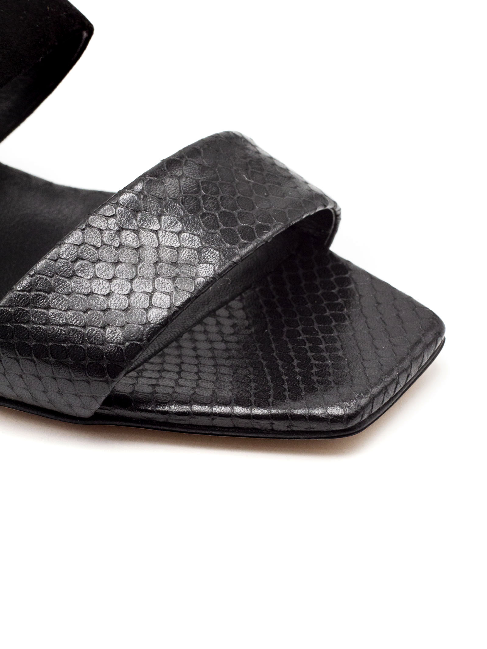 Sandalo mule in pelle nera con finitura effetto stampa rettile, doppia fascia e punta quadrata, completato da tacco medio, suola in cuoio con logo, altezza tacco 3,5cm