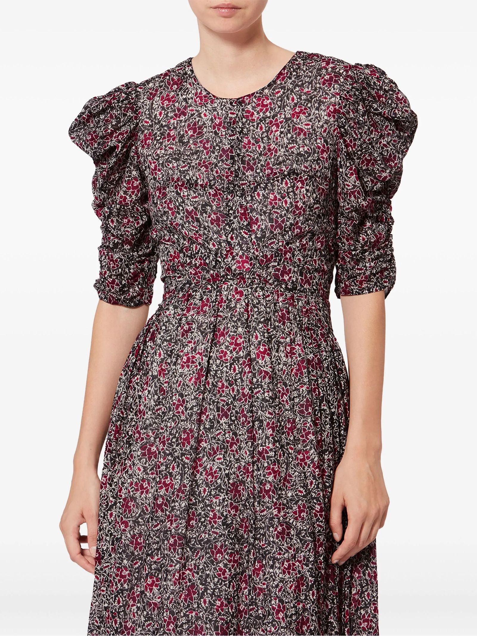 Abito lungo in voile di cotone biologico con stampa floreale, Maniche a 3/4 arricciate a sbuffo, Scollatura posteriore con lacci da annodare, Modello con fodera, Sottogonna arricciata con zip invisibile sul retro, Taglio svasato