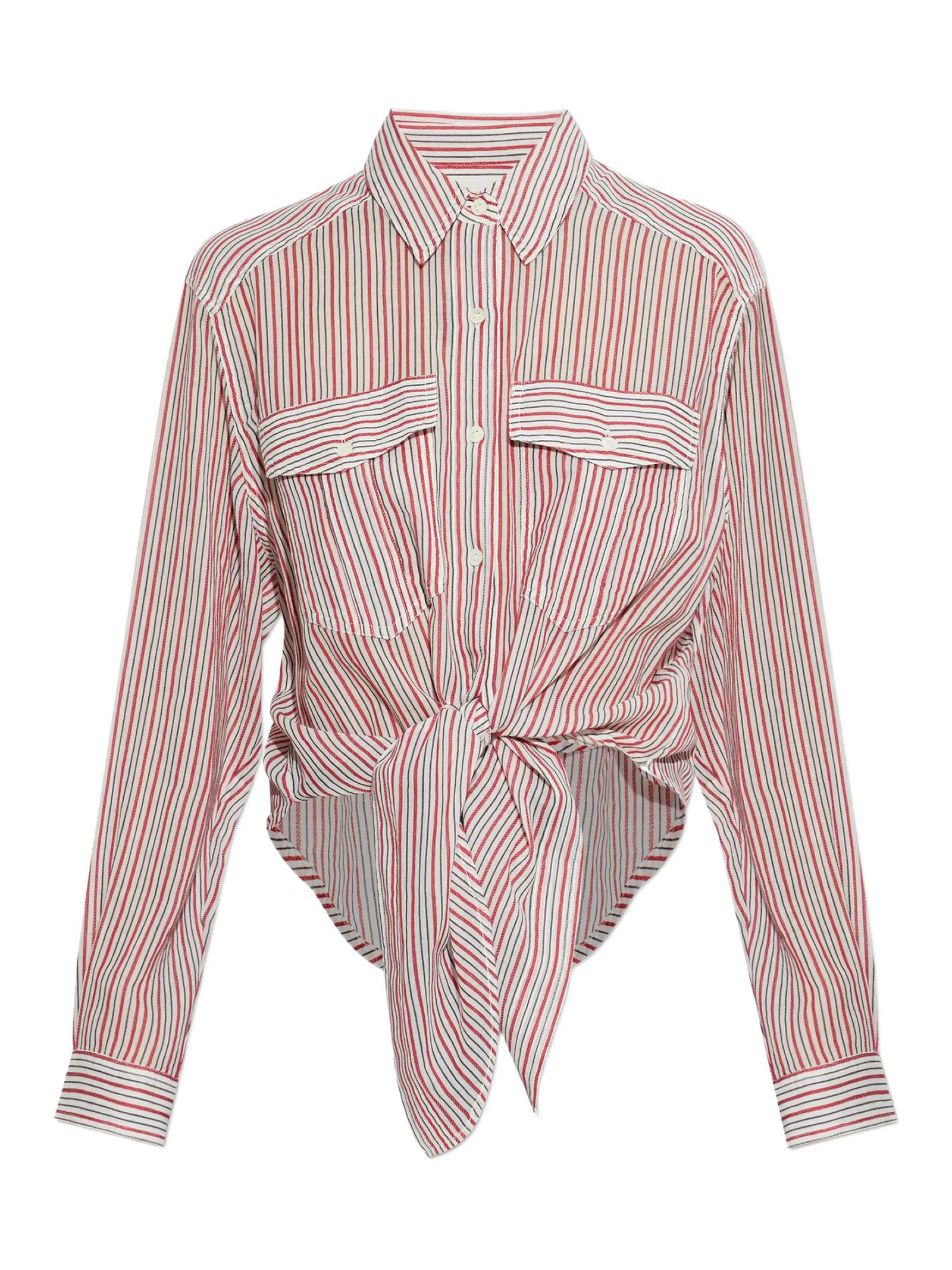 Camicia Nath Da Annodare In Voile Di Cotone A Righe, Camicia da annodare in voile di cotone a righe, Colletto a camicia, Maniche lunghe con bottoni ai polsini, Chiusura tramite bottoni, Tasche applicate sul petto con patta a bottone, Orlo inferiore arrotondato e taglio oversize