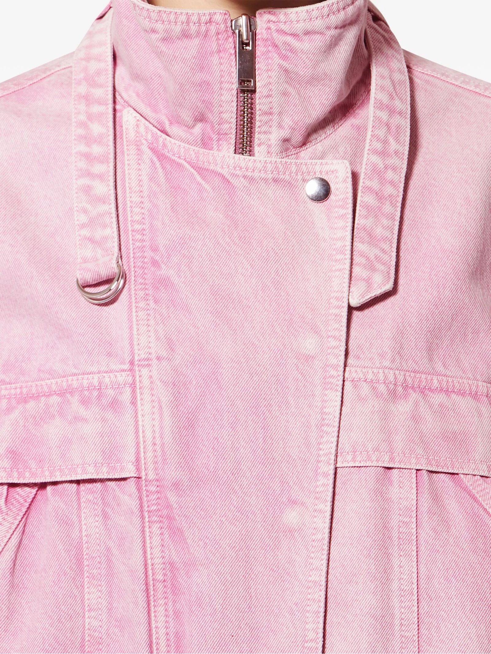 Giacca denim in tela di cotone délavé, Collo alto regolabile con fibbia metallica, Giromanica basso, Maniche con polsini stretti, Polsini con automatici, Tasche laterali raglan, Cintura montata con fibbia metallica regolabile, Etichetta in pelle con logo "Isabel Marant", Taglio casual