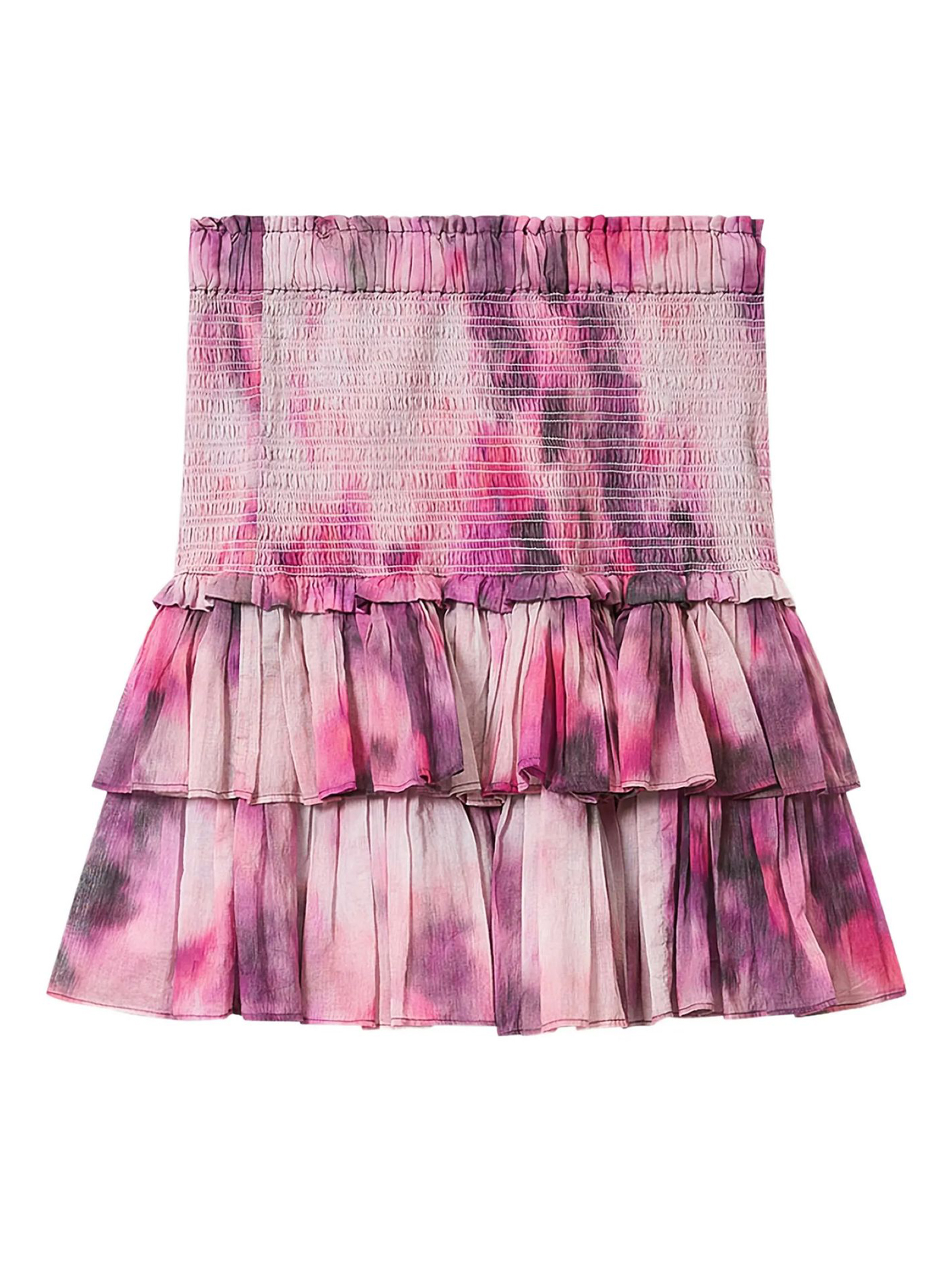 Gonna corta e fluida in voile di cotone biologico, Stampa a nuvola, Punti smock ampi, Serie di volant, Taglio svasato