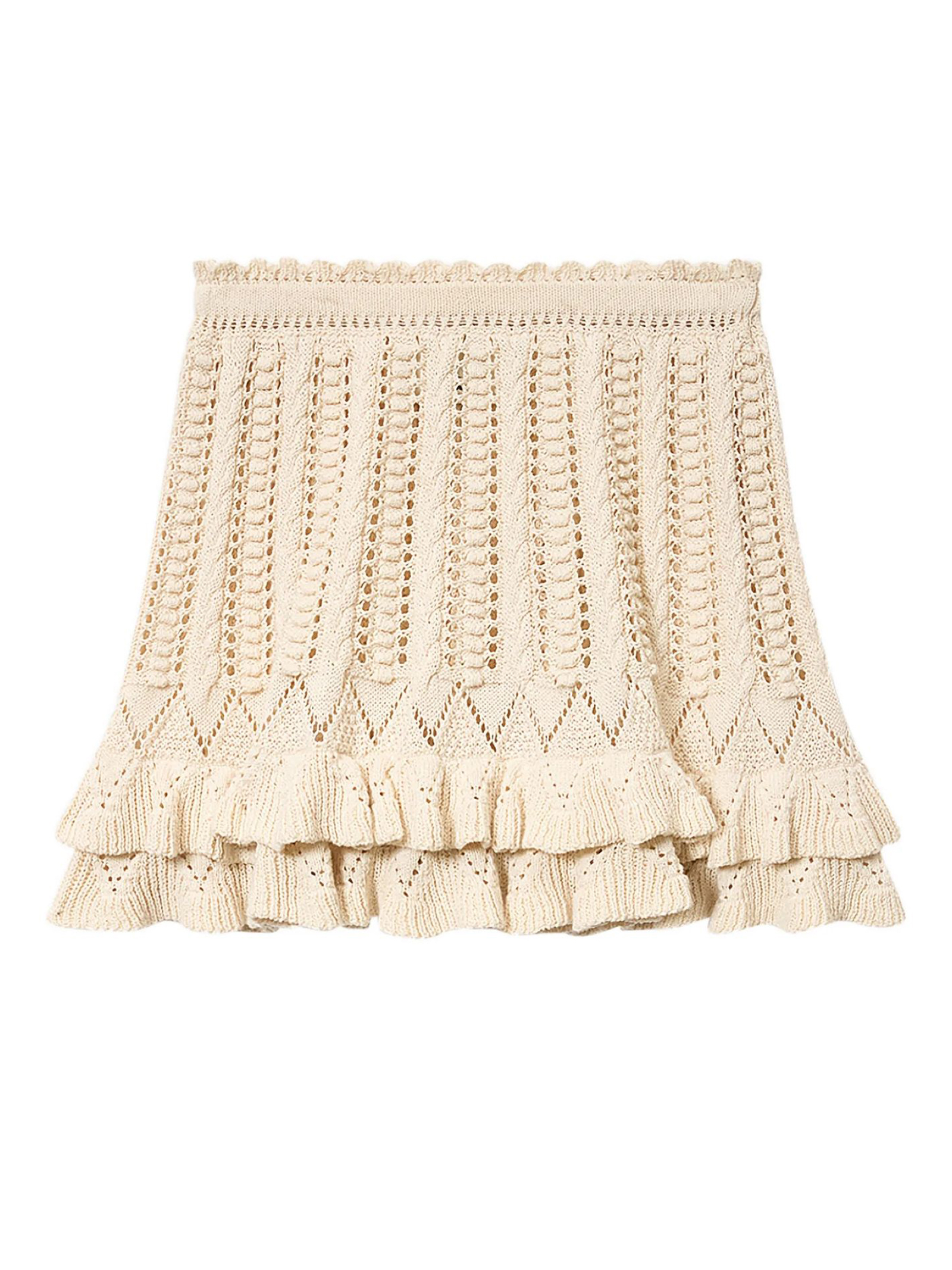 Gonna corta in cotone con volant, Elastico in vita, Traforature, Orlo inferiore del modello rifinito con volant, Taglio svasato