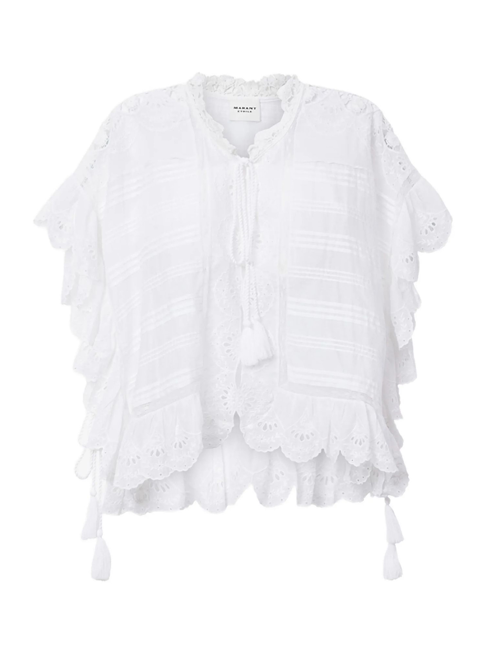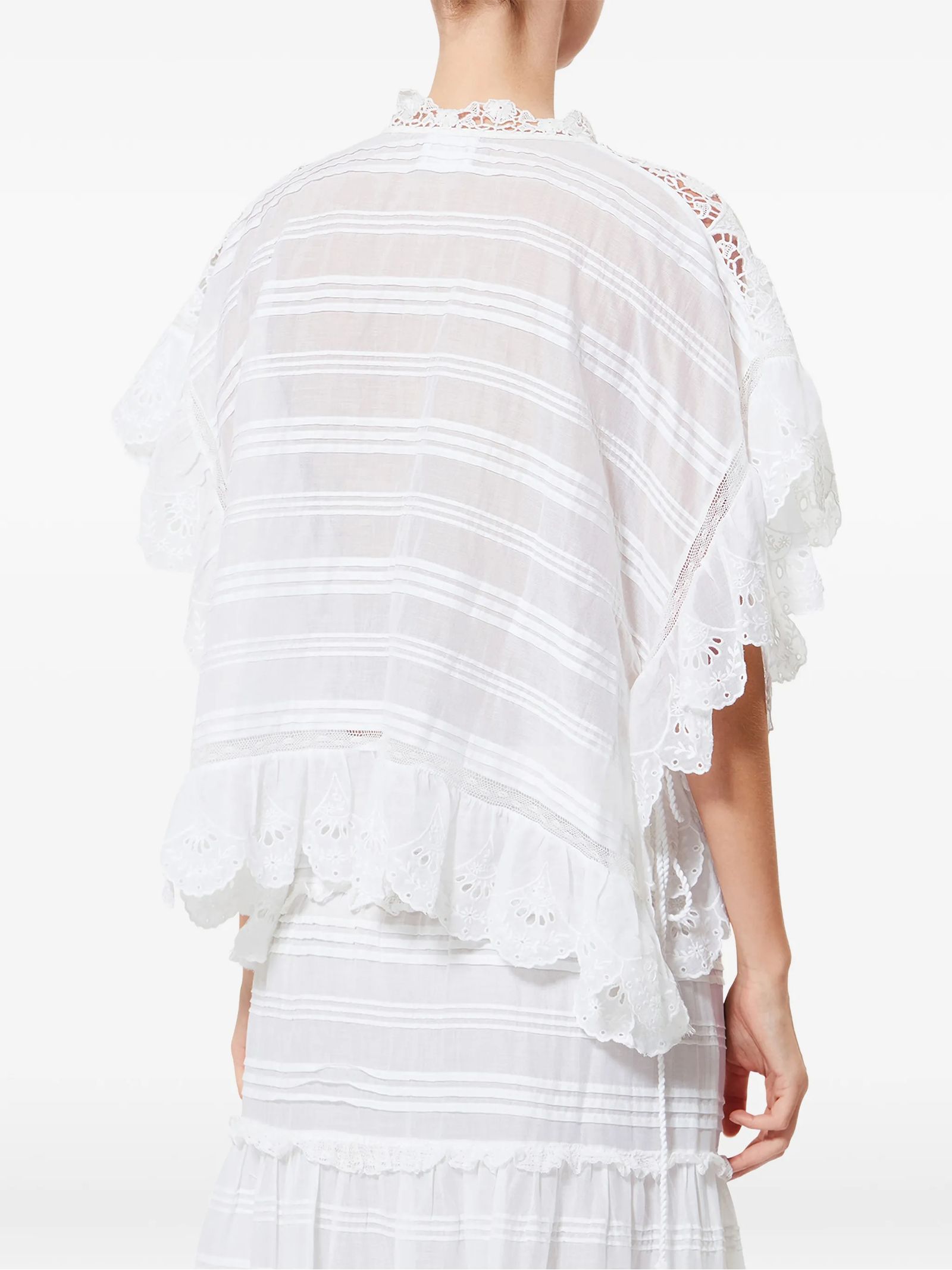 Maglia in stile caftano in cotone biologico e pizzo floreale, Scollo rotondo con cordini da annodare, Dettagli con sangallo e nervature, Maniche corte con volant, Serie di volant e cordini laterali, Taglio svasato