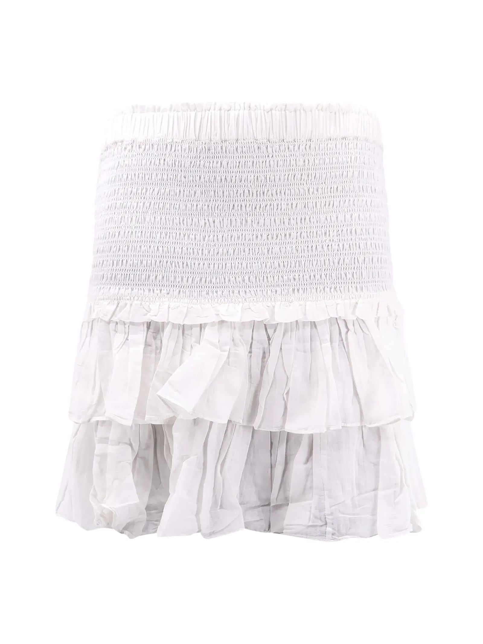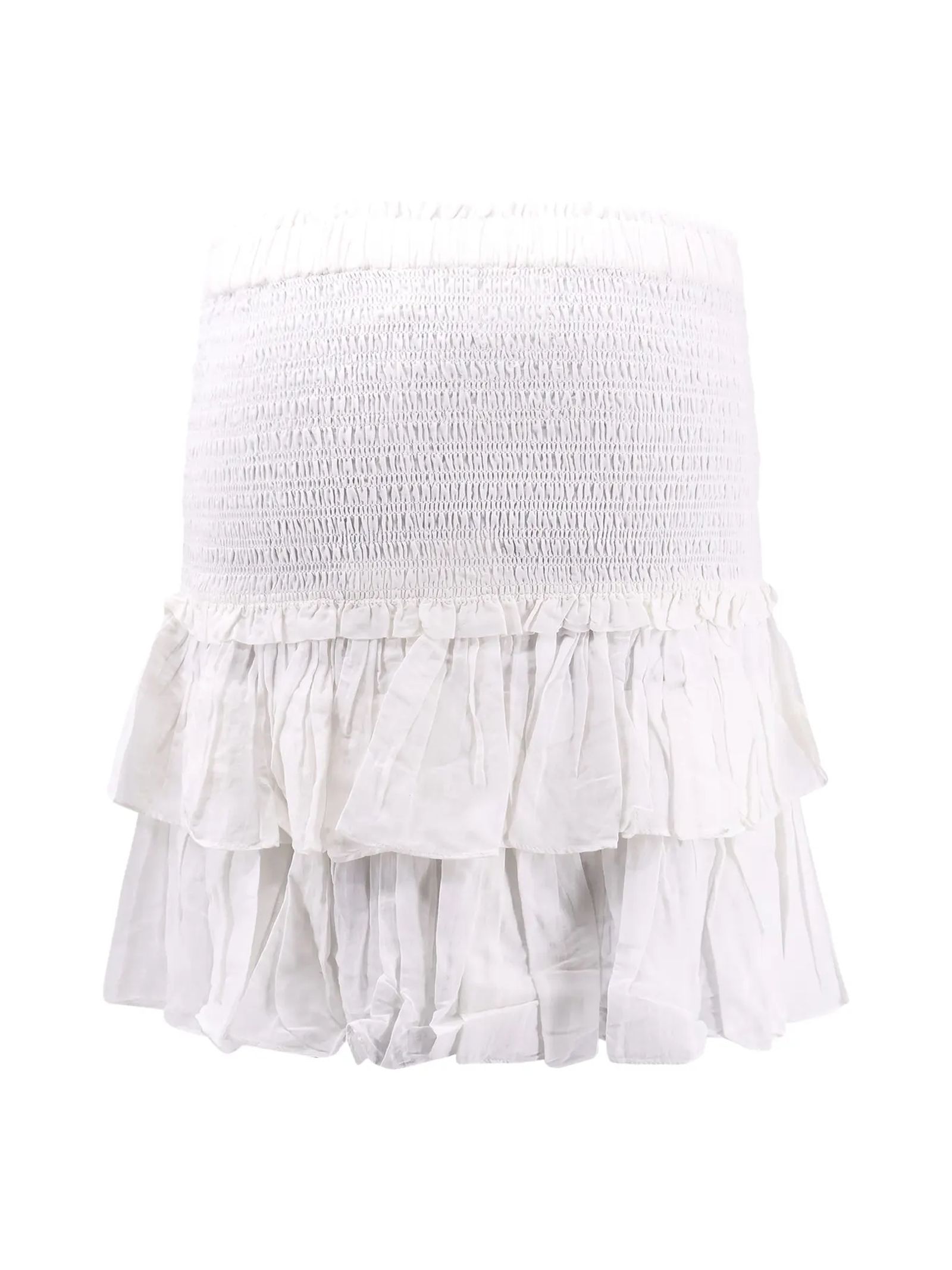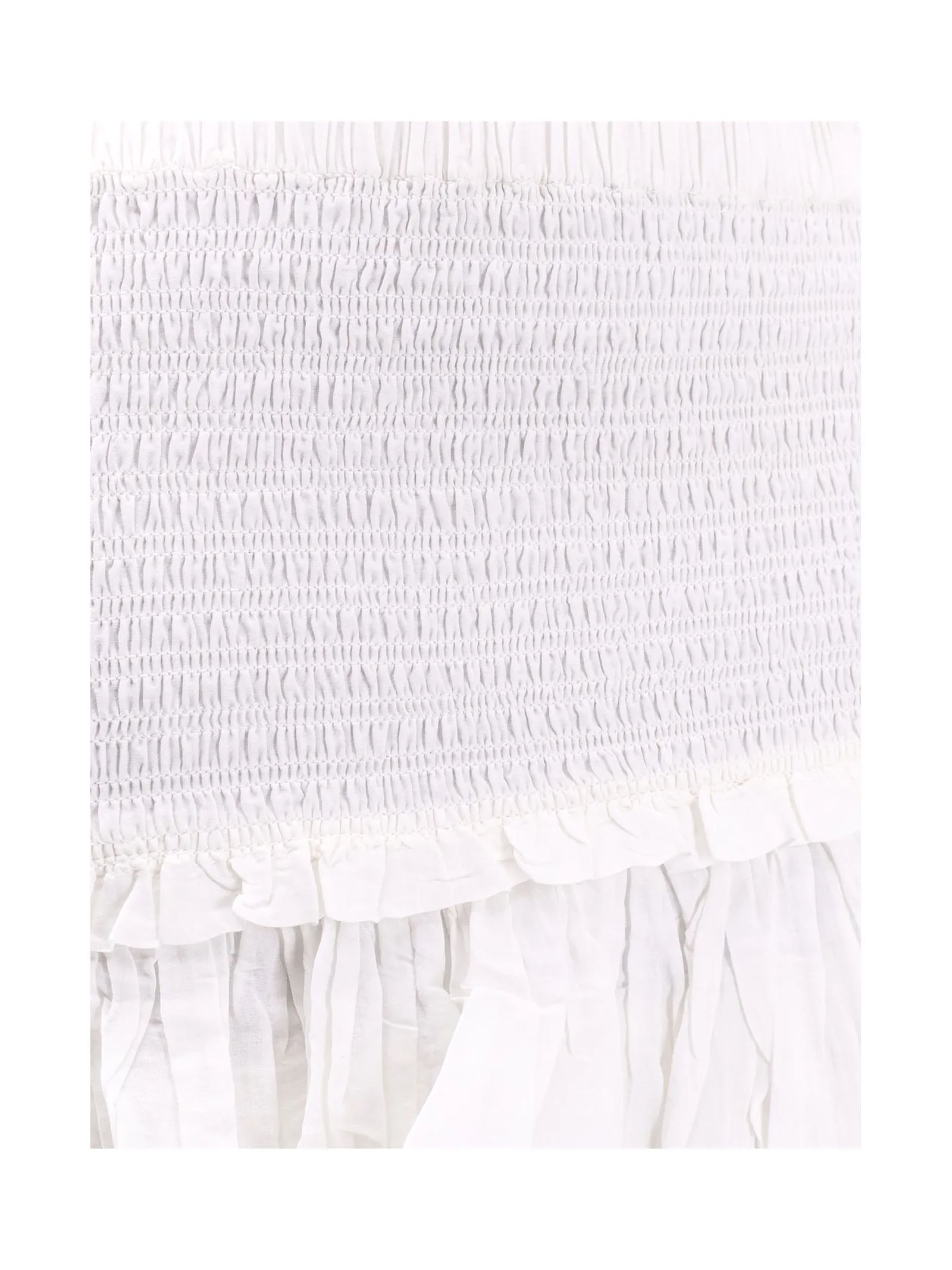 Minigonna Naomi con ruches misto cotone bianco, vita arricciata con elastico, dettagli con ruches, gonna con balzeorlo increspato, lunghezza sopra il ginocchio