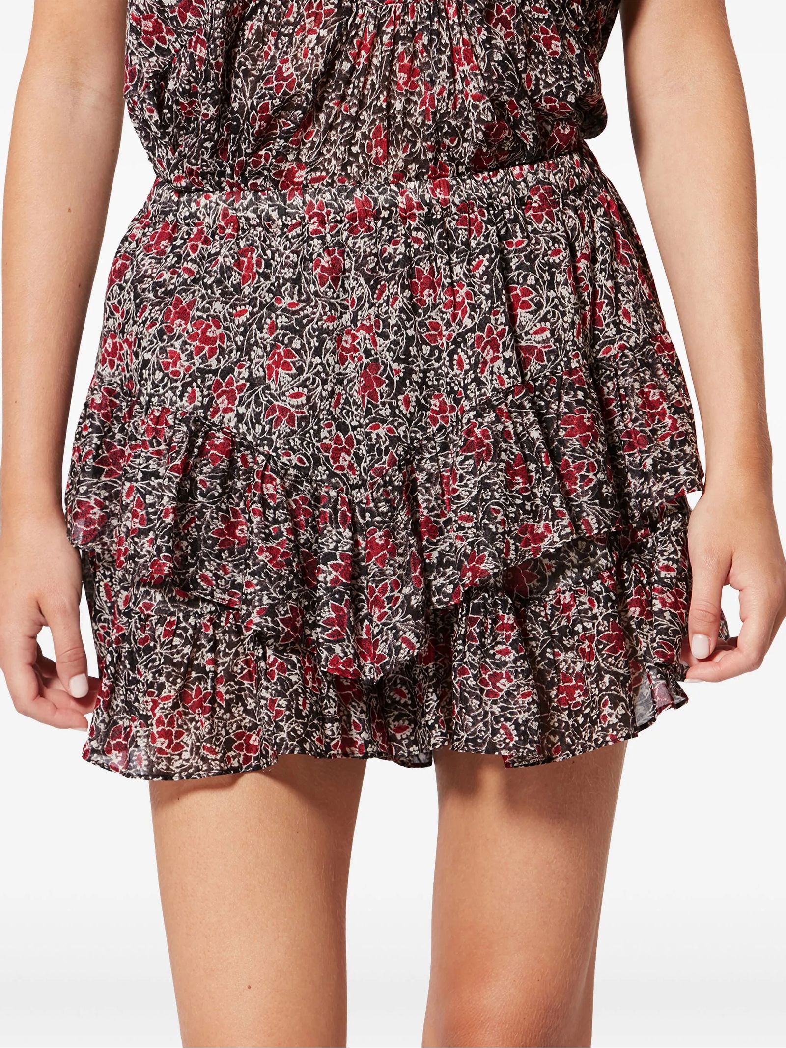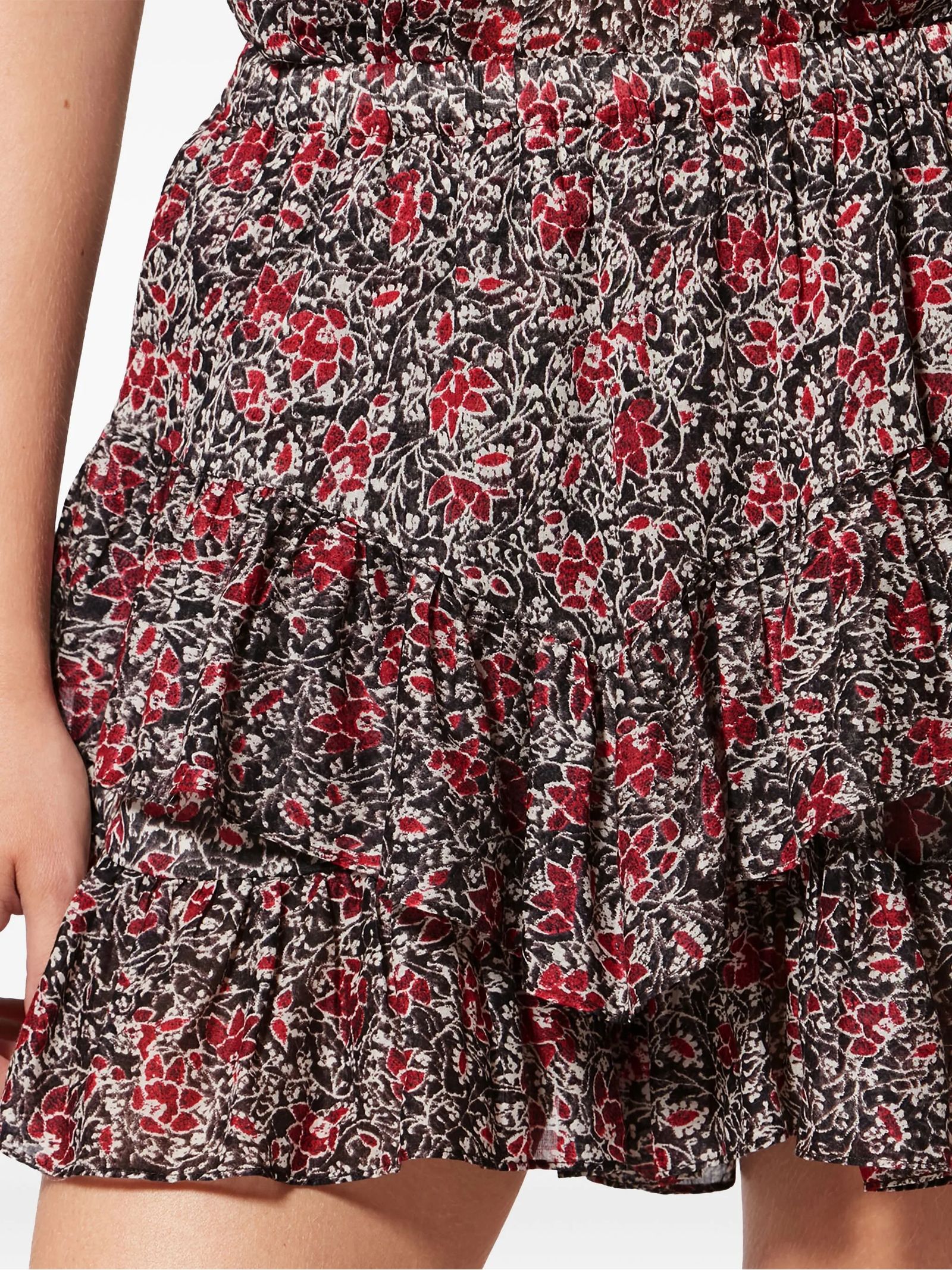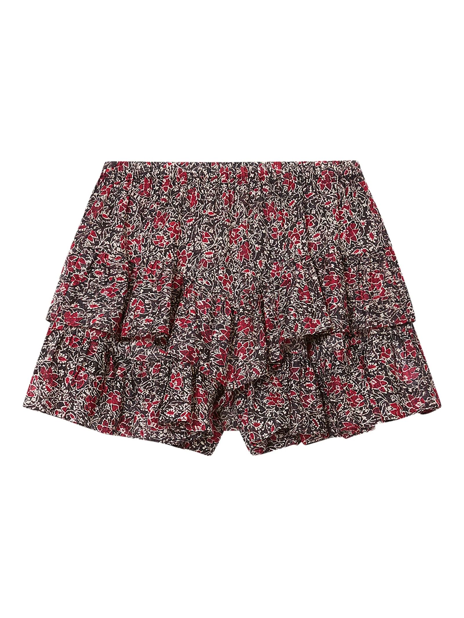 Shorts fluidi in voile di cotone biologico con stampa floreale, cintura di rifinitura elasticizzata, Serie di volant, Taglio svasato e lunghezza asimmetrica