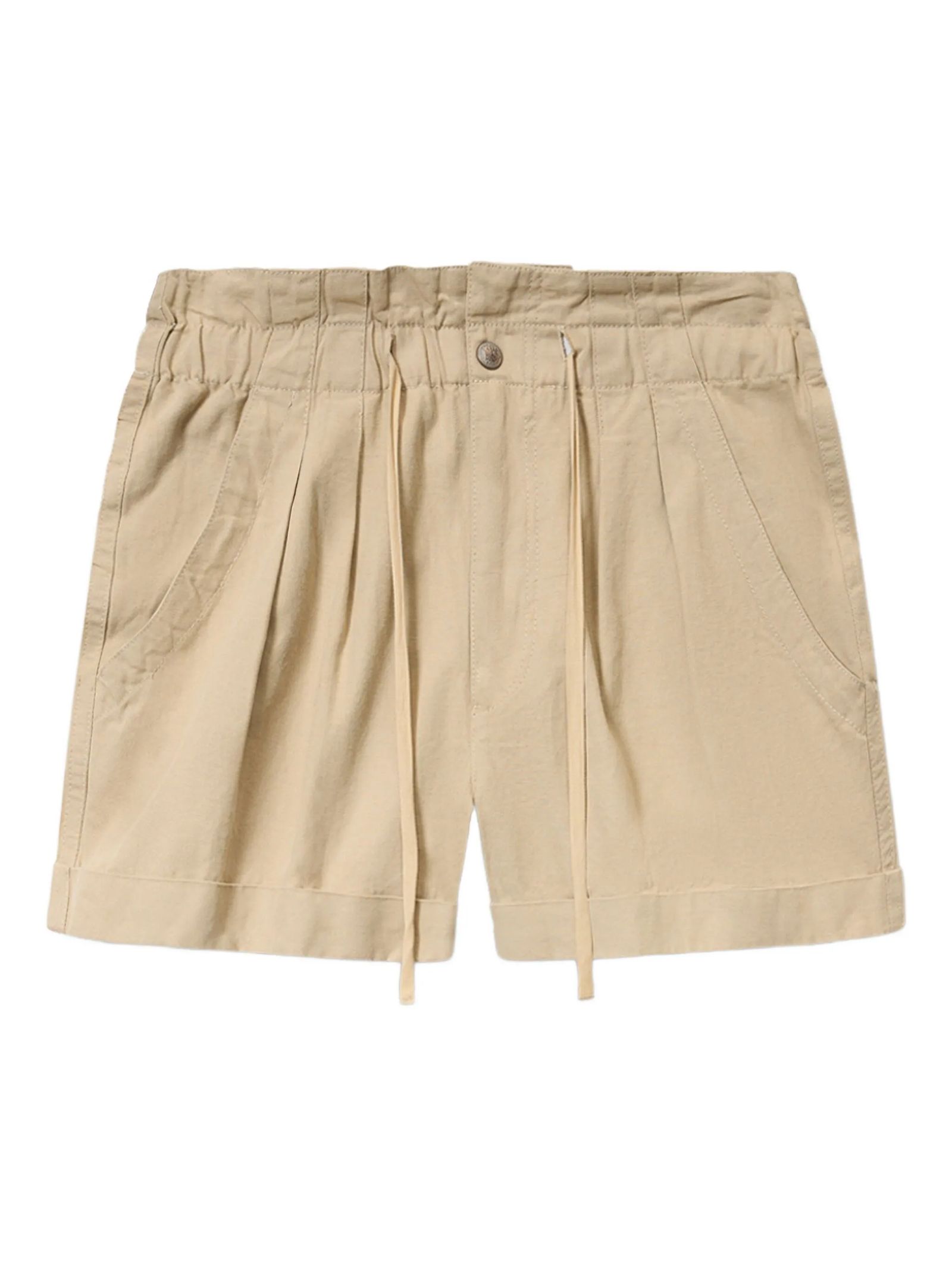 Shorts Nirma beige, orlo con risvolto, chiusura con coulisse, tasche oblique laterali, dettagli plissettati, vita elasticizzata