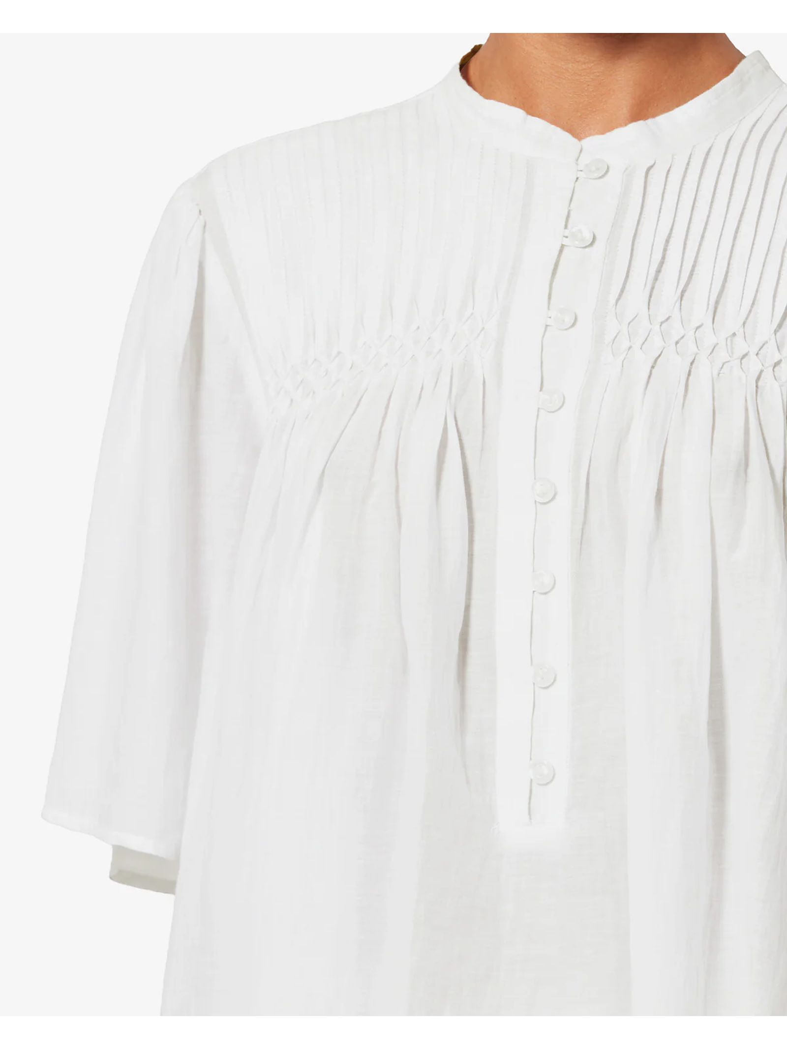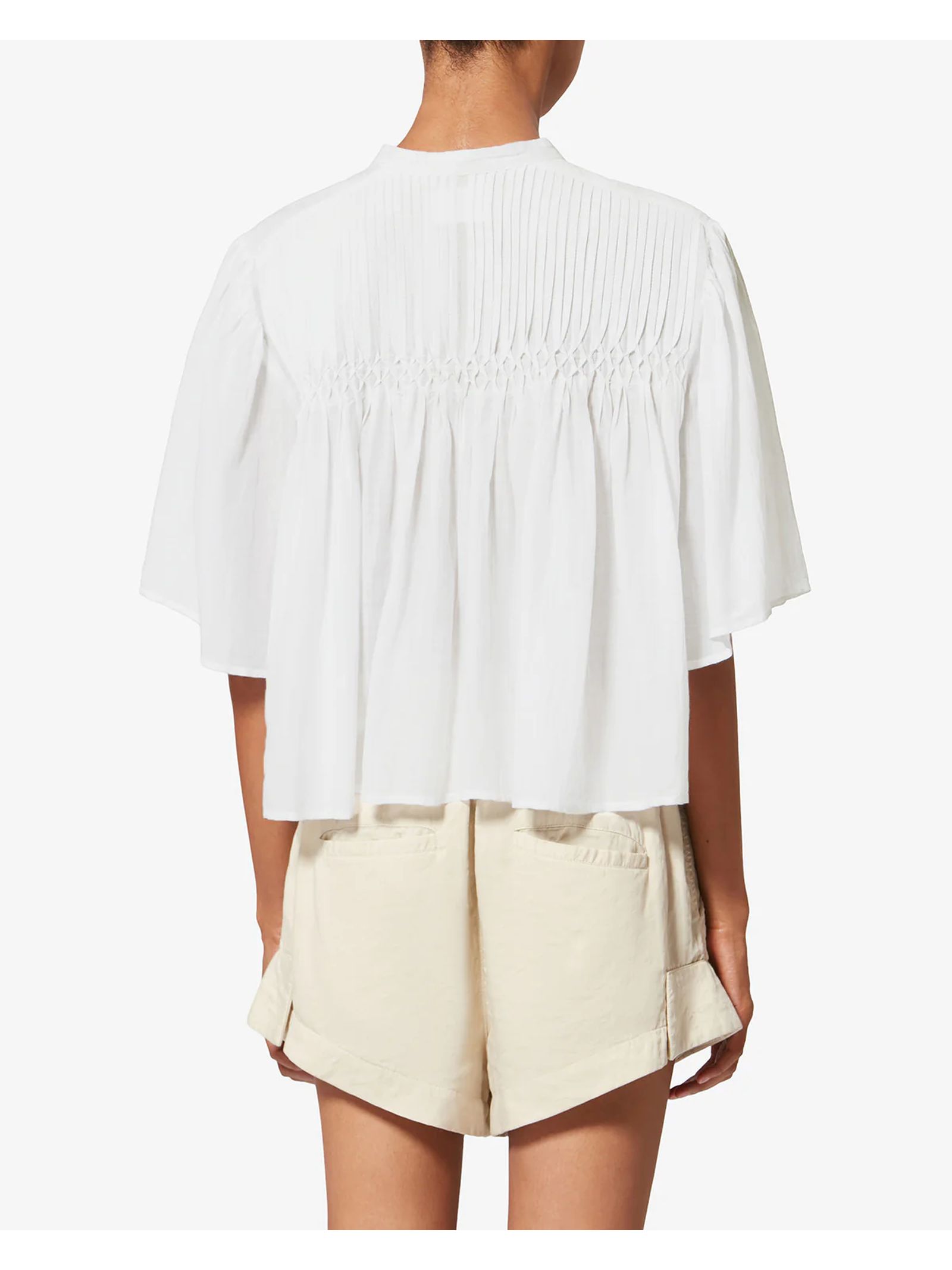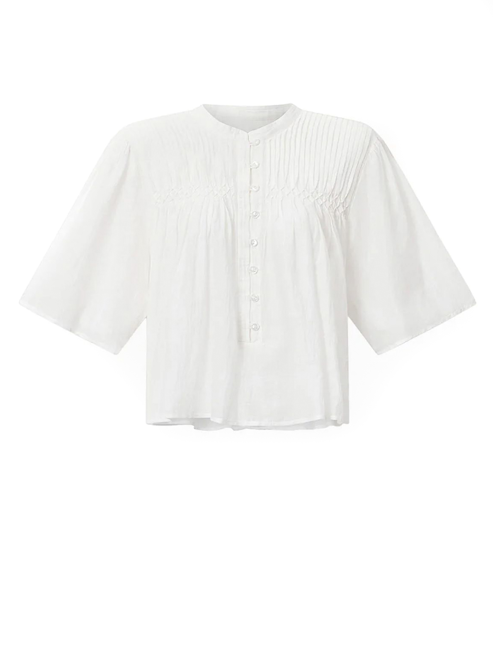 Top a punto smock in voile di cotone a tinta unita, Scollo tondo, Chiusura con bottoni, Dettagli plissettati e a punto smock, Maniche corte svasate, Taglio ampio
