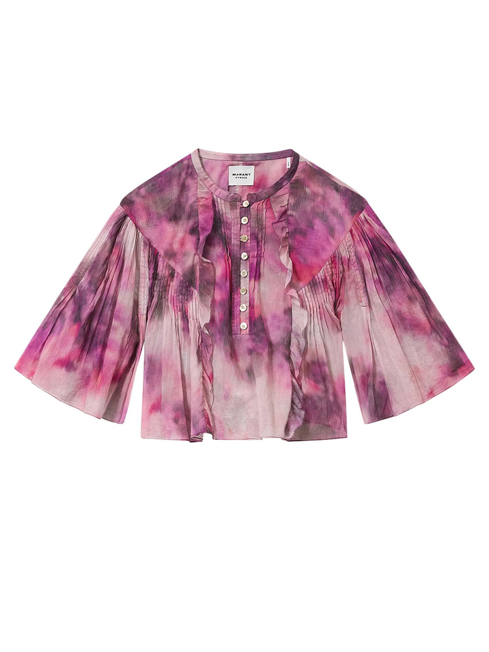 Maglia vaporosa con stampa a nuvola in cotone biologico, Scollo serafino con abbottonatura e pannello plissettato, Maniche lunghe a 3/4, Serie di volant con finitura ricamata, Taglio svasato