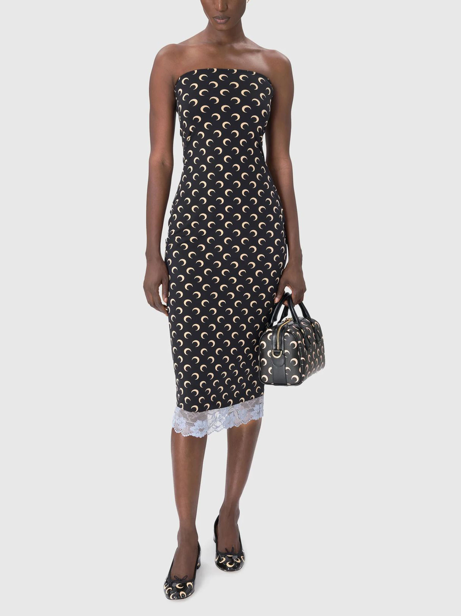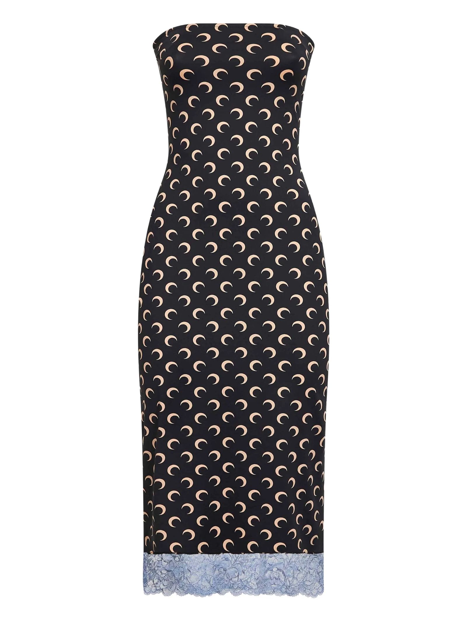 Abito bustier in jersey riciclato Moon, stampa Moon su tutta la superficie, fascia elastica con nastro antiscivolo all'interno, orlo in pizzo elastico