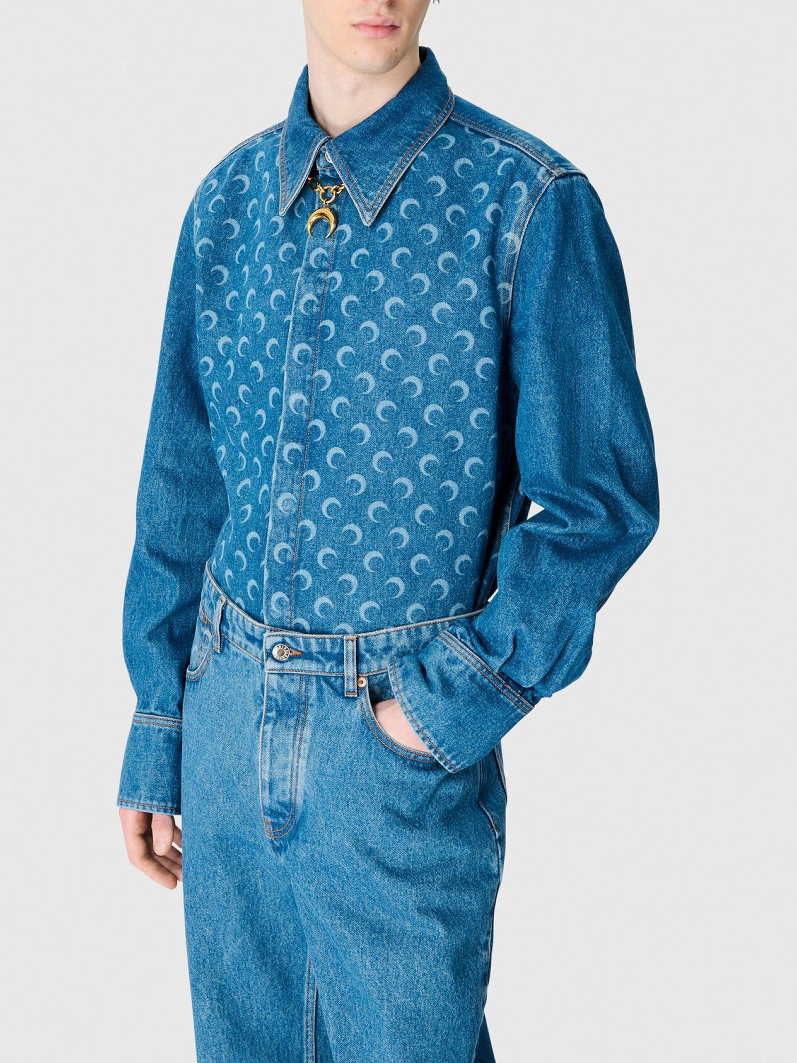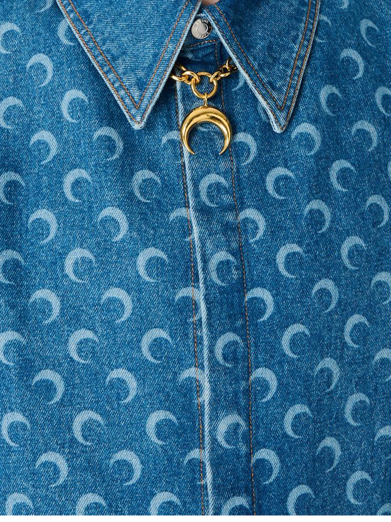 Camicia Denim Ls Moon Laser Blu Lavaggio, abbottonatura frontale, polsini con bottoni, stampa a forma di luna su tutta la superficie, toppa in pelle