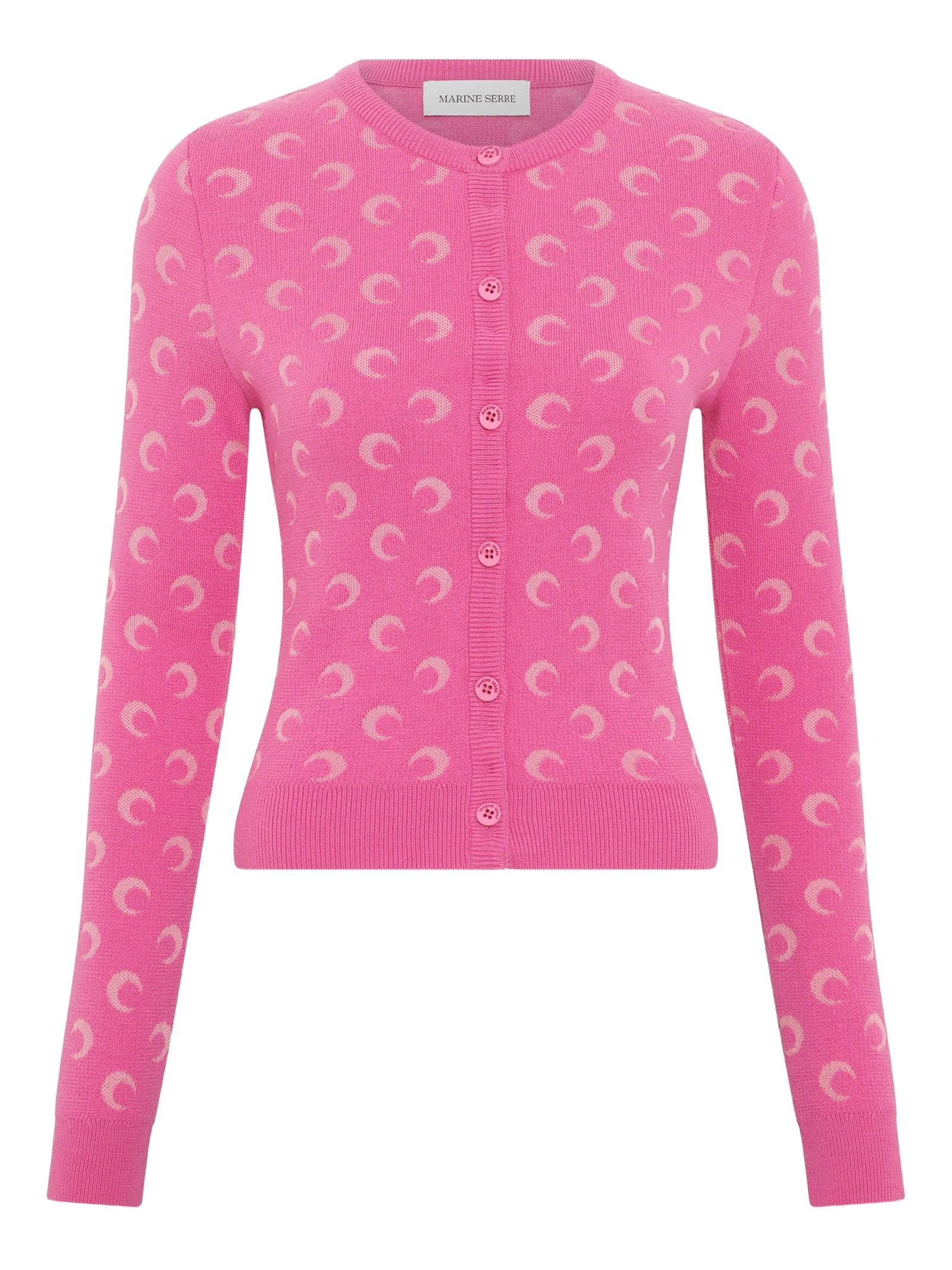 Cardigan aderente in maglia jacquard con motivo lunare, scollo a costine, chiusura frontale con 6 bottoni incisi, maniche e bordi inferiori a costine, punto jacquard con motivo lunare su tutta la superficie, logo lunare jacquard