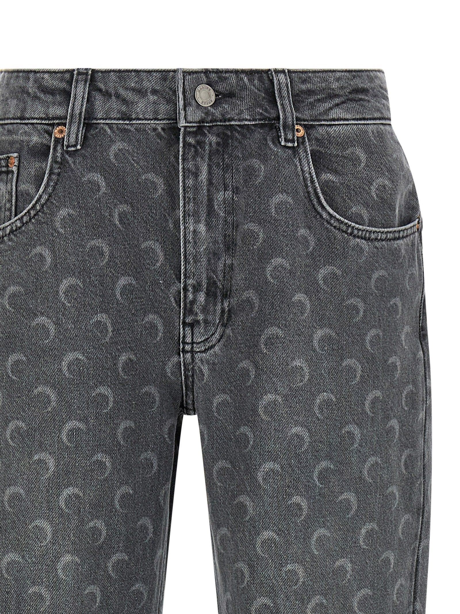 Jeans dritti in denim grigio lavato con stampa laser a forma di luna, chiusura con cerniera e bottone, cinque tasche, passanti per cintura, stampa laser a forma di luna su tutta la superficie, tasche anteriori in twill di cotone, toppa in pelle serre blu navy.