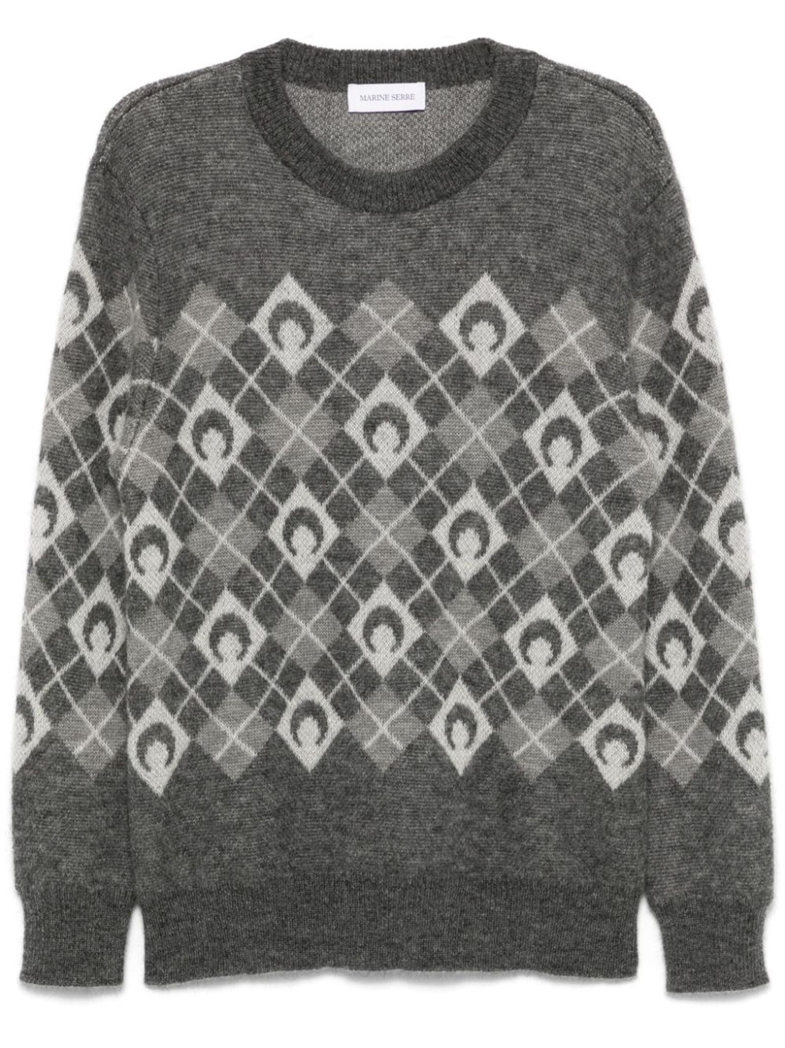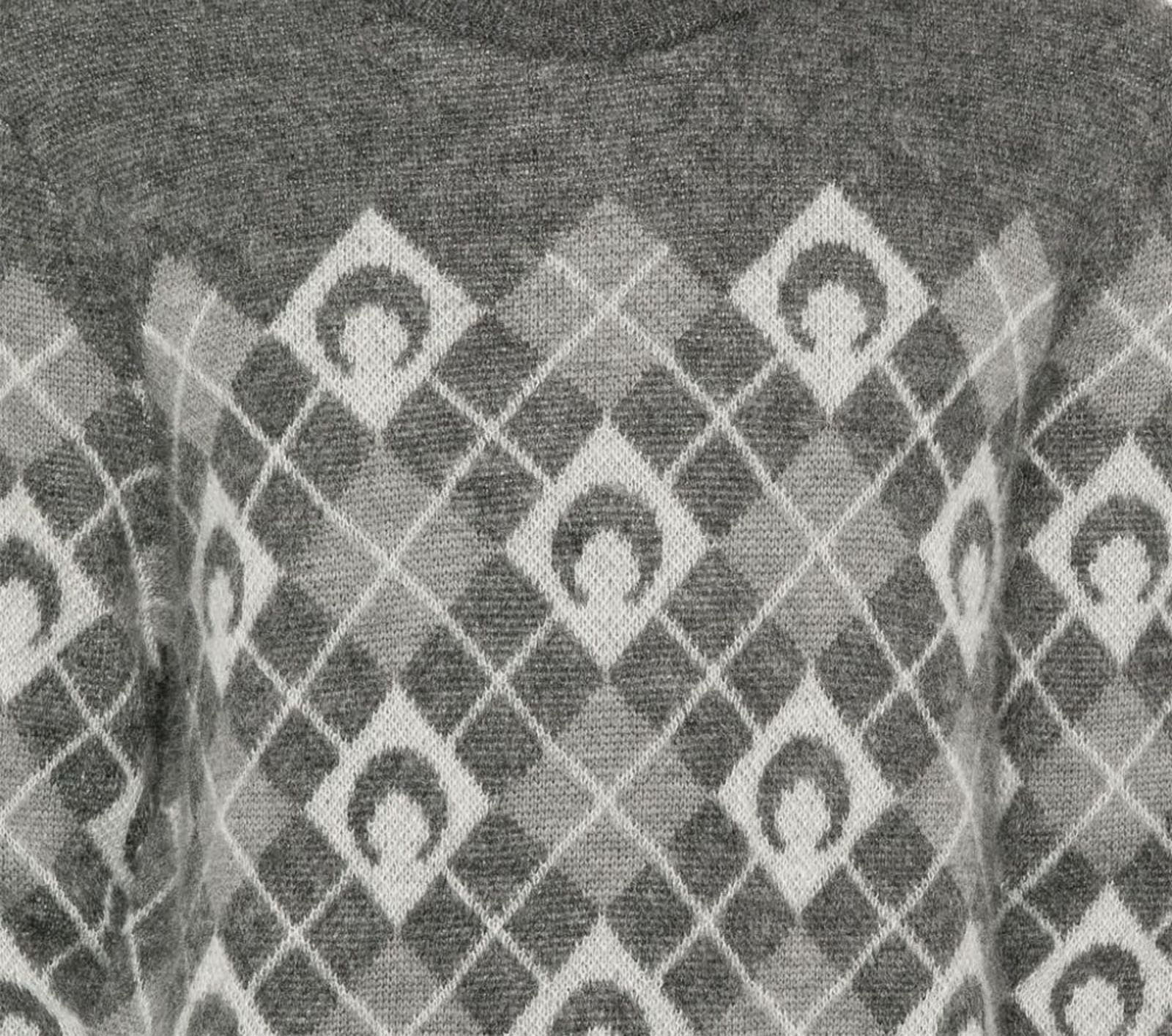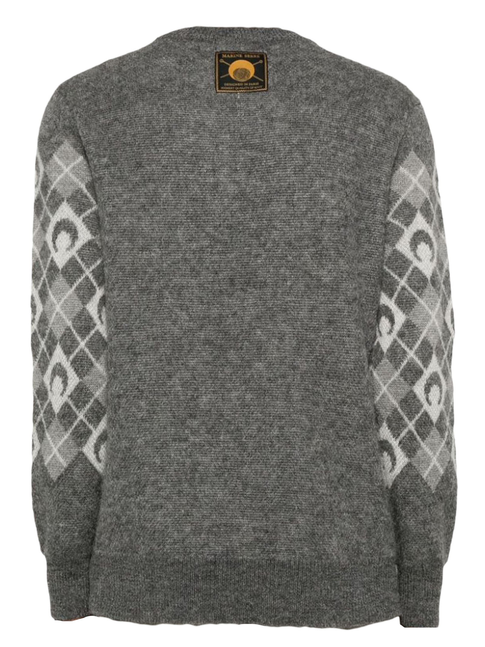 Maglione in misto mohair grigio, maglia con intarsio a rombi, finitura spazzolata, girocollo, maniche lunghe, T-shirt con ricamo Crescent Moon, applicazione posteriore con logo, orlo dritto