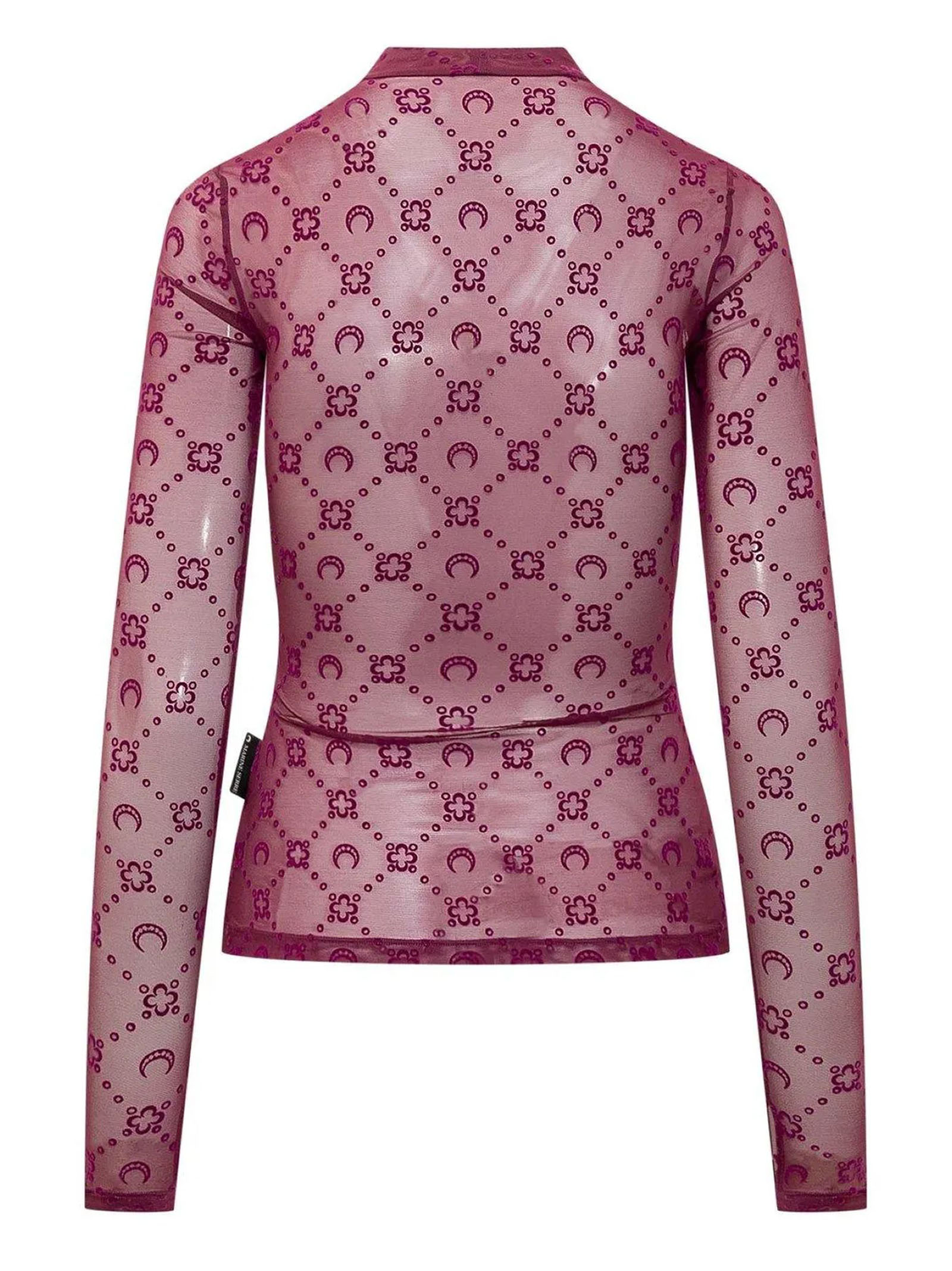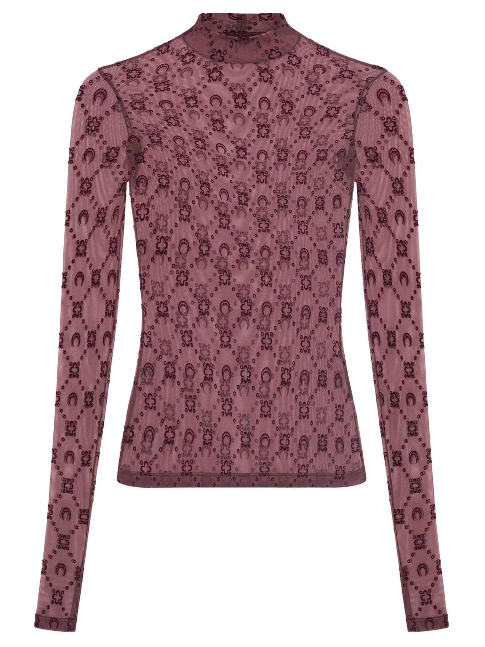 Top riciclato in maglia floccata Second Skin con collo alto, motivo Moonogram floccato su tutta la superficie, maniche extra lunghe con fori per i pollici, etichetta con marchio tessuta sulla cucitura laterale sinistra.