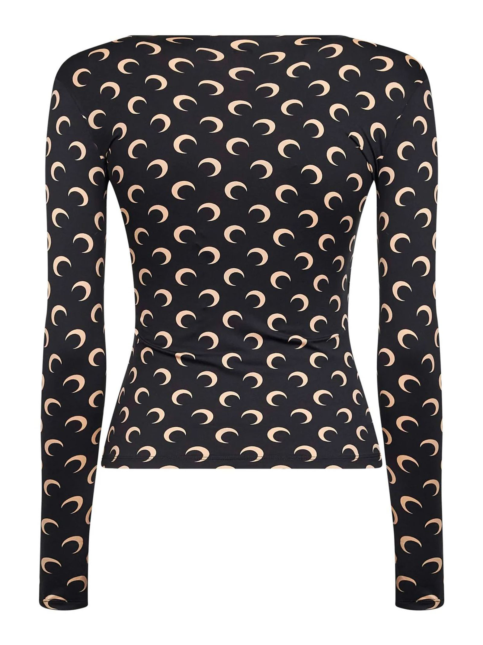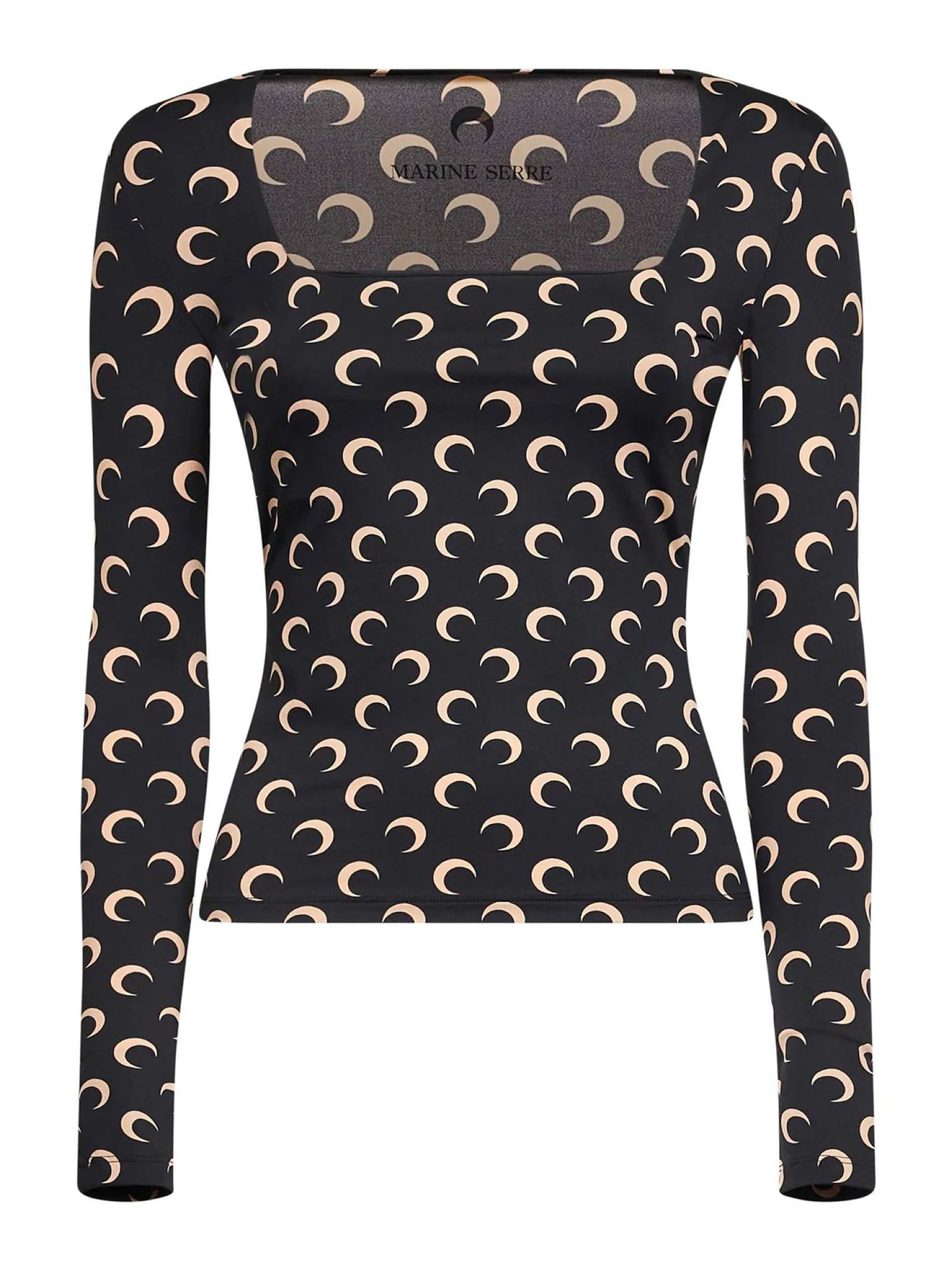 Top in tessuto elasticizzato Moon Printed Jersey Second Skin, nero e beige, maniche lunghe, scollo quadrato