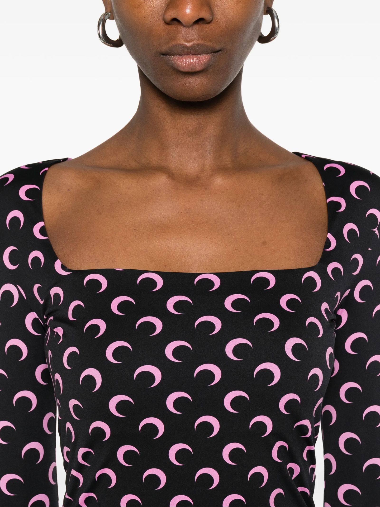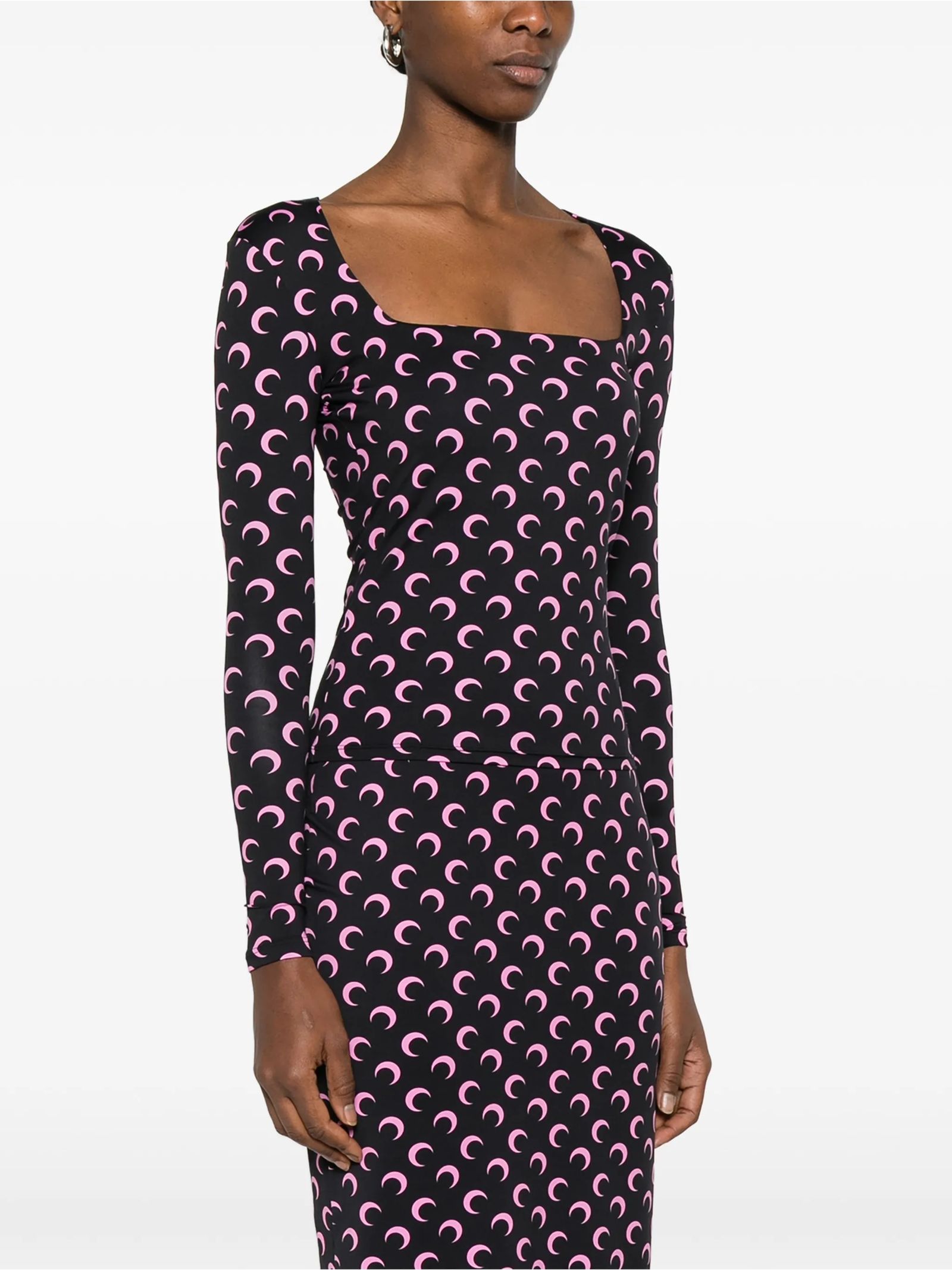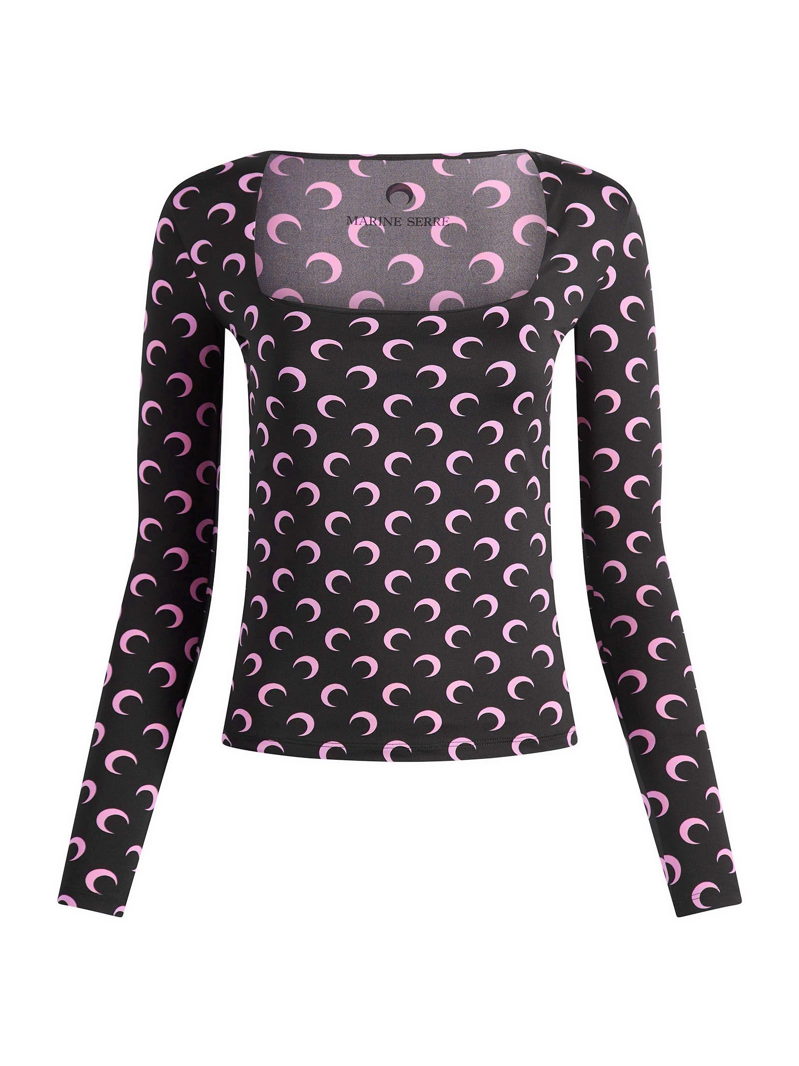 Top in tessuto elasticizzato Moon Printed Jersey Second Skin, nero e rosa, maniche lunghe, scollo quadrato