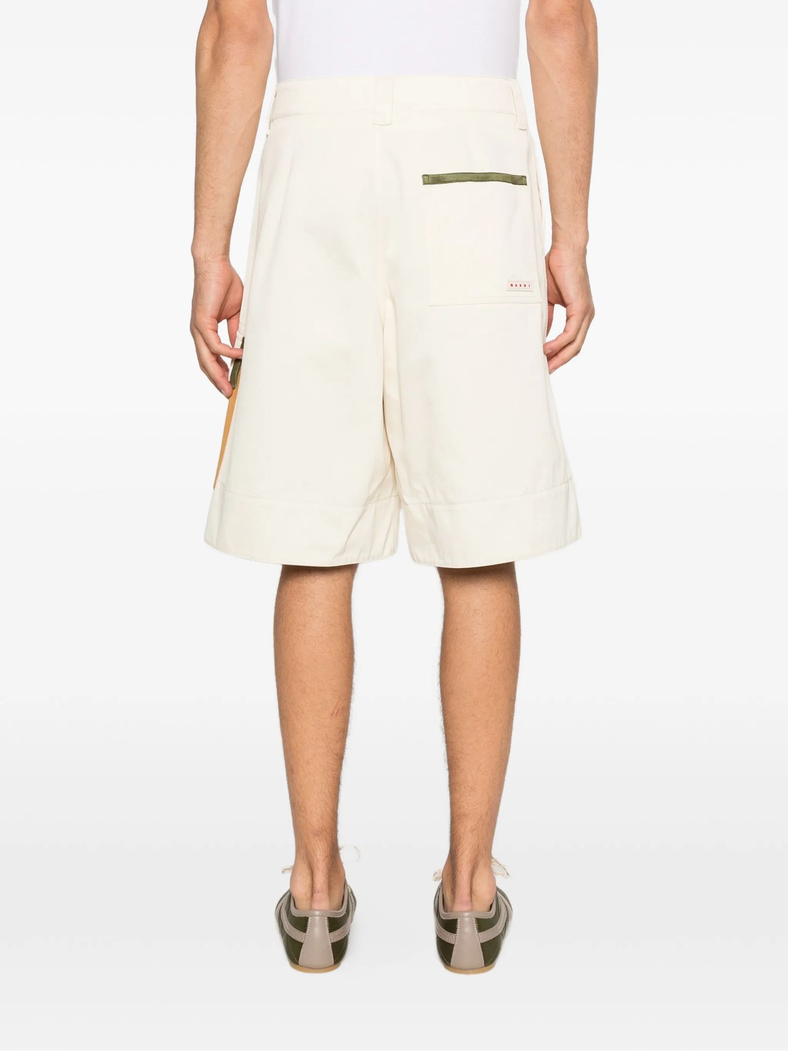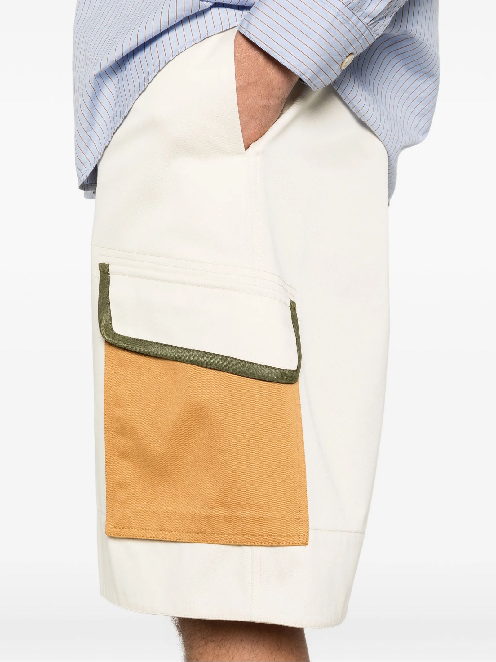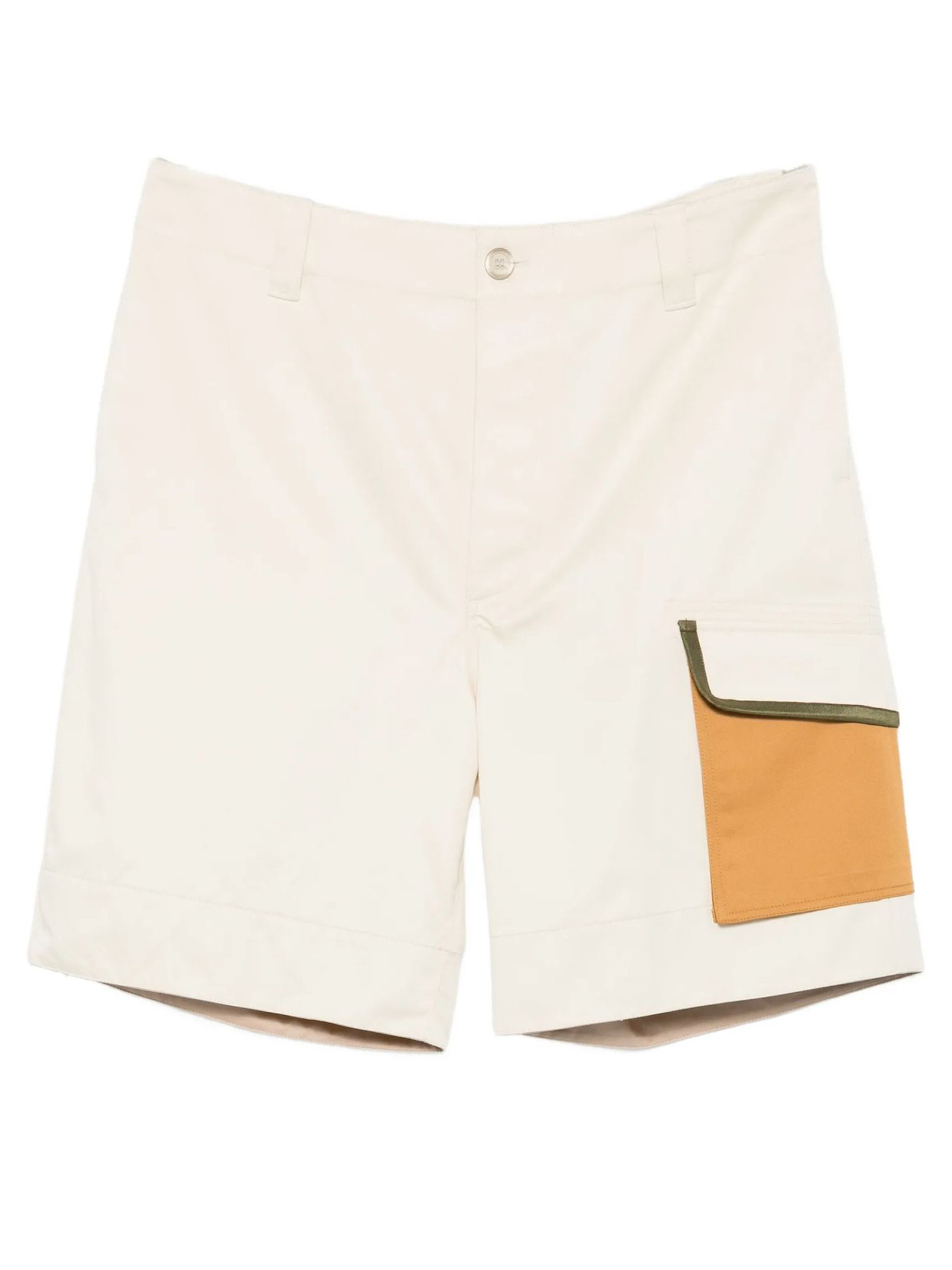 Bermuda cargo in cotone beige con passanti per cintura, design con abbottonatura, tascaa laterale con patta