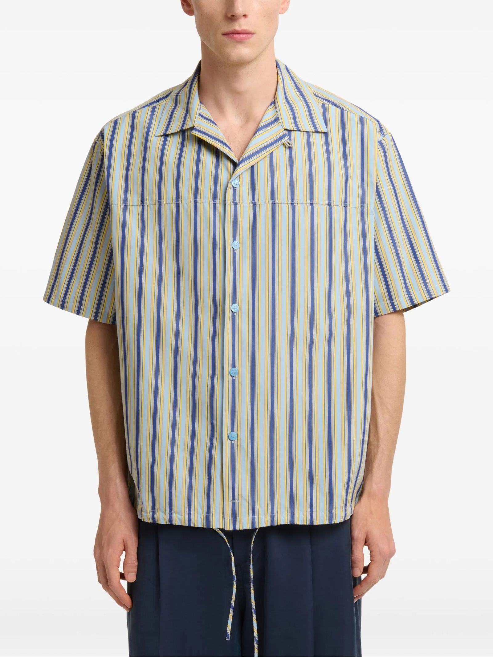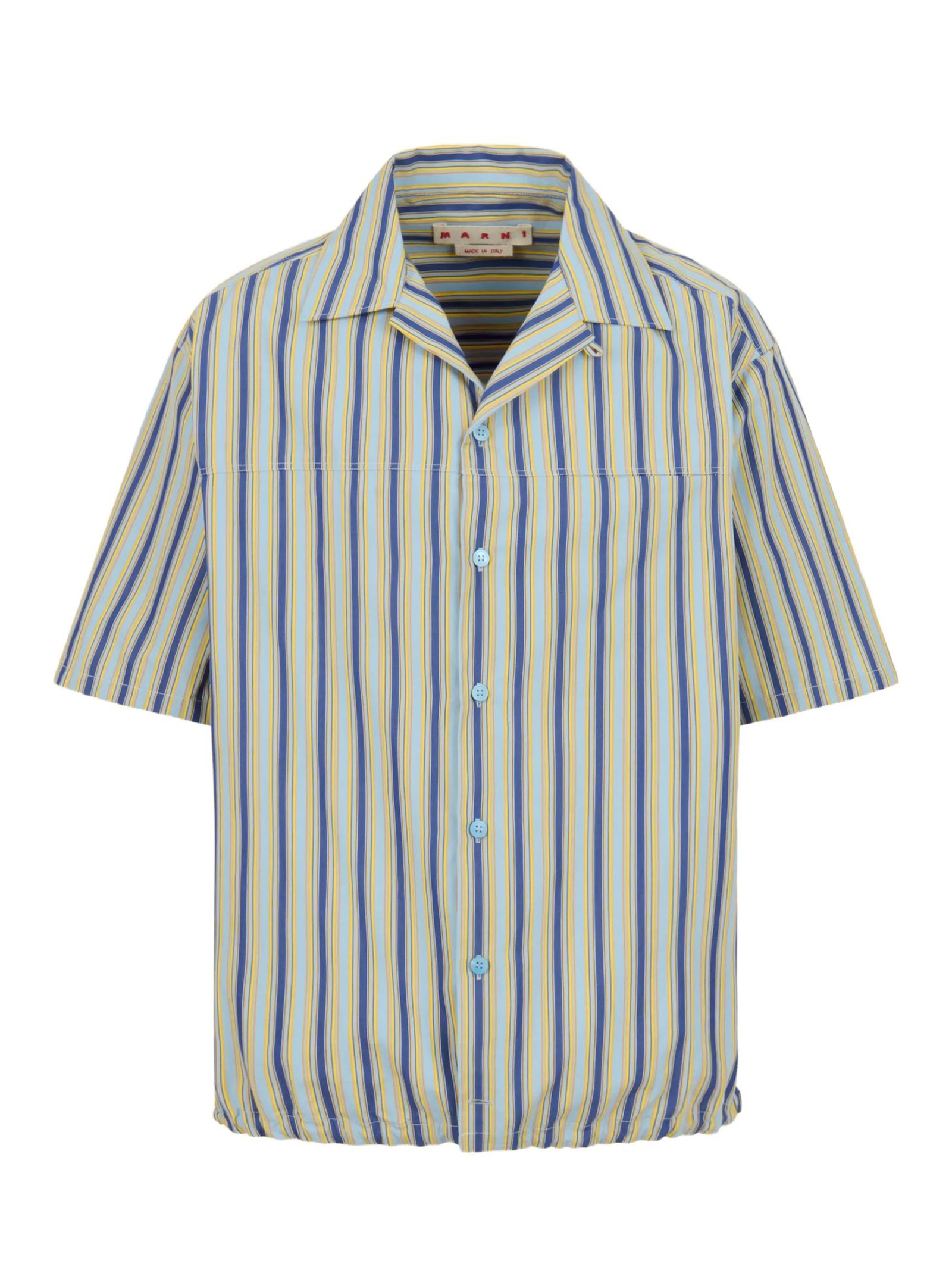 Camicia a righe in cotone azzurro, silhouette squadrata, colletto alla cubana, tasca a filetto, orlo con coulisse, applicazione con logo