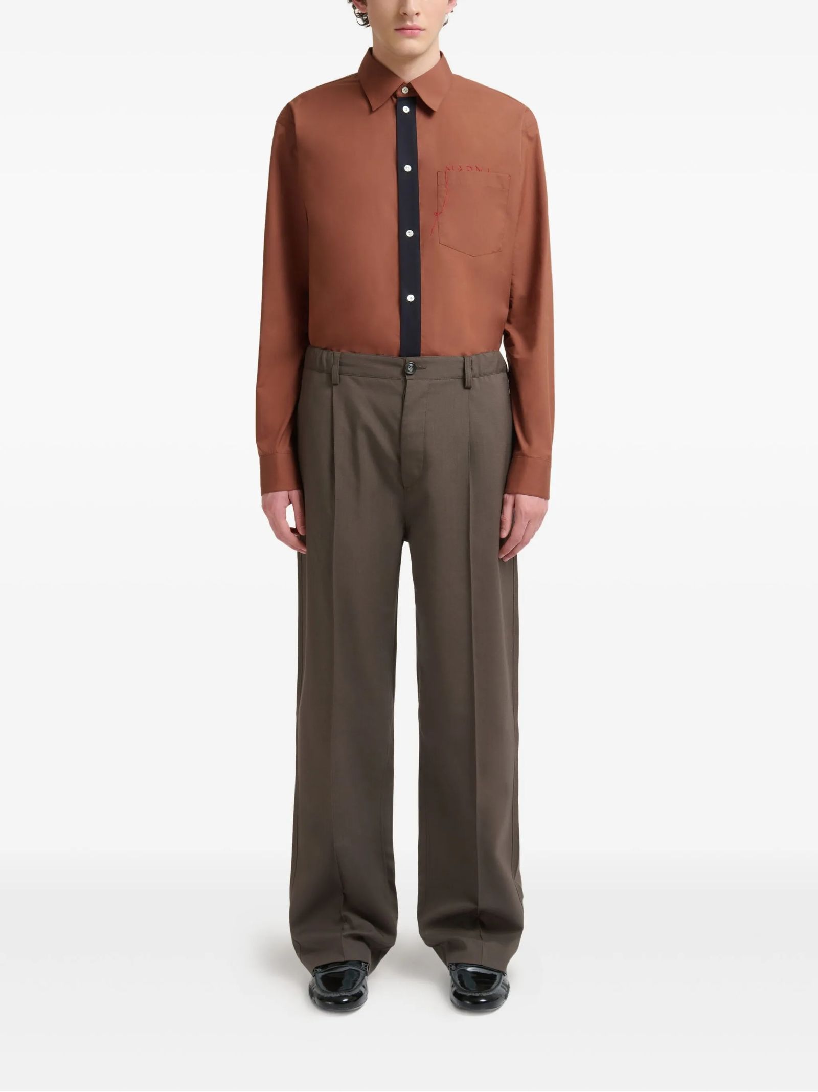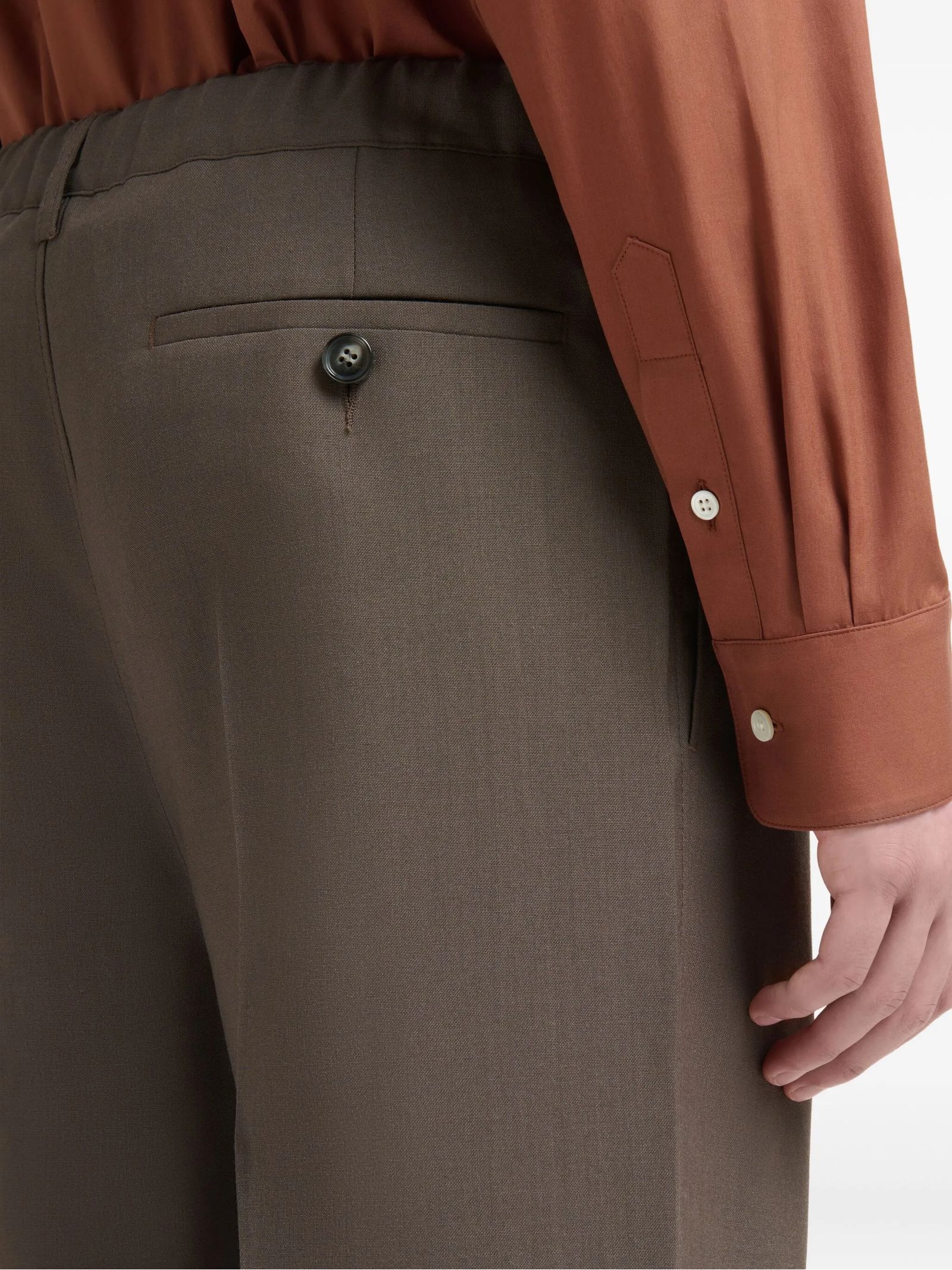 Pantaloni a gamba ampia in lana marrone, plissettatura, gamba ampia, vita elasticizzata, tasche laterali oblique, tasche a filetto, zip e bottoni