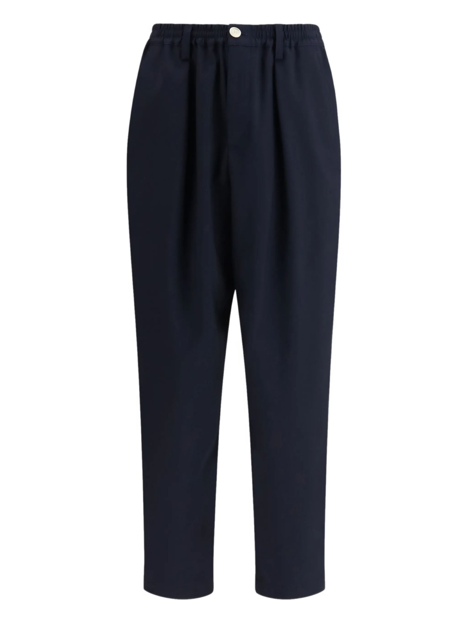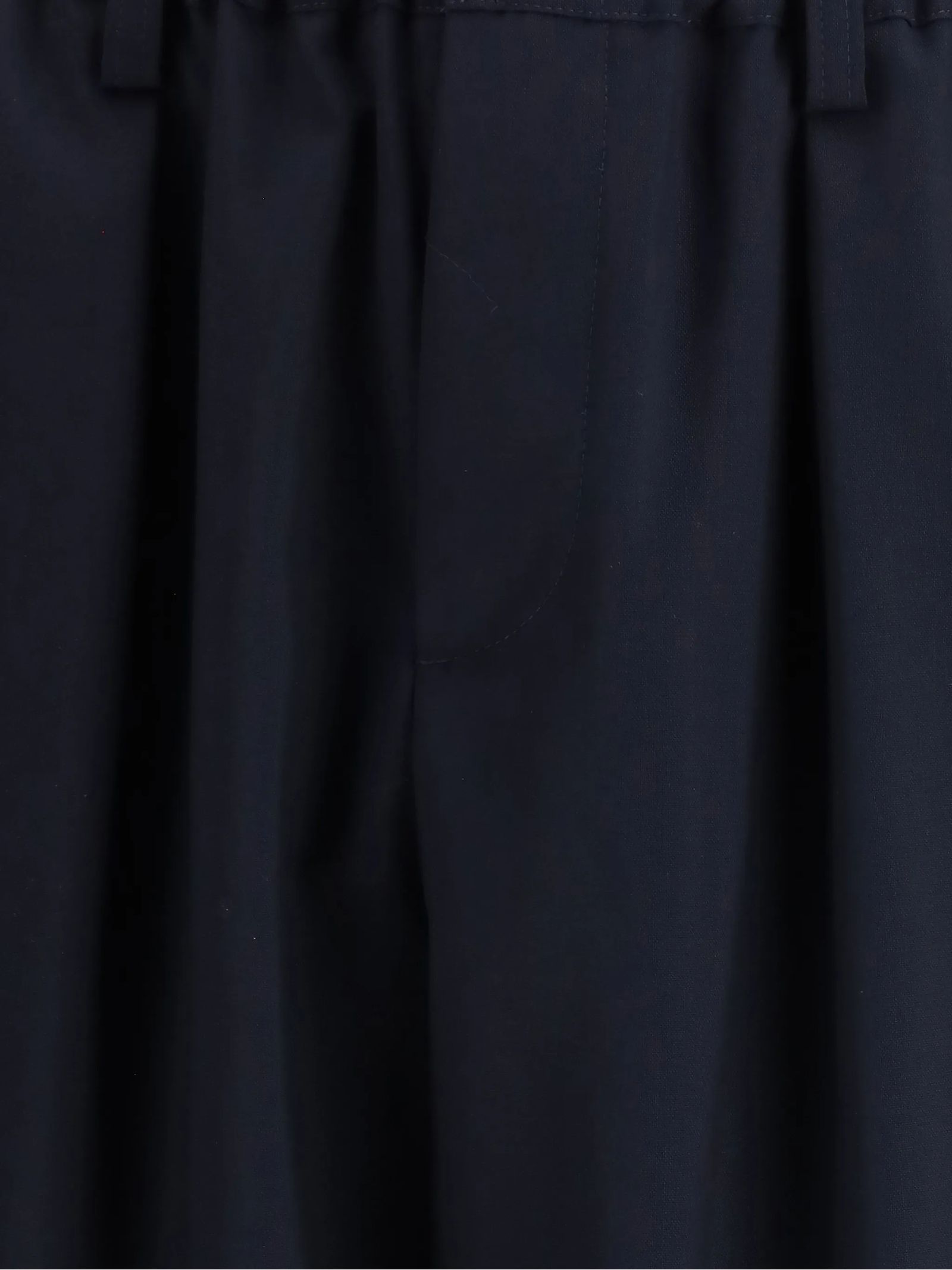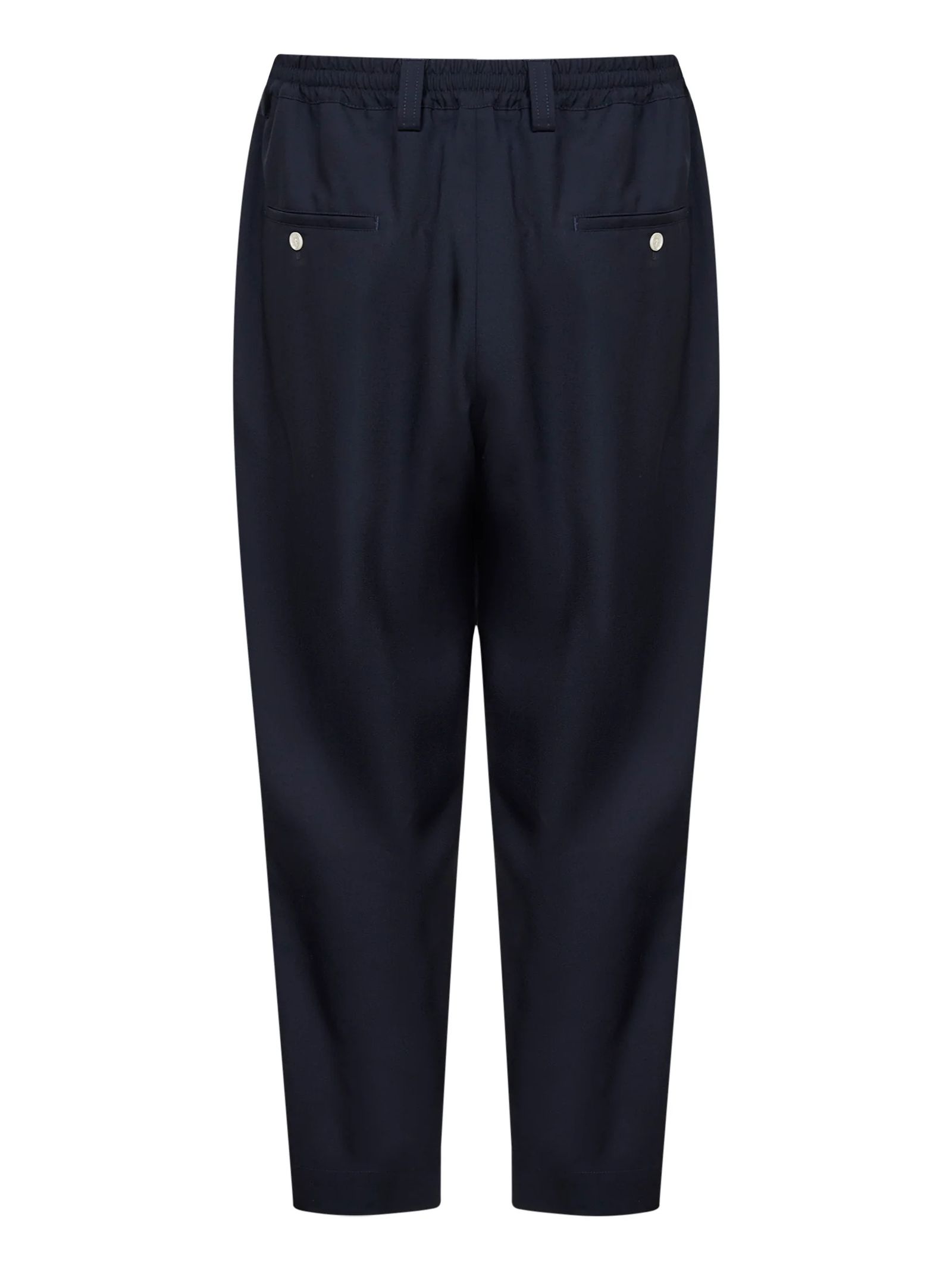Pantaloni in lana blu navy con pieghe, chiusura a bottoni, vita elasticizzata, pieghe, tasche posteriori a filetto