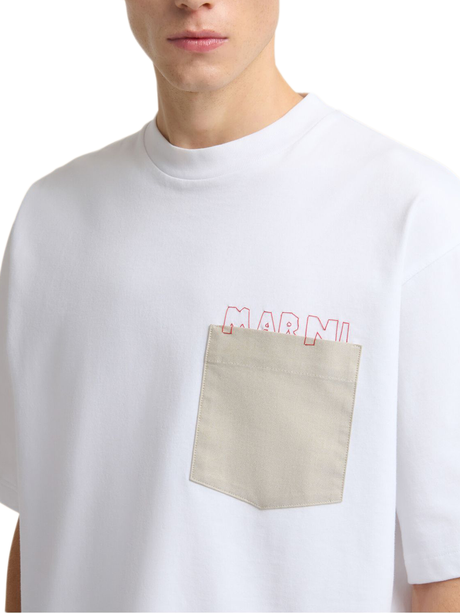 T-shirt in cotone bianco, vestibilità comoda, girocollo, tasca a contrasto con logo Marni visibile sulla parte superiore, maglia 100% cotone
