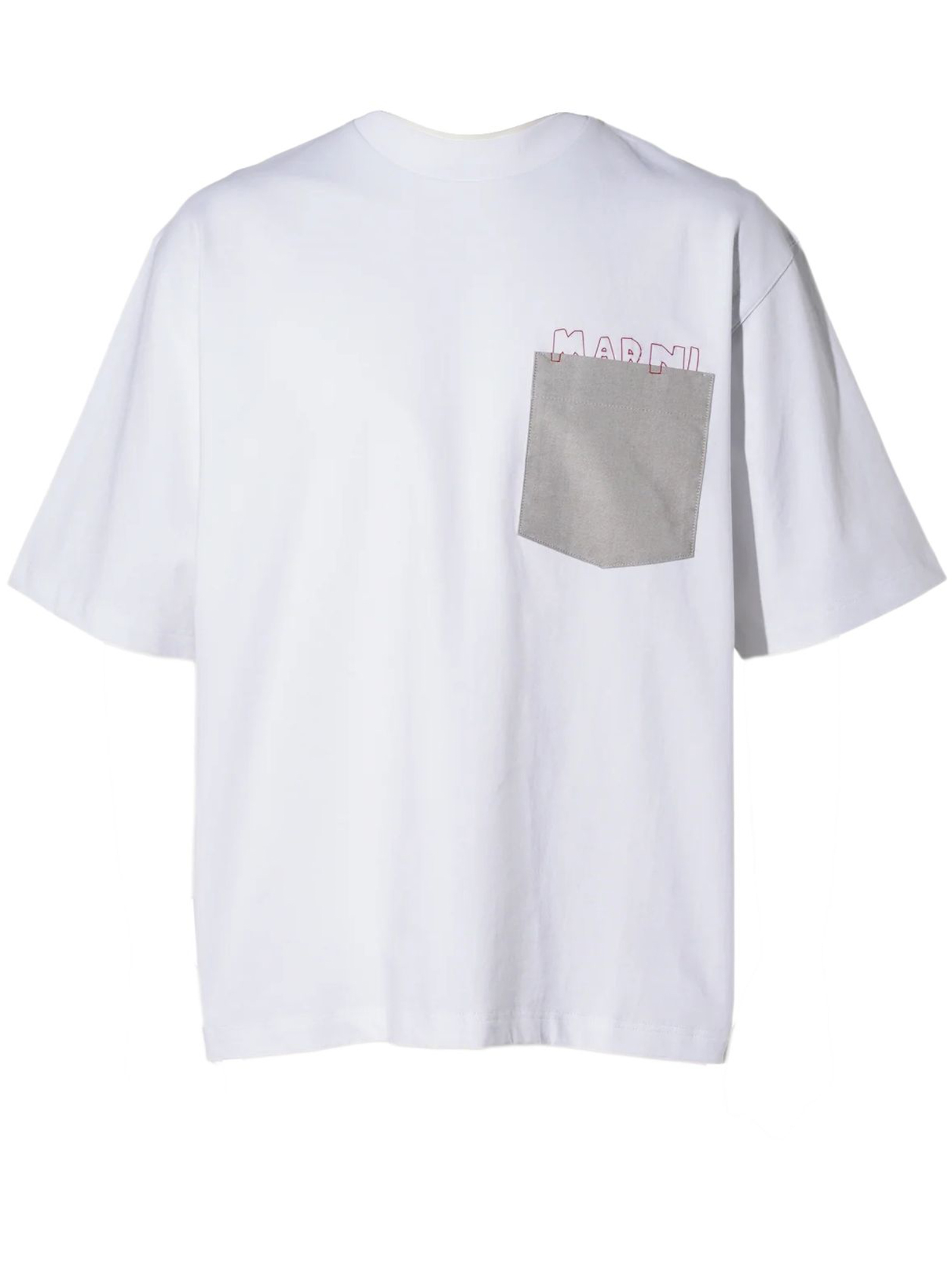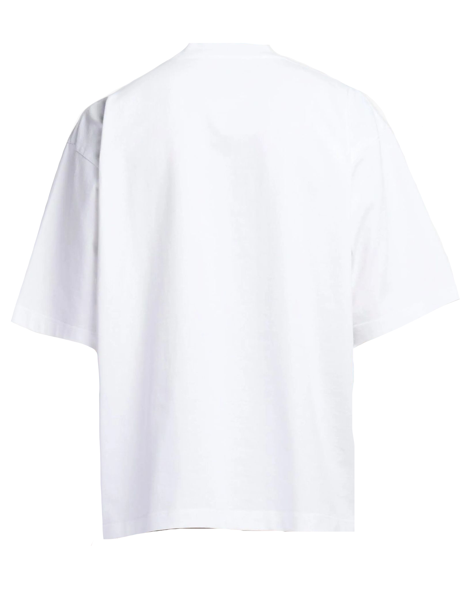 T-shirt in jersey bianco, stampa con logo sul davanti, spalle scese, maniche corte