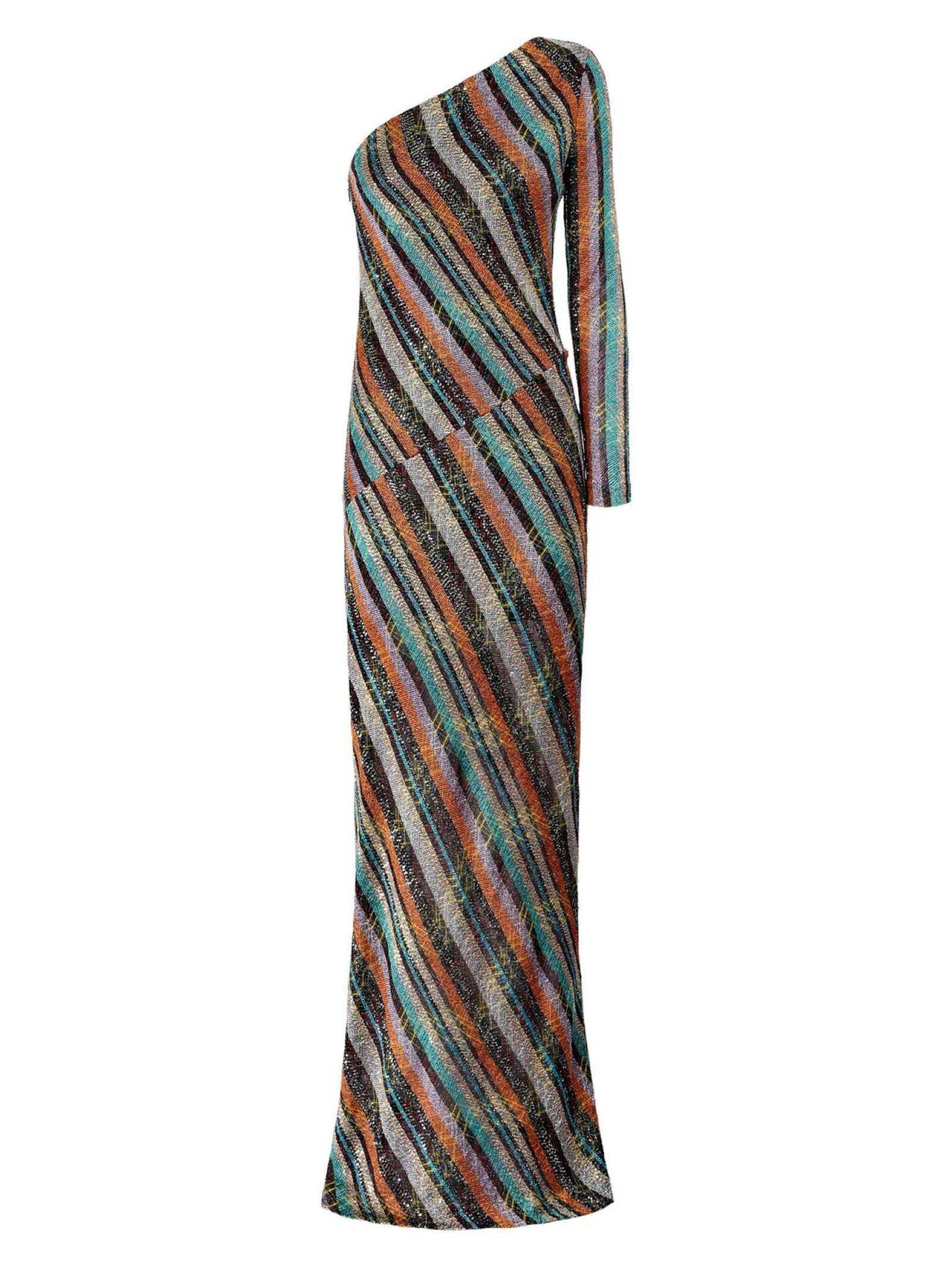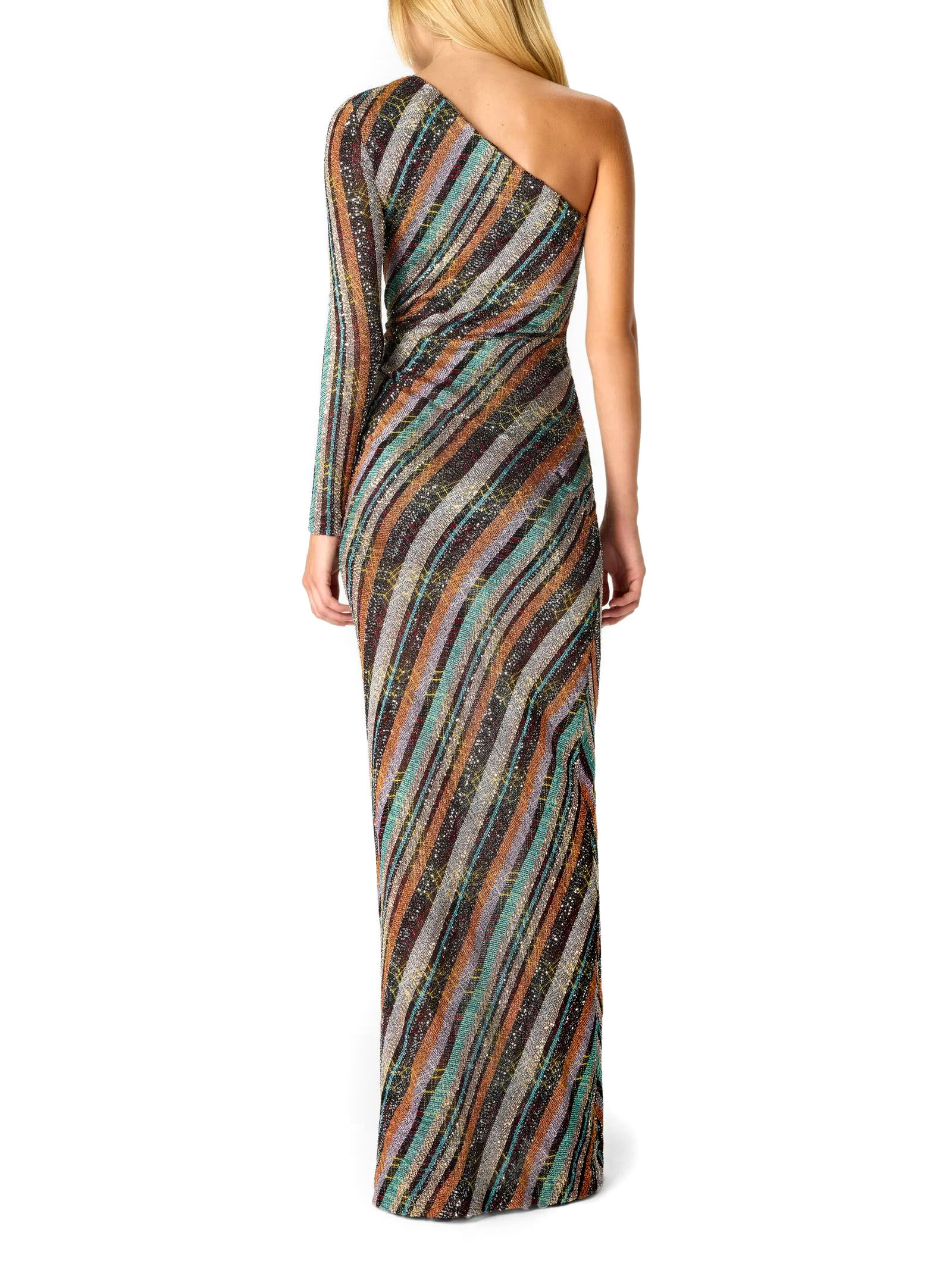 Abito lungo in maglia zig zag greca con paillettes, monospalla, multicolore, manica lunga