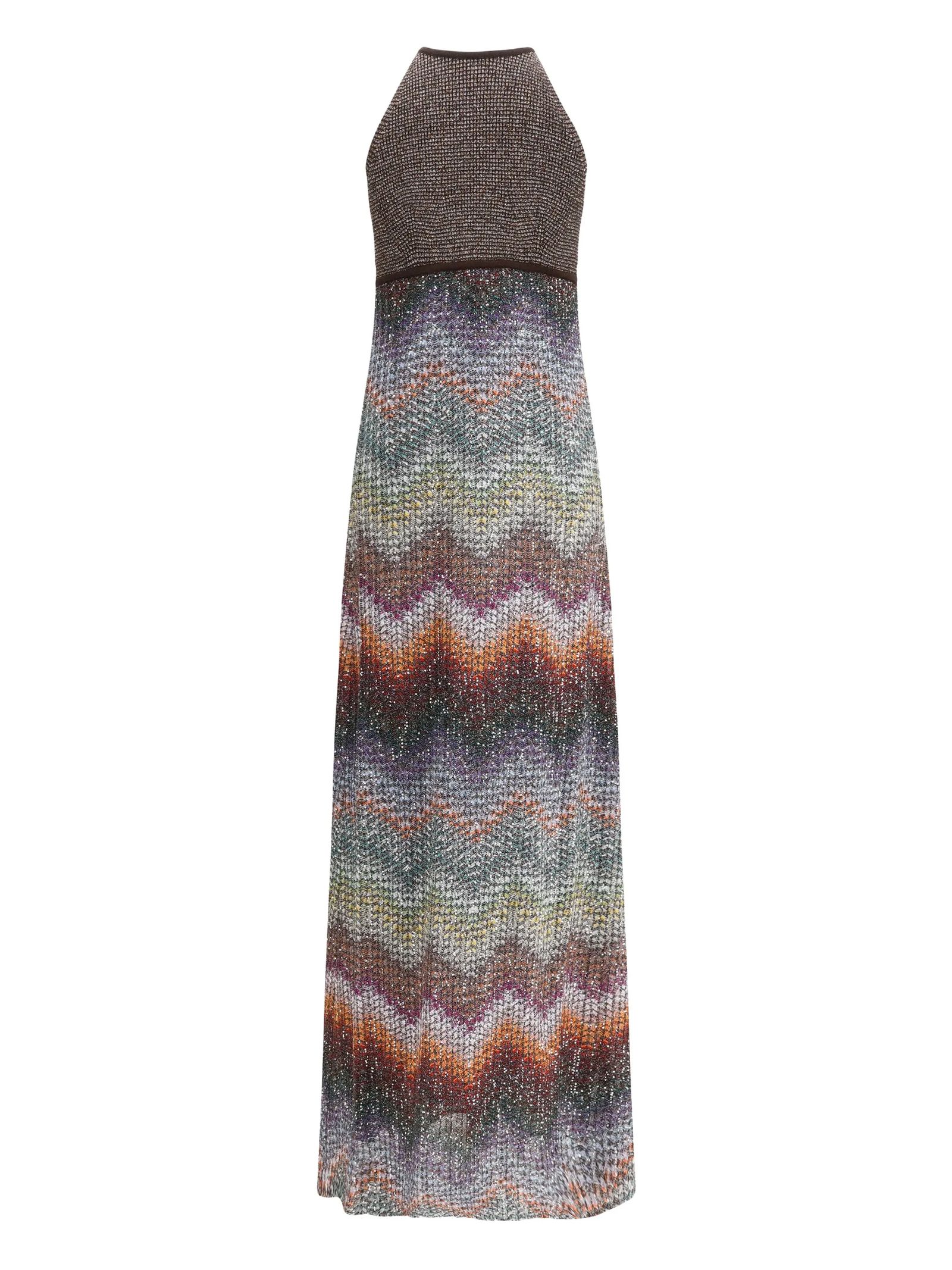 Abito lungo in maglia zig zag greca, senza maniche, scollatura all'americana, lavorazione a telaio Caperdoni, pattern zig zag sulla gonna, misto viscosa e lamé con paillettes