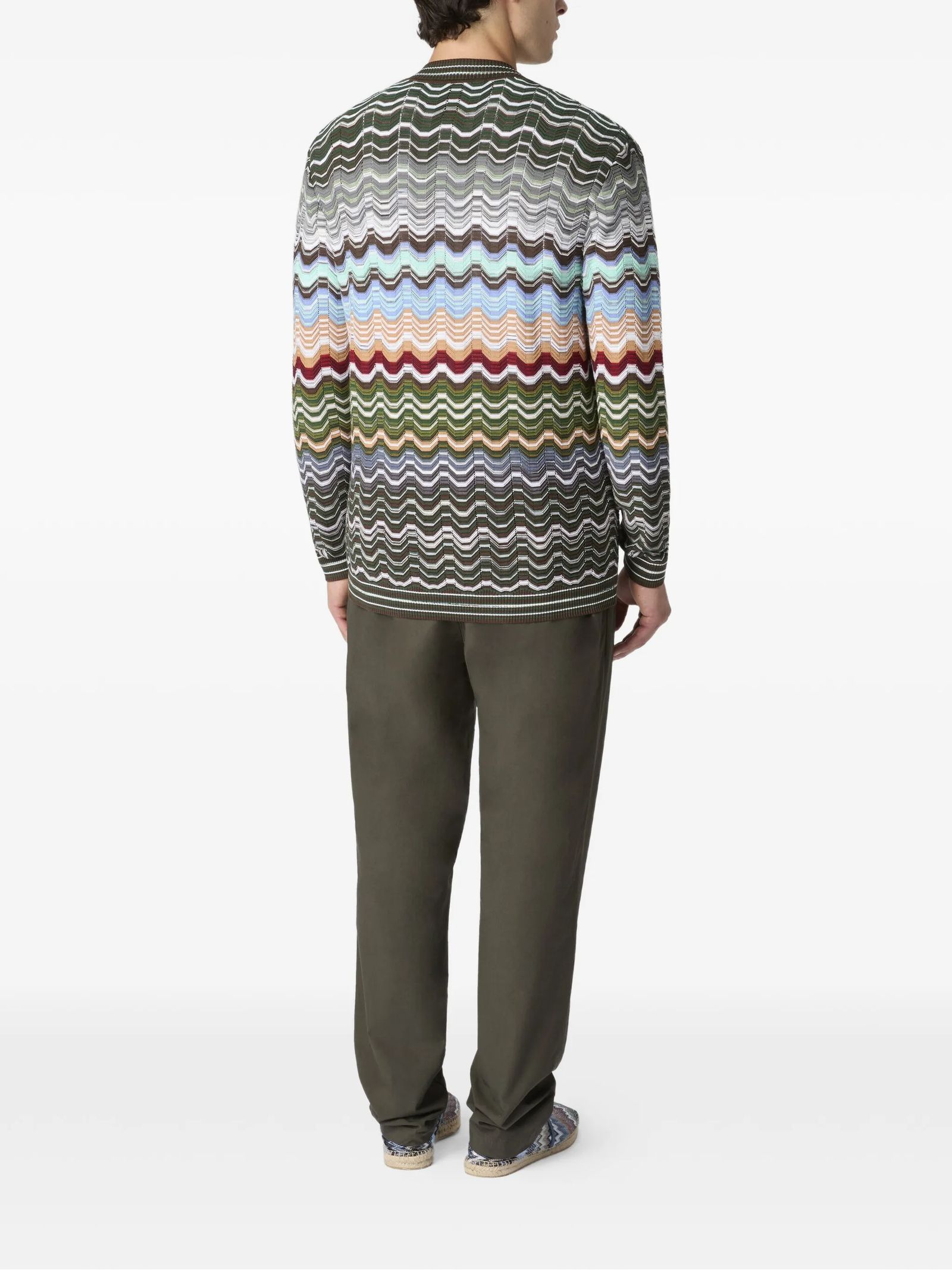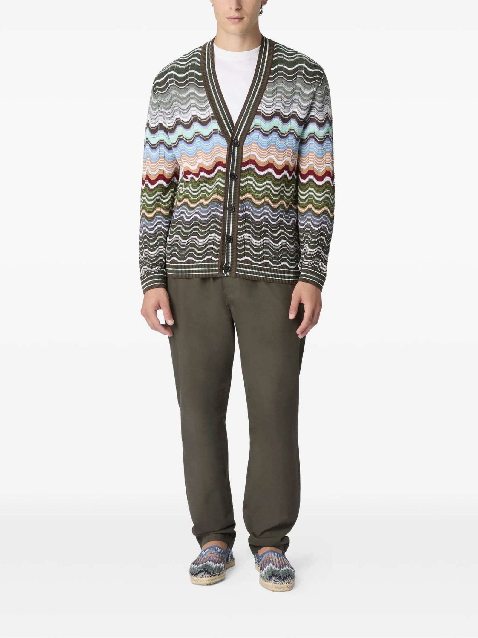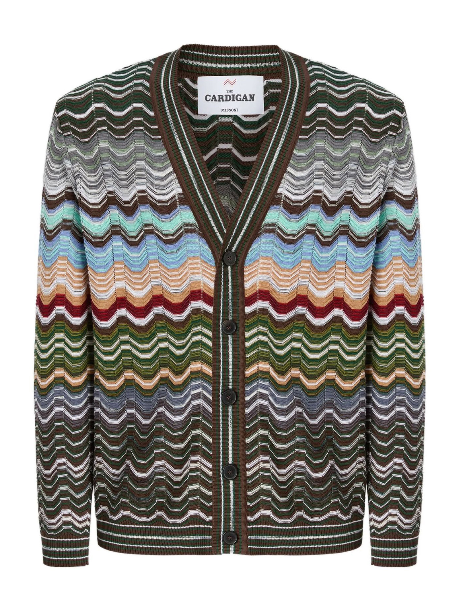 Cardigan multicolore in cotone a zig-zag, scollo a V, chiusura frontale con bottoni, maniche lunghe, bordi a costine