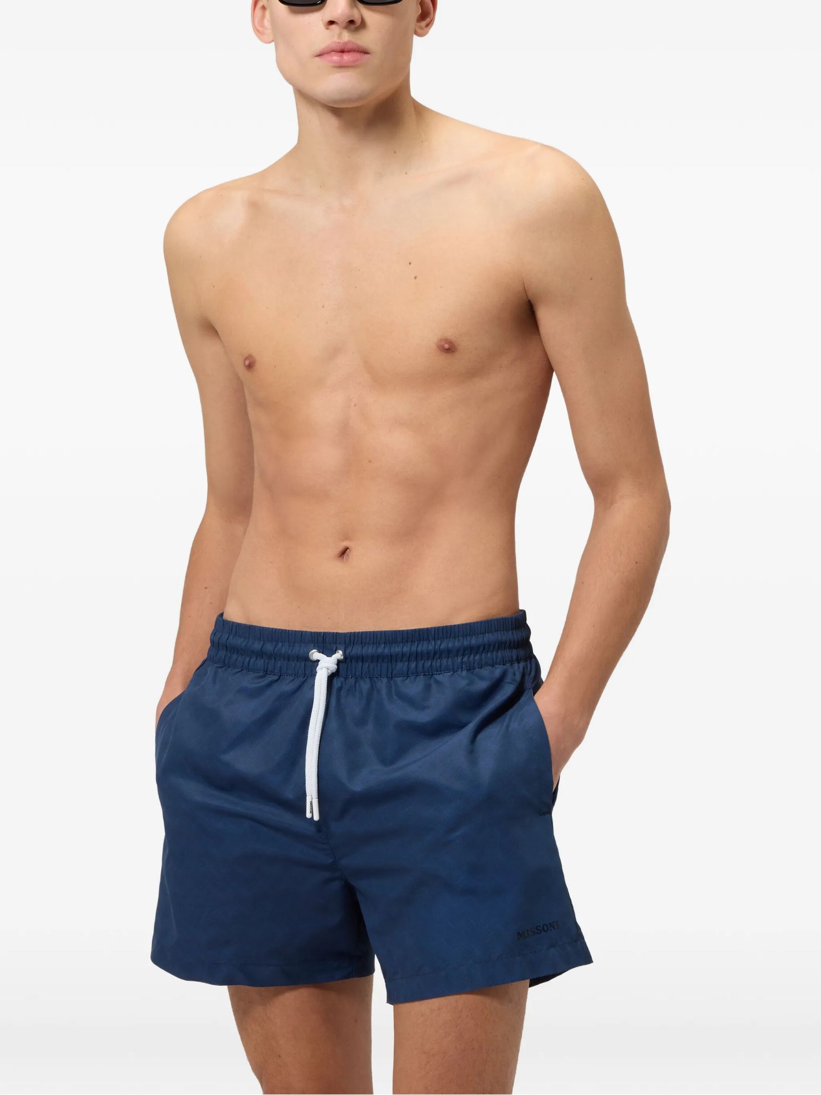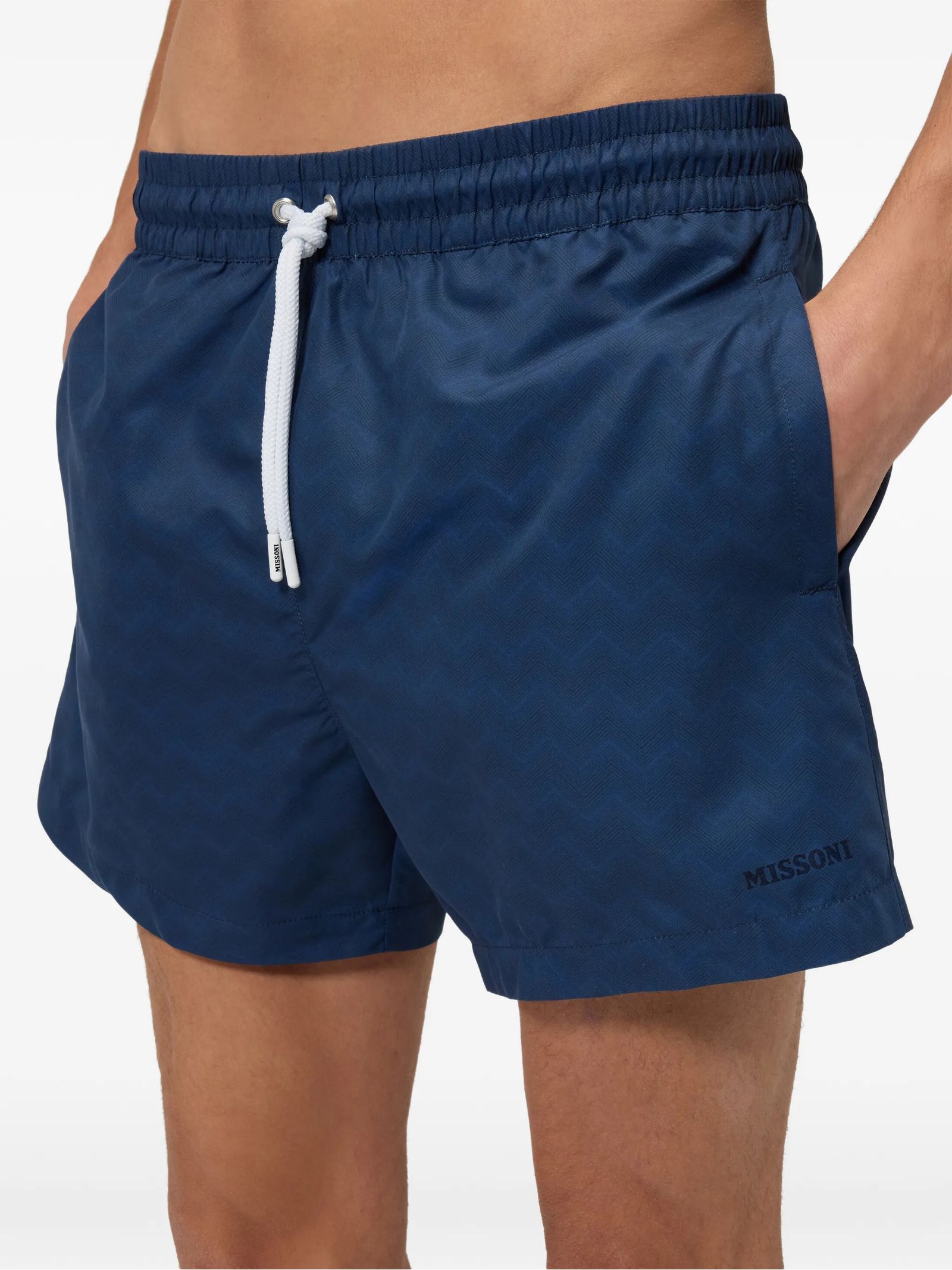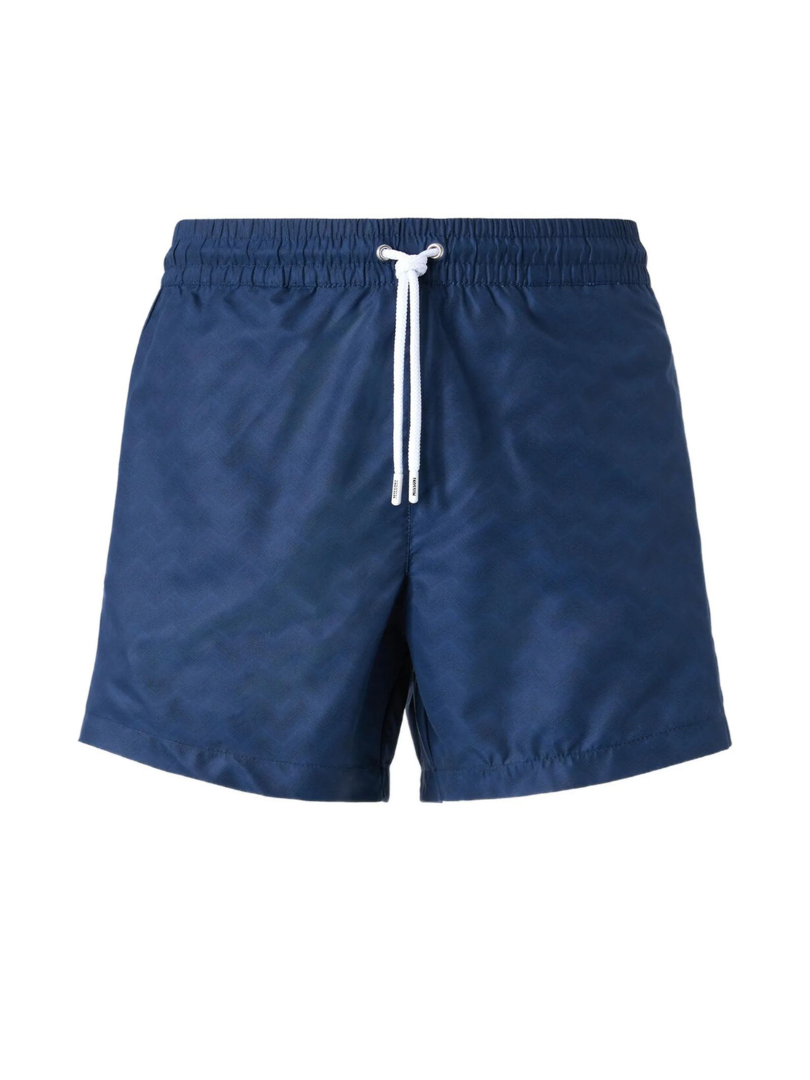 Costume da bagno blu con coulisse, motivo a zig zag, chiusura con coulisse, vita elasticizzata, tasca posteriore