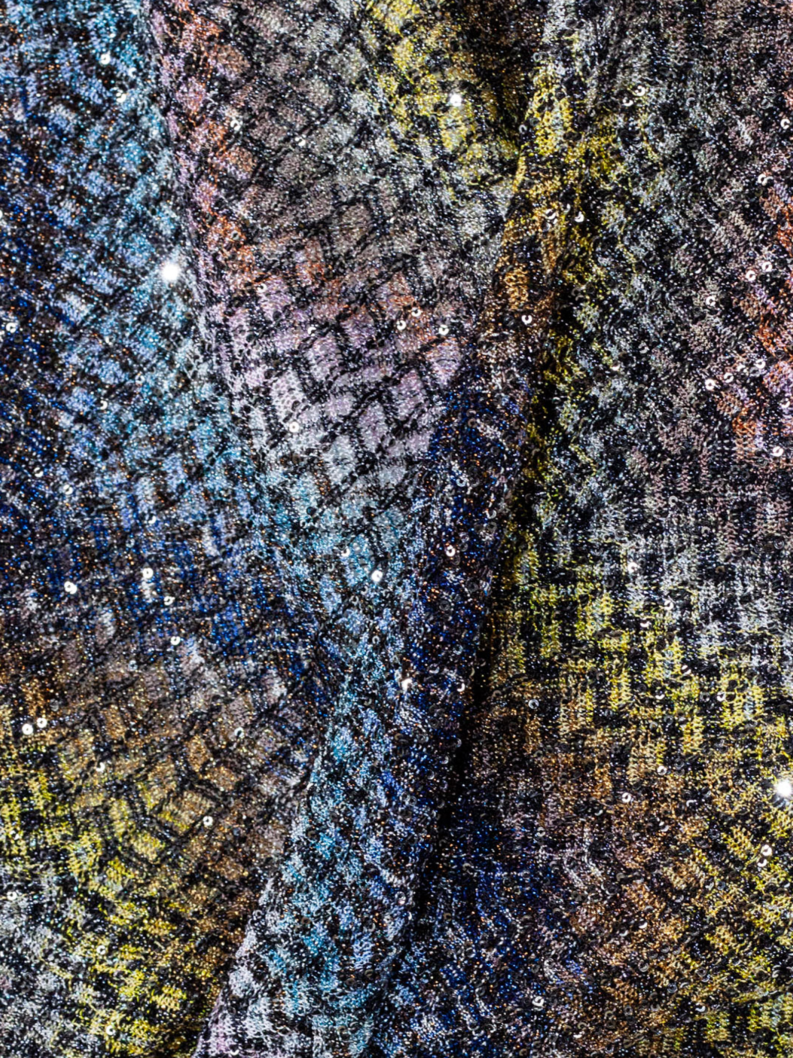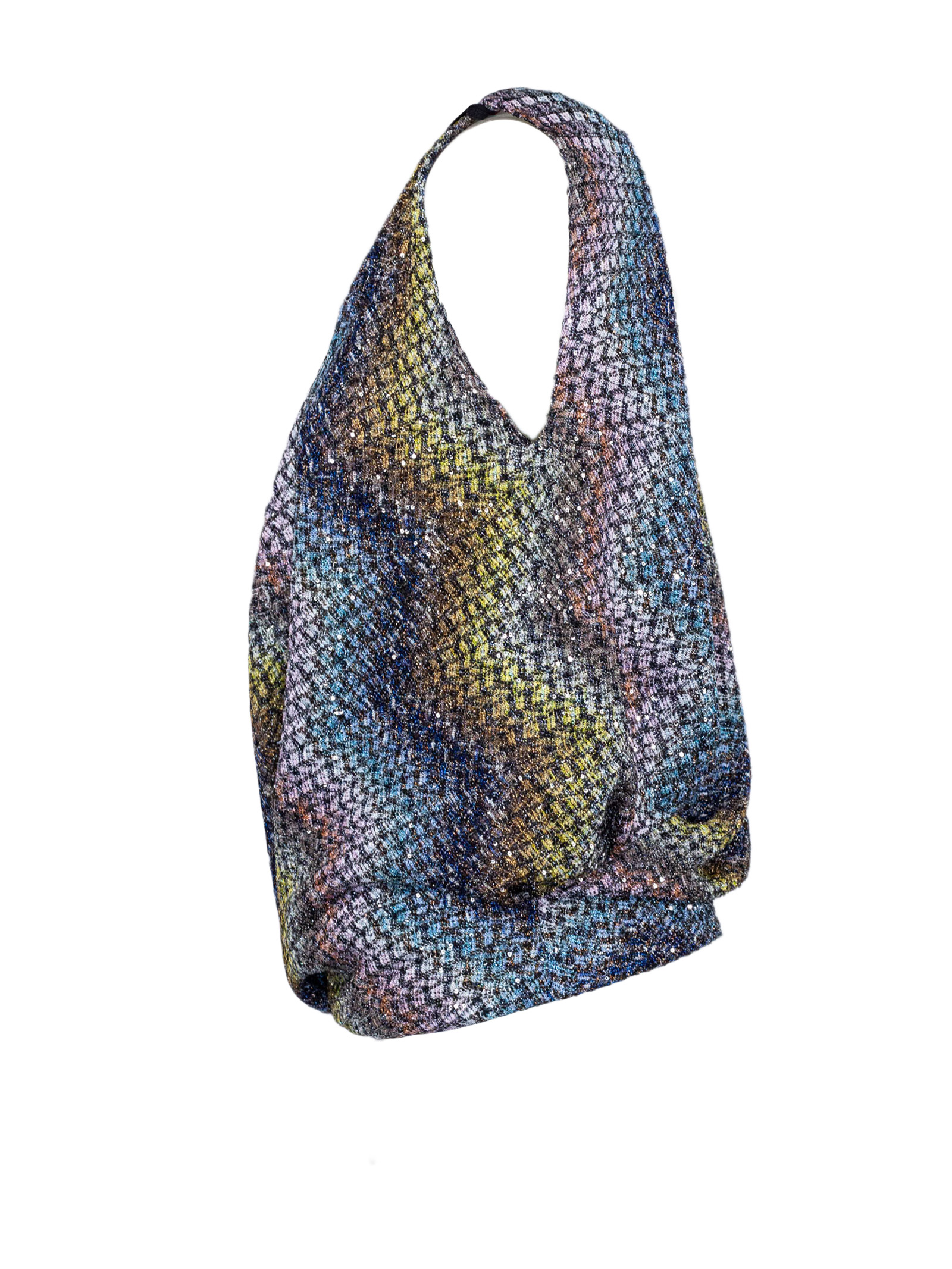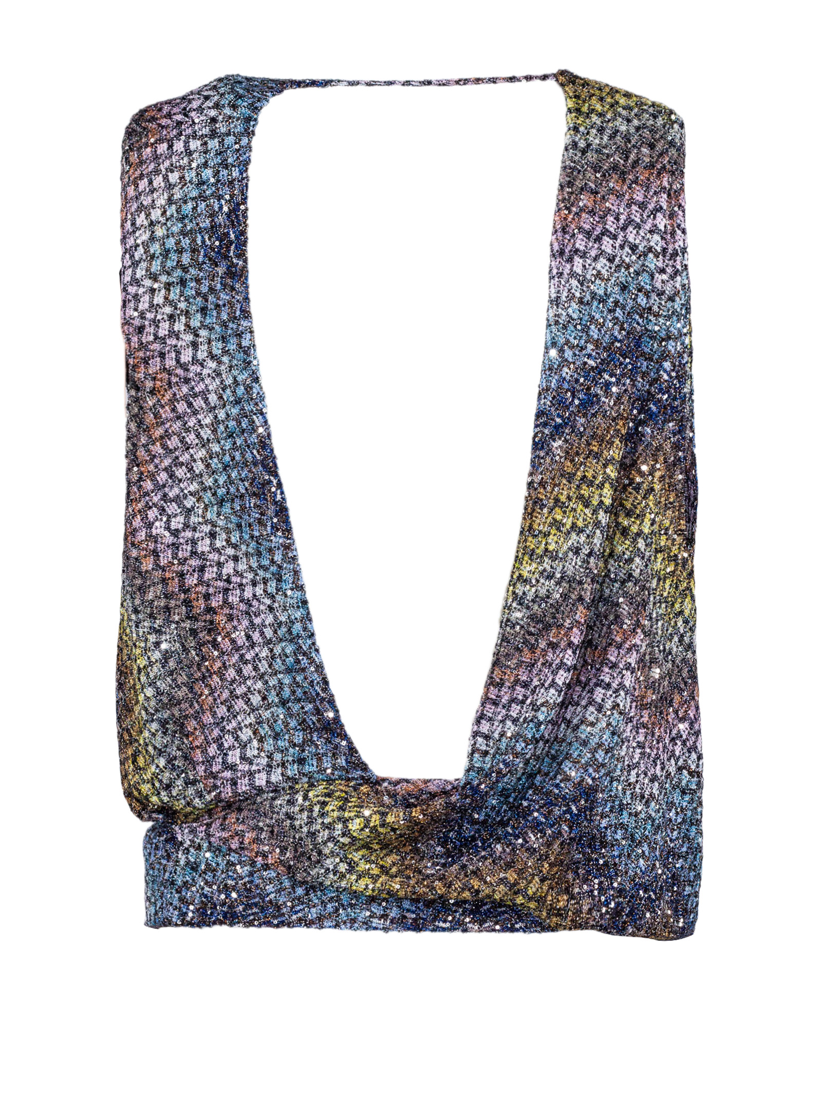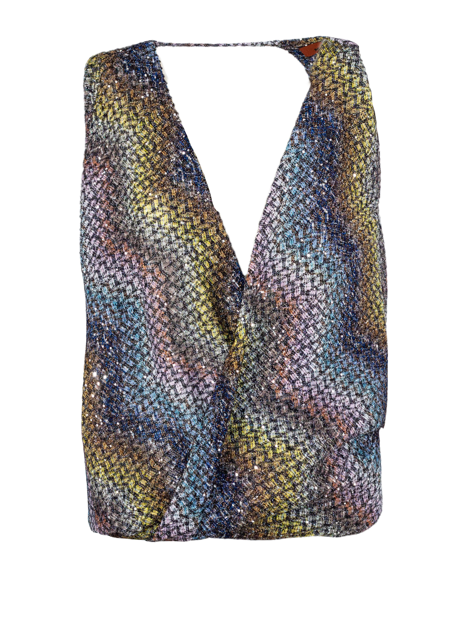 Top senza maniche, tessuto effetto tweed multicolor con fili lurex, scollo profondo a V, design drappeggiato con nodo frontale, spalle ampie con dettaglio posteriore, vestibilità morbida, chiusura pull-on