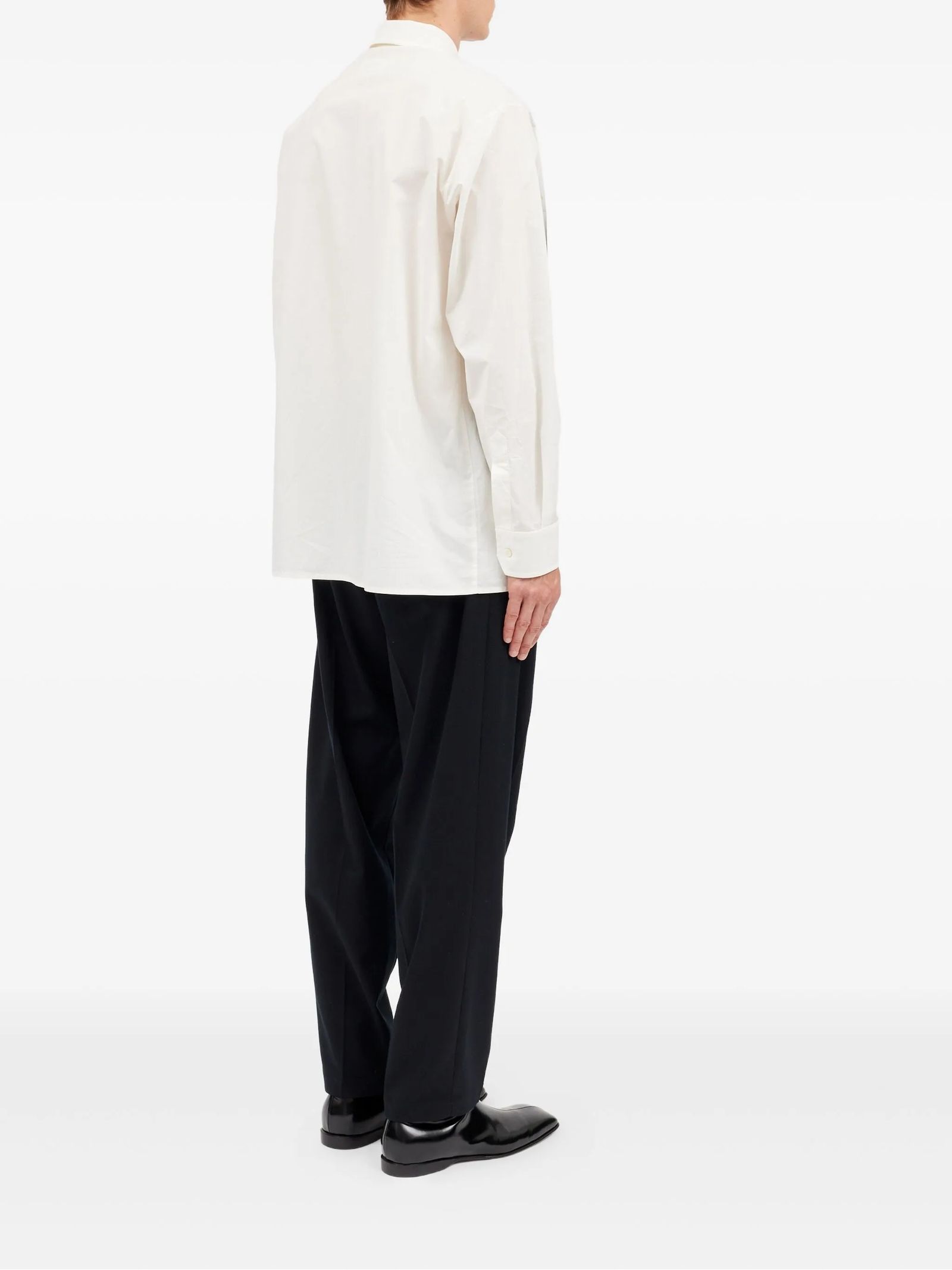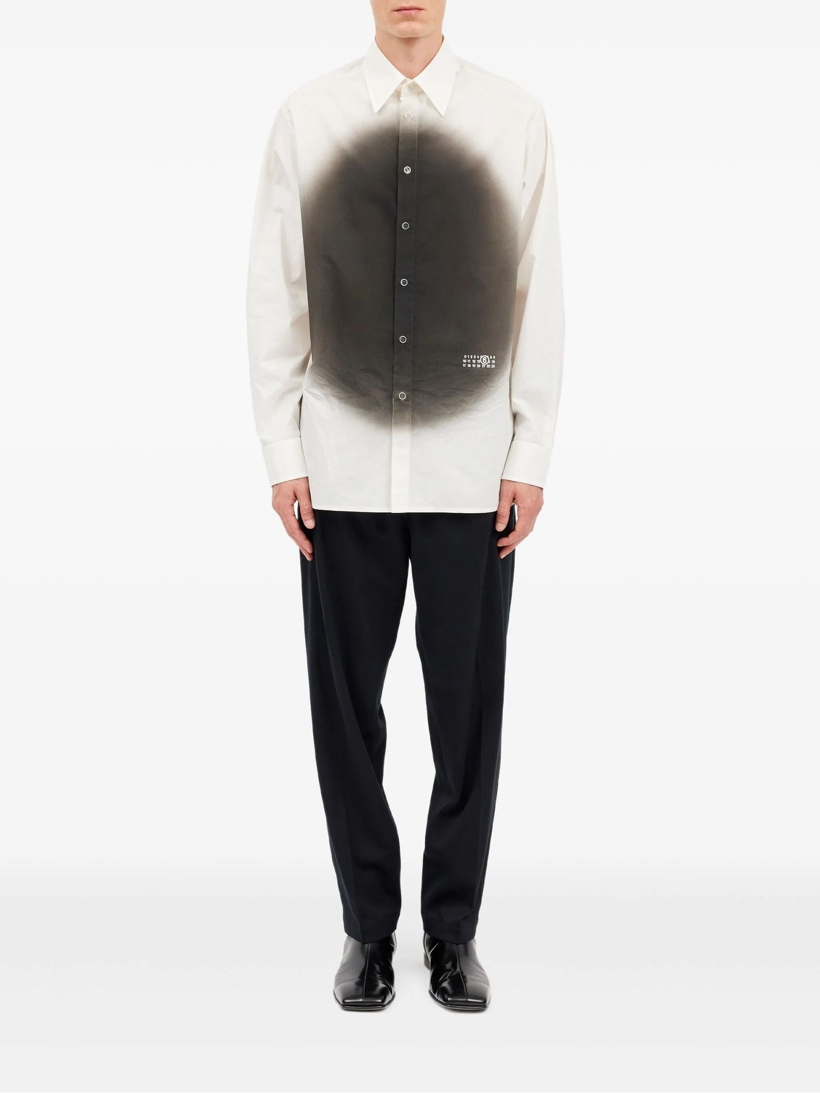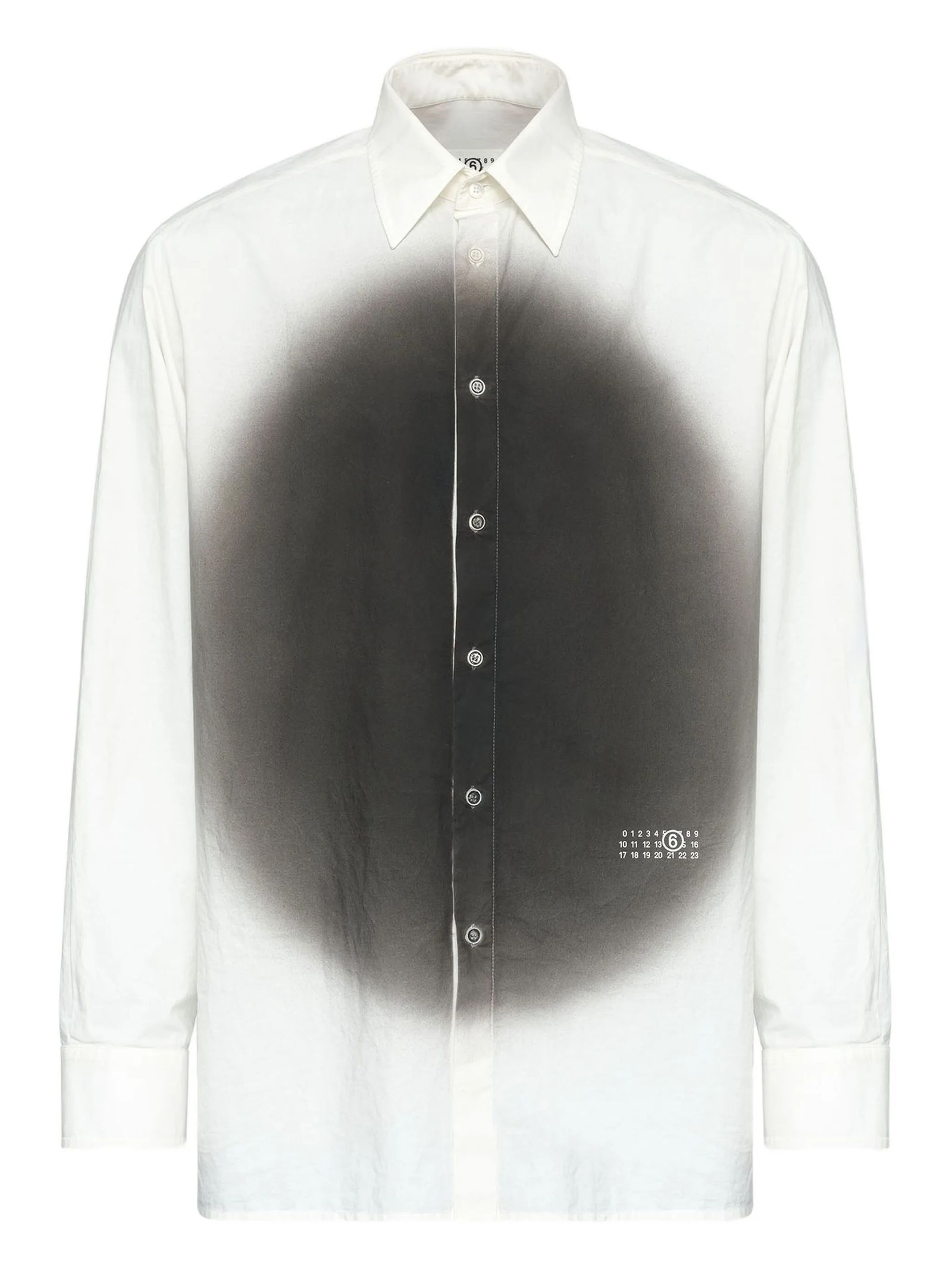 Camicia in cotone bianco con stampa spray, effetto sfumato spray sul davanti, maniche lunghe, colletto classico, chiusura con bottoni piatti sul davanti, cuciture bianche sul retro