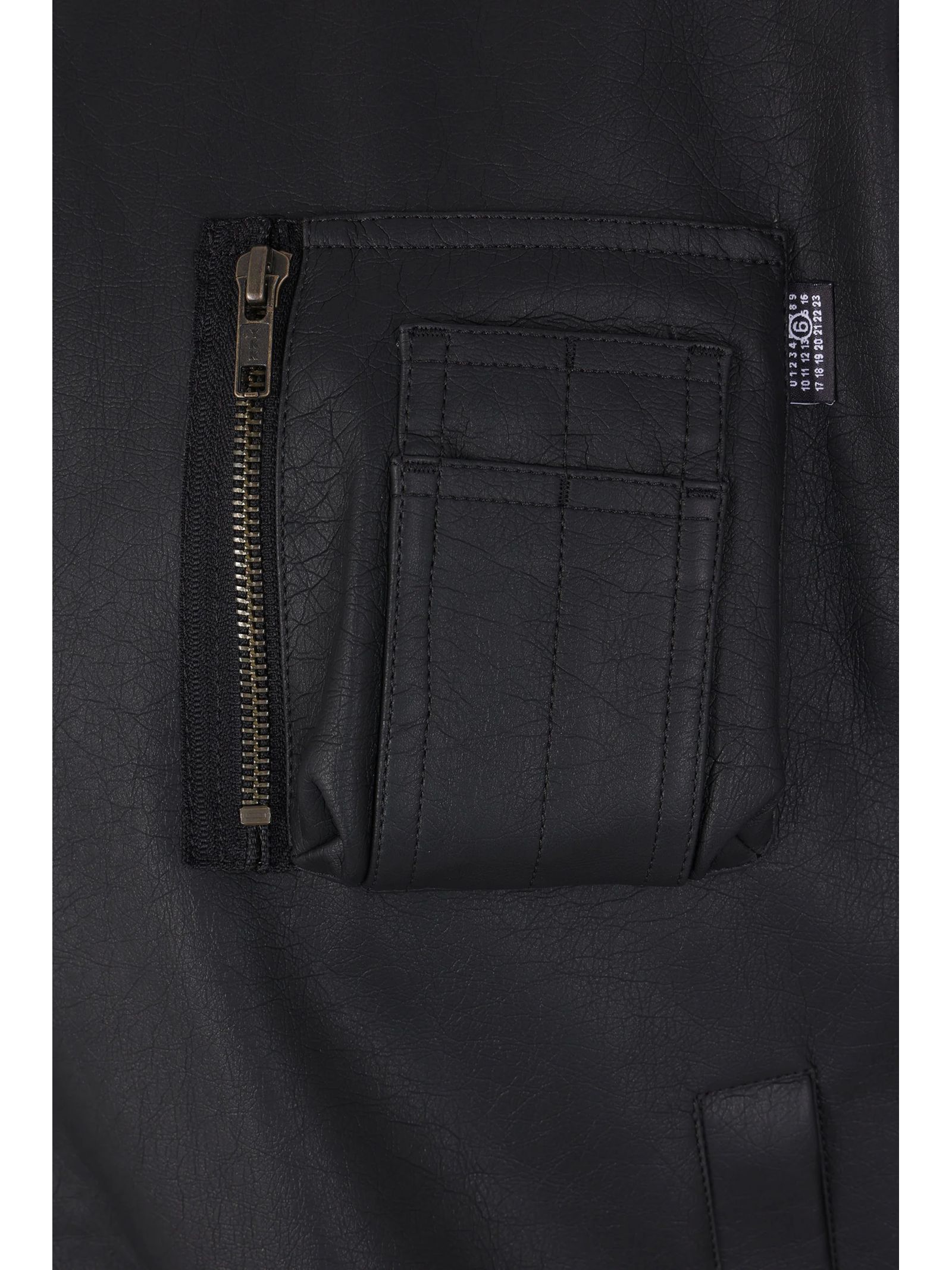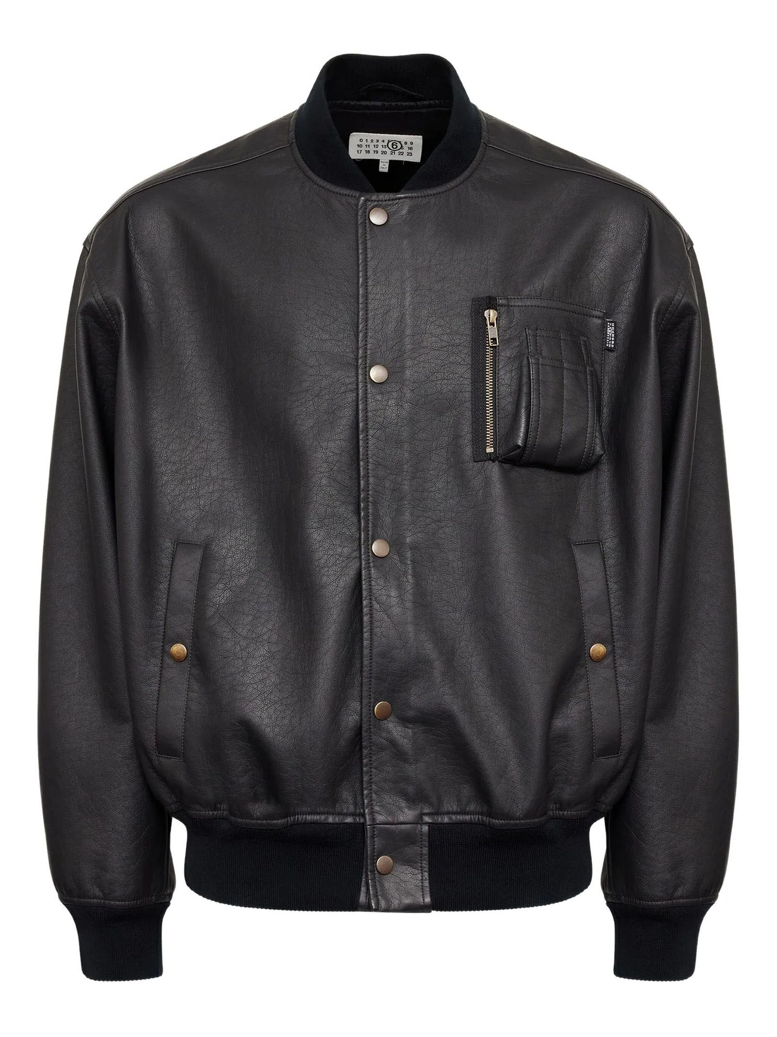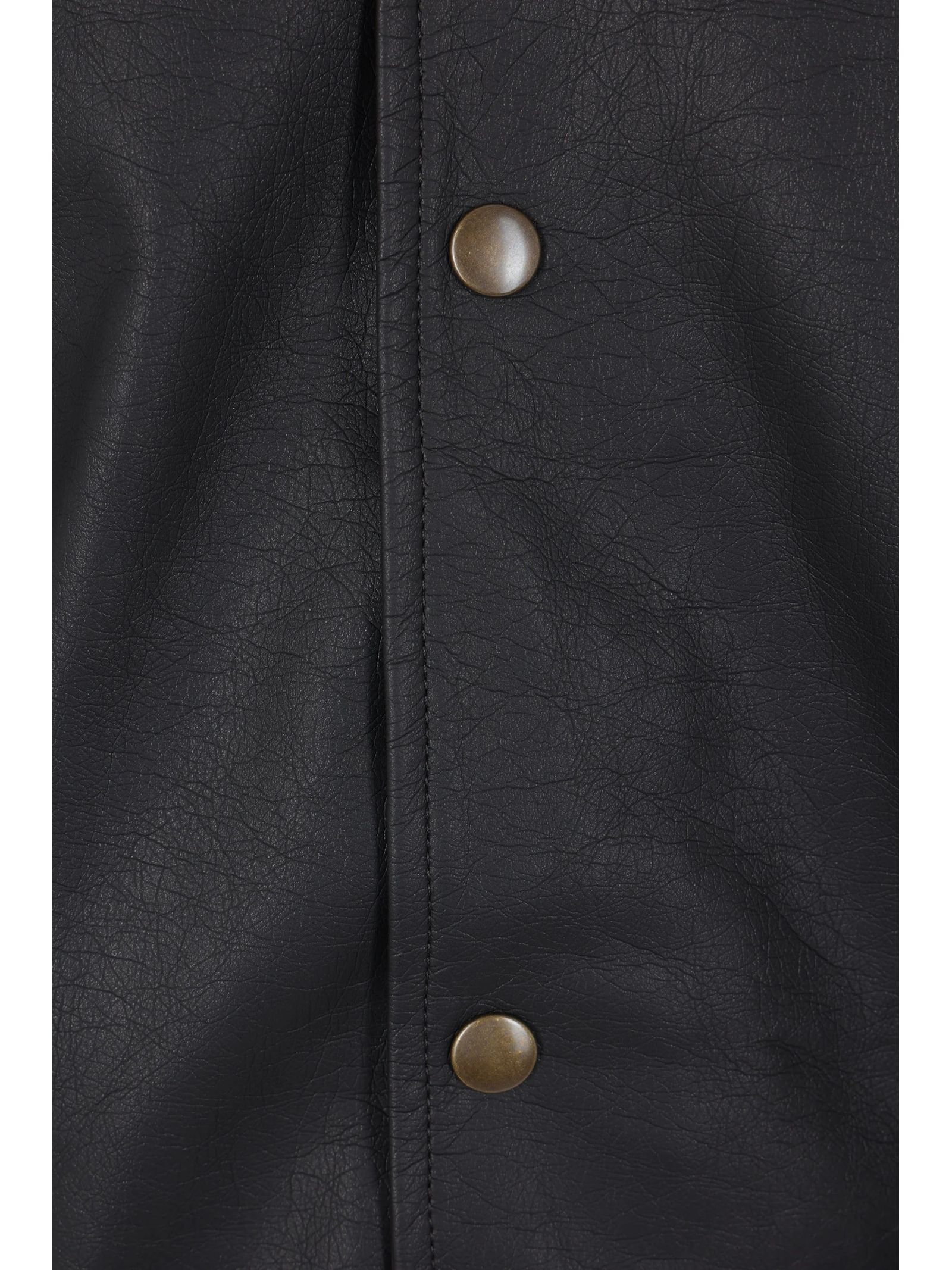 Giacca varsity nera realizzata in morbida ecopelle, dal taglio strutturato e squadrato; tasca applicata con cerniera sul petto; maniche lunghe; scollo rotondo a costine; chiusura frontale con bottoni a pressione; cuciture bianche sul retro