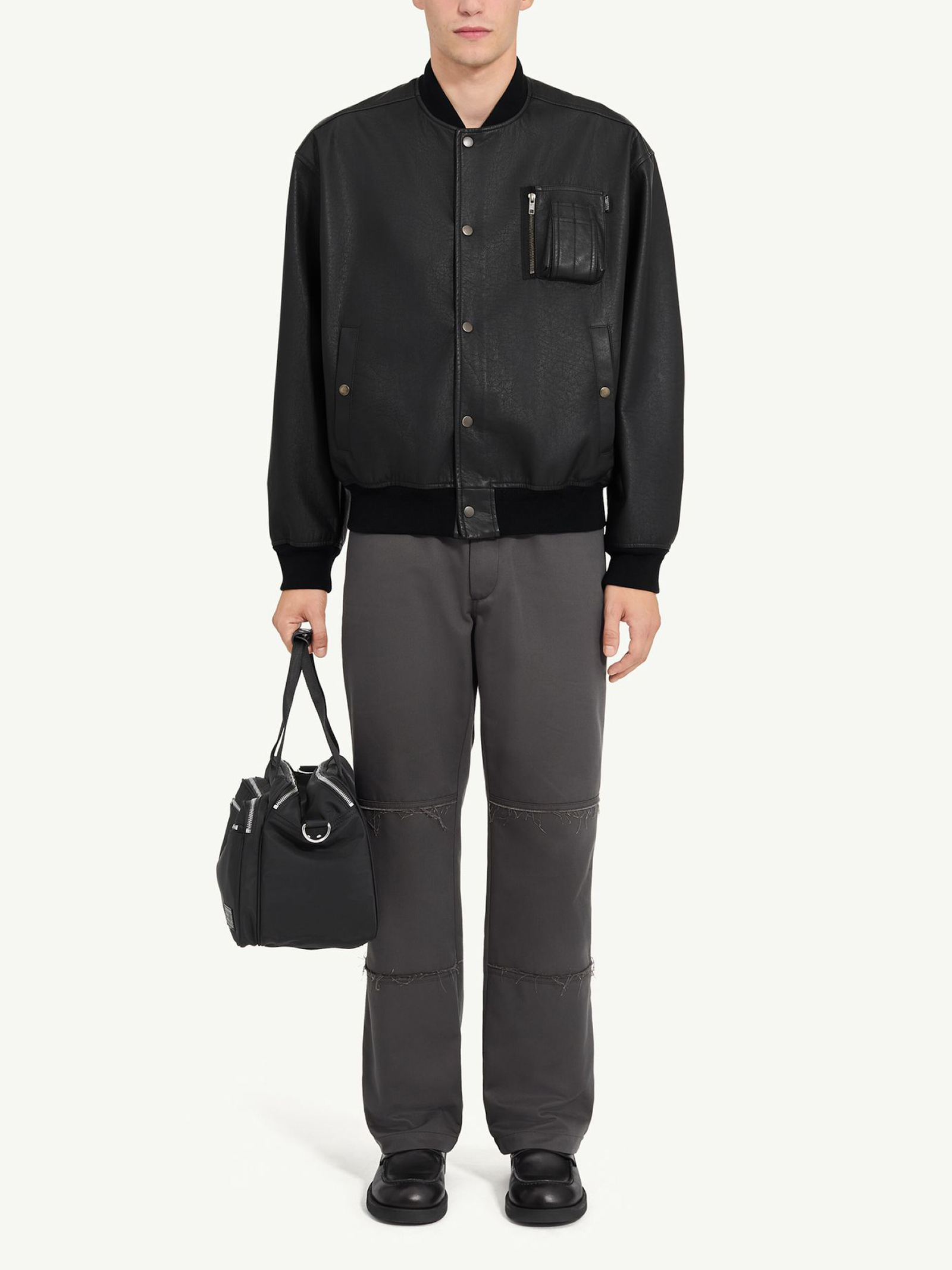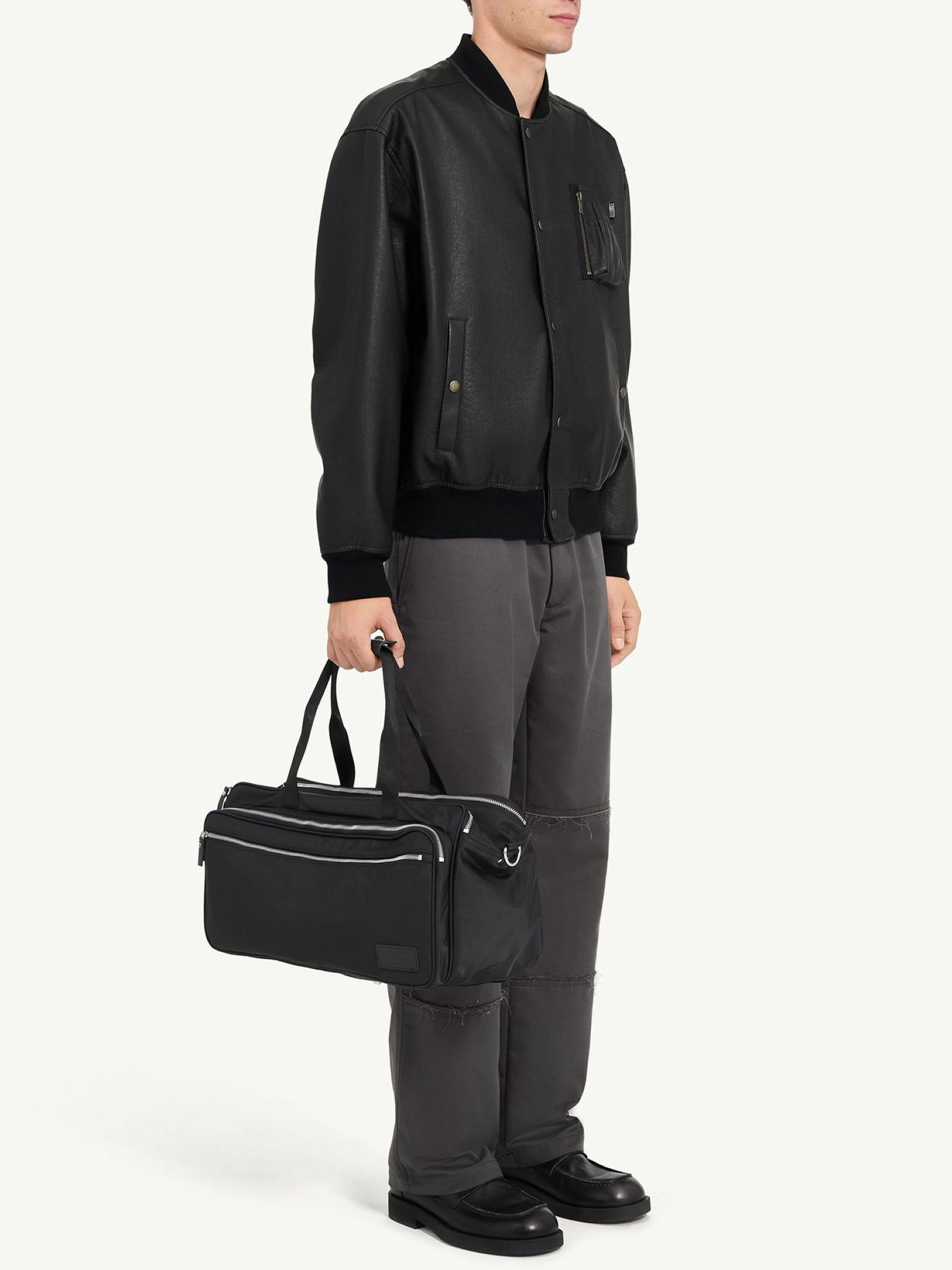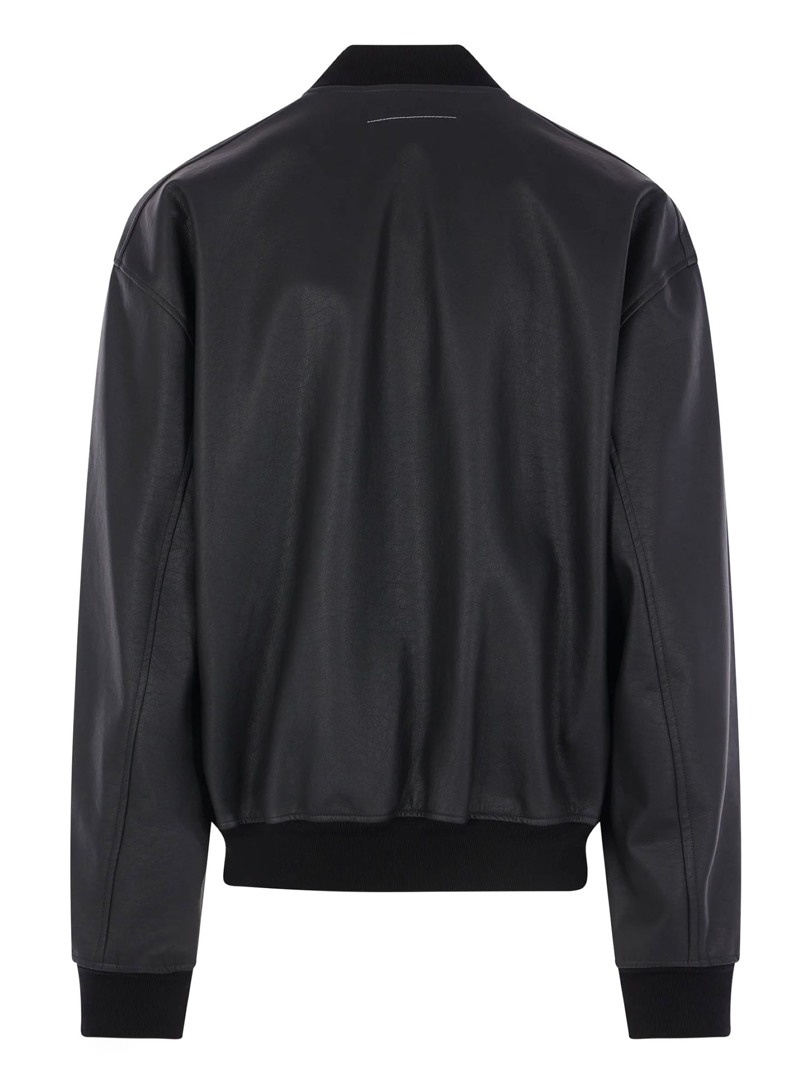 Giacca varsity nera realizzata in morbida ecopelle, dal taglio strutturato e squadrato; tasca applicata con cerniera sul petto; maniche lunghe; scollo rotondo a costine; chiusura frontale con bottoni a pressione; cuciture bianche sul retro