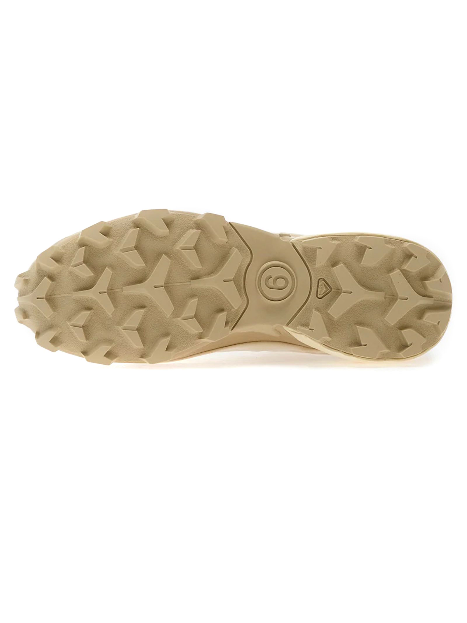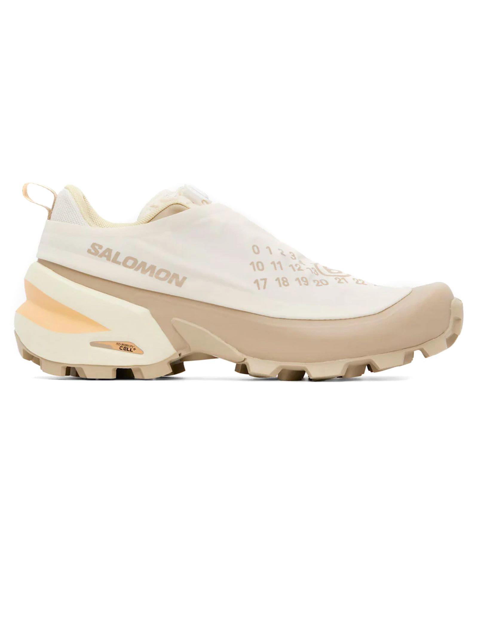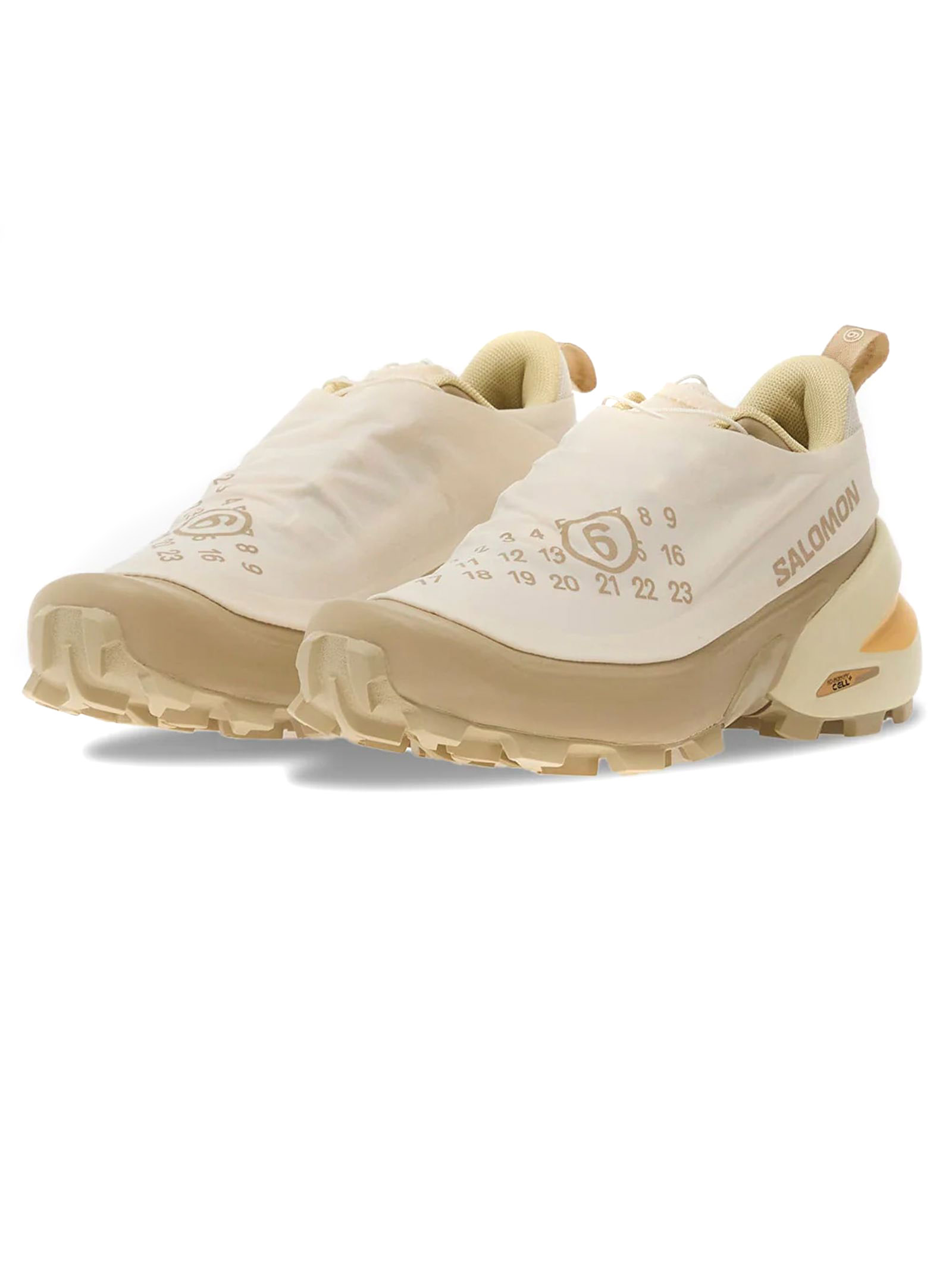 Sneakers beige MM6 Maison Margiela x Salomon, chiusura con coulisse, linguetta sul tallone, punta arrotondata, suola scanalata
