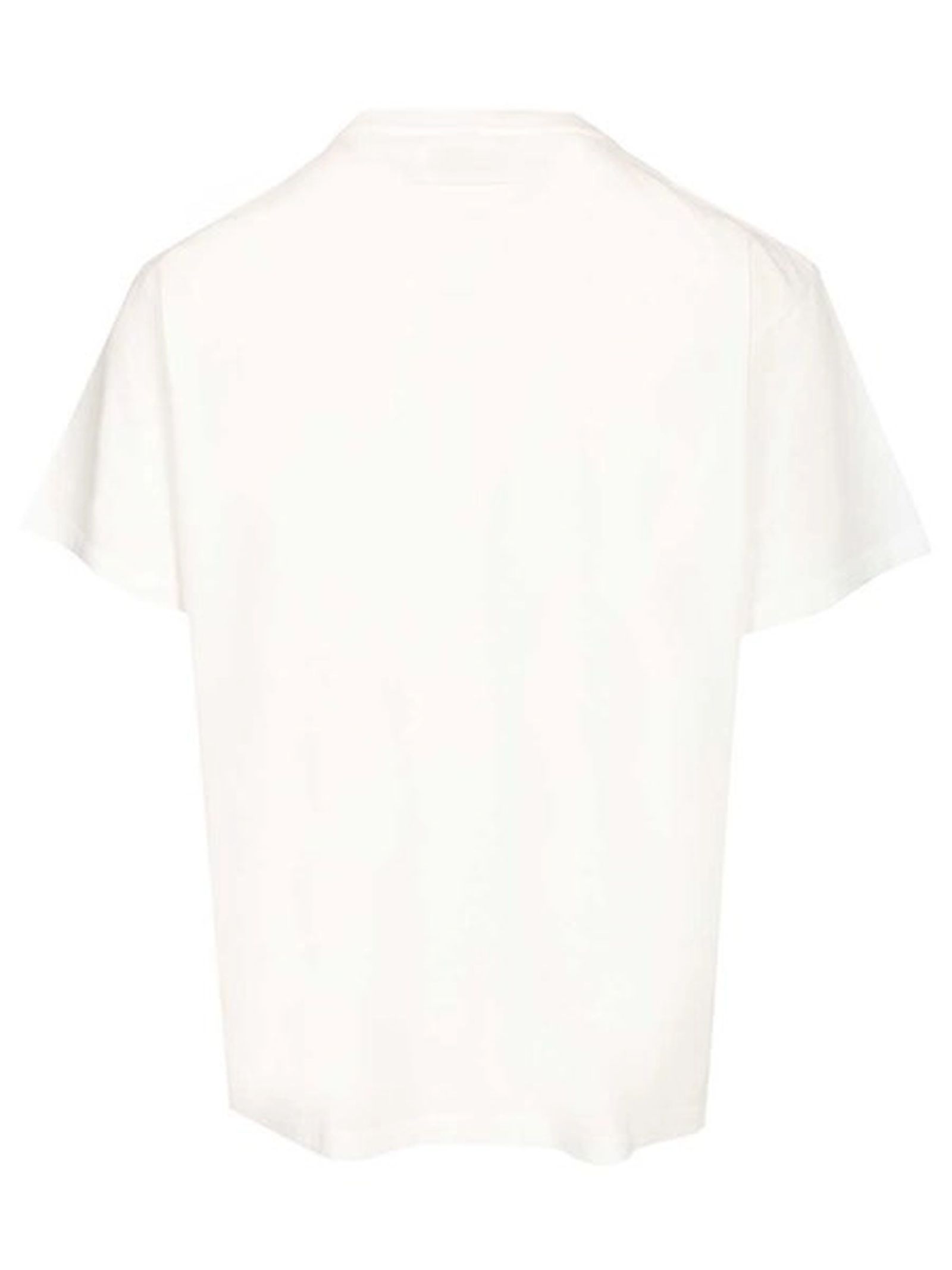 T-shirt in cotone bianco con dettaglio effetto spray e toppa sul petto, maniche corte, scollo rotondo, senza chiusura visibile, cuciture bianche sul retro