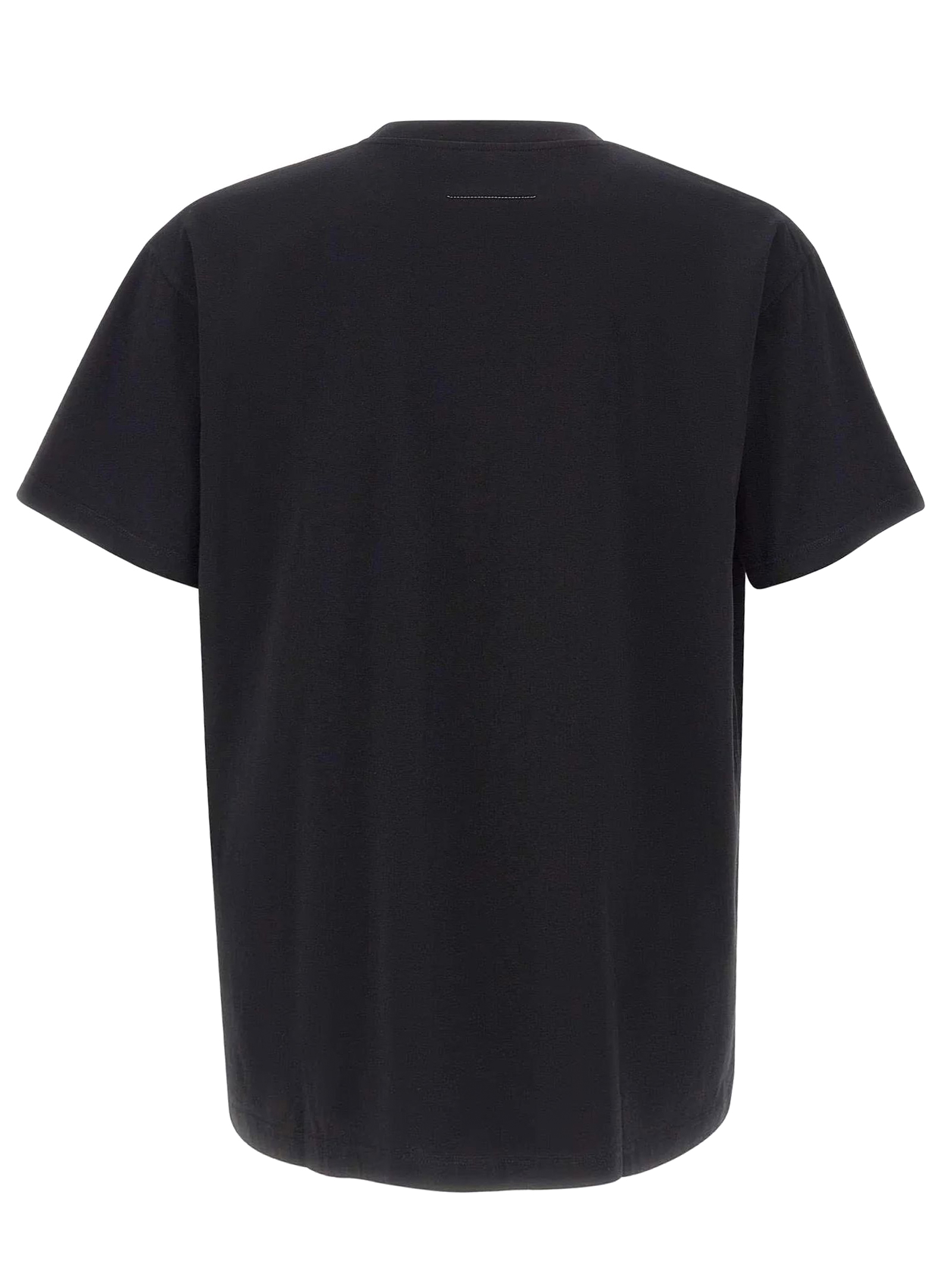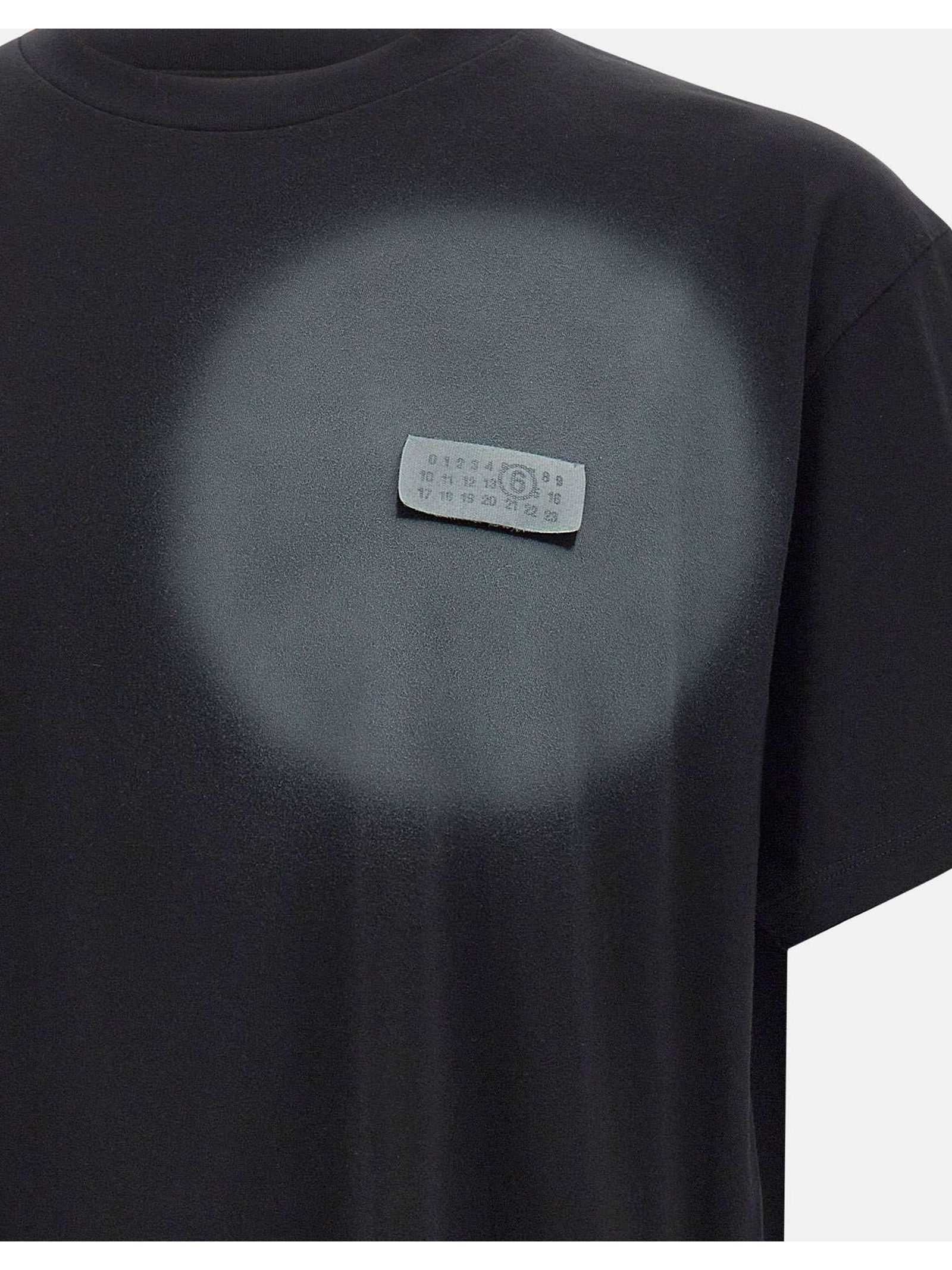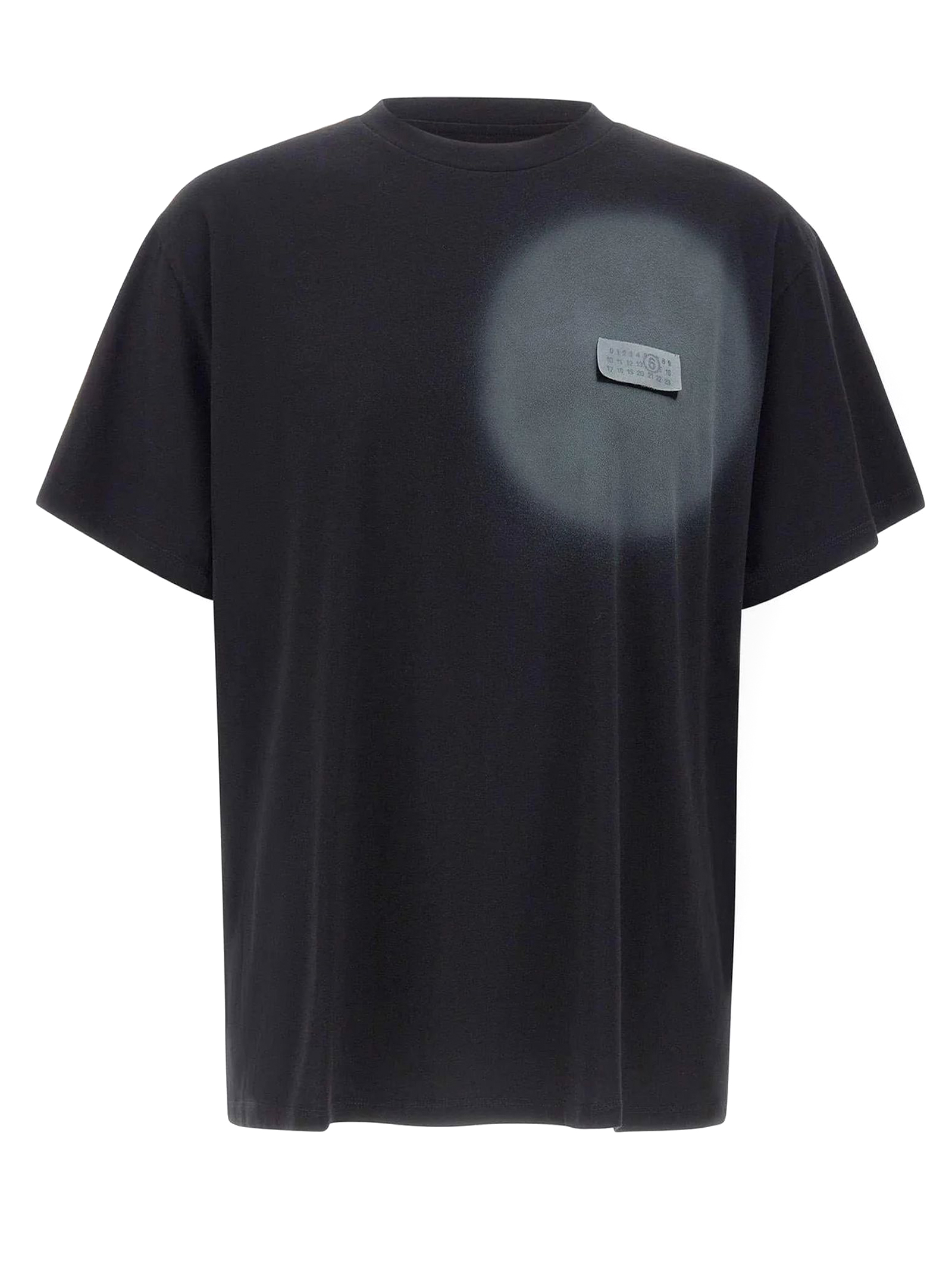 T-shirt in cotone nero con dettaglio effetto spray e toppa sul petto, maniche corte, scollo rotondo, senza chiusura visibile, cuciture bianche sul retro