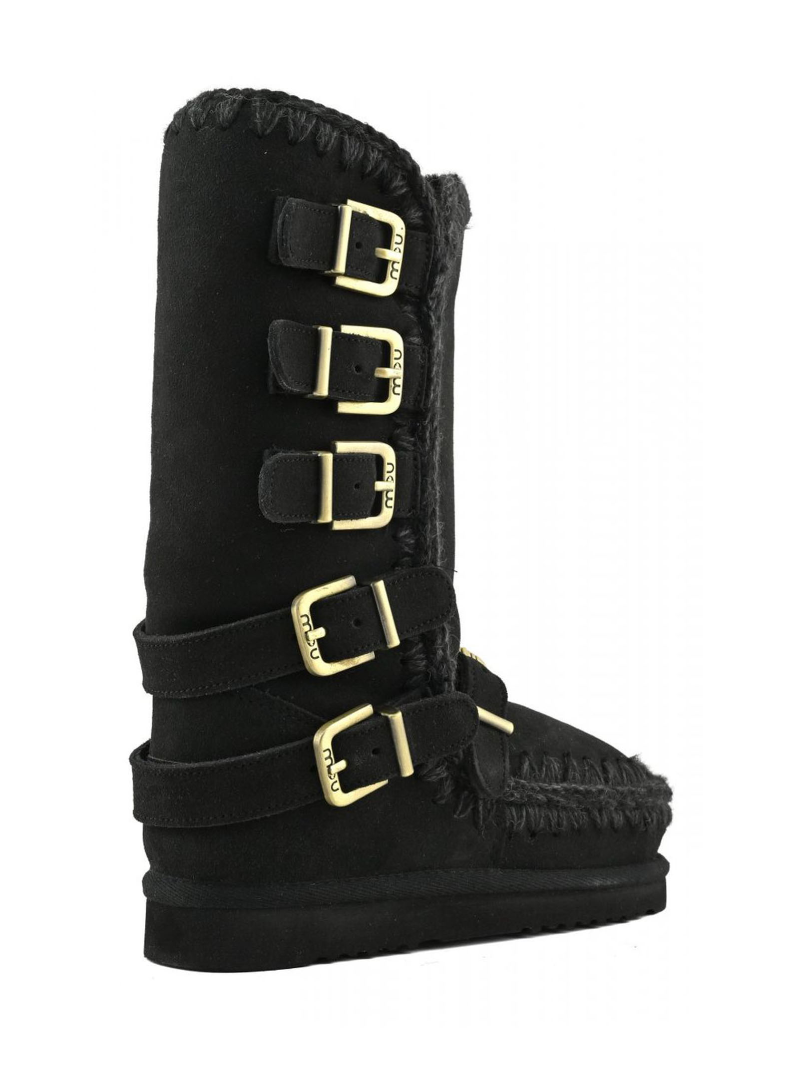Eskimo 40 in montone nero con cinturini e fibbia, cuciture in lana lavorate all'uncinetto, tallone rinforzato e una resistente suola esterna in gomma ed EVA. Altezza: 40 cm