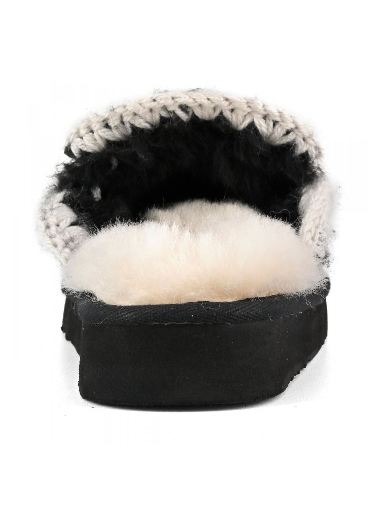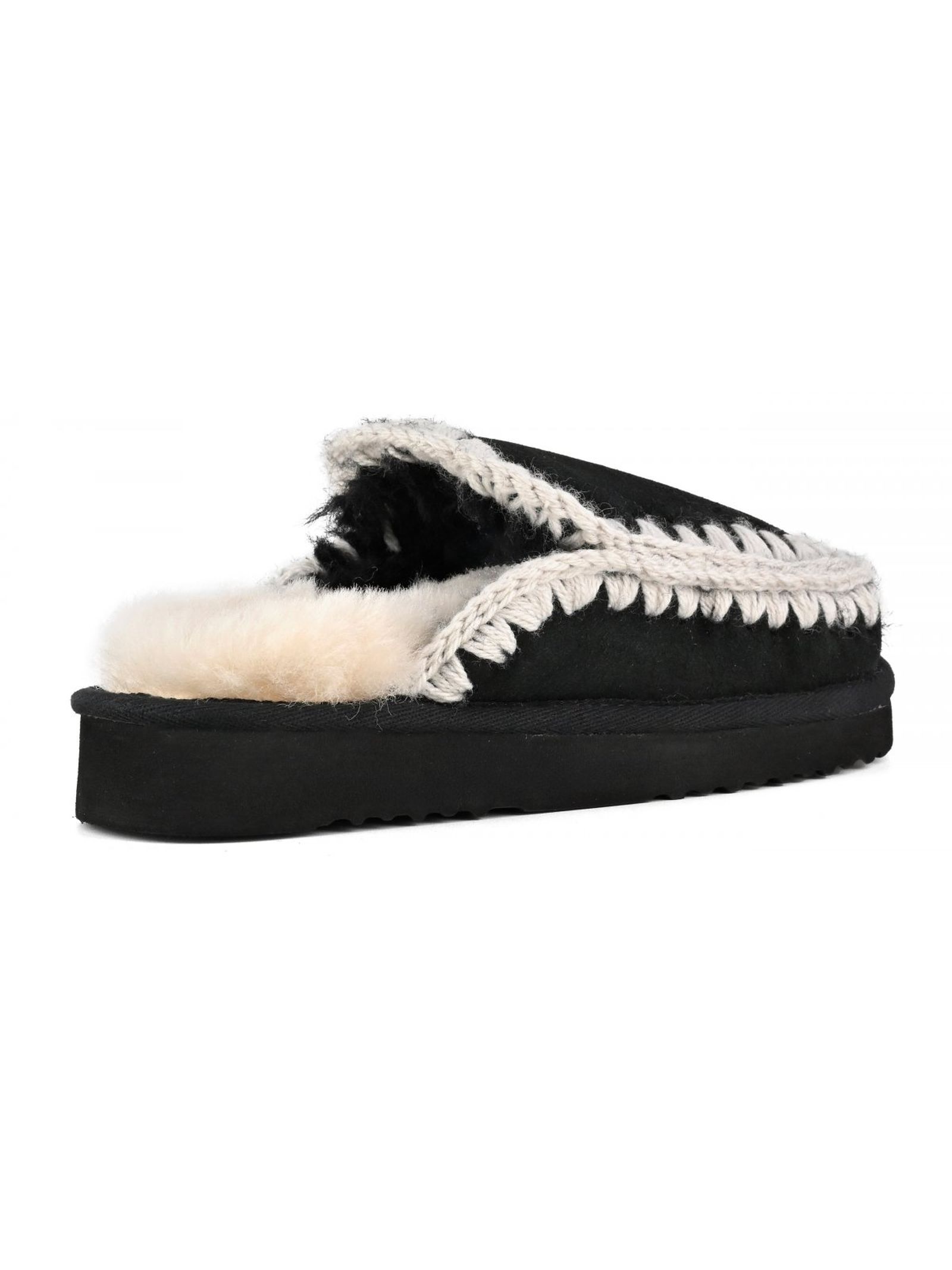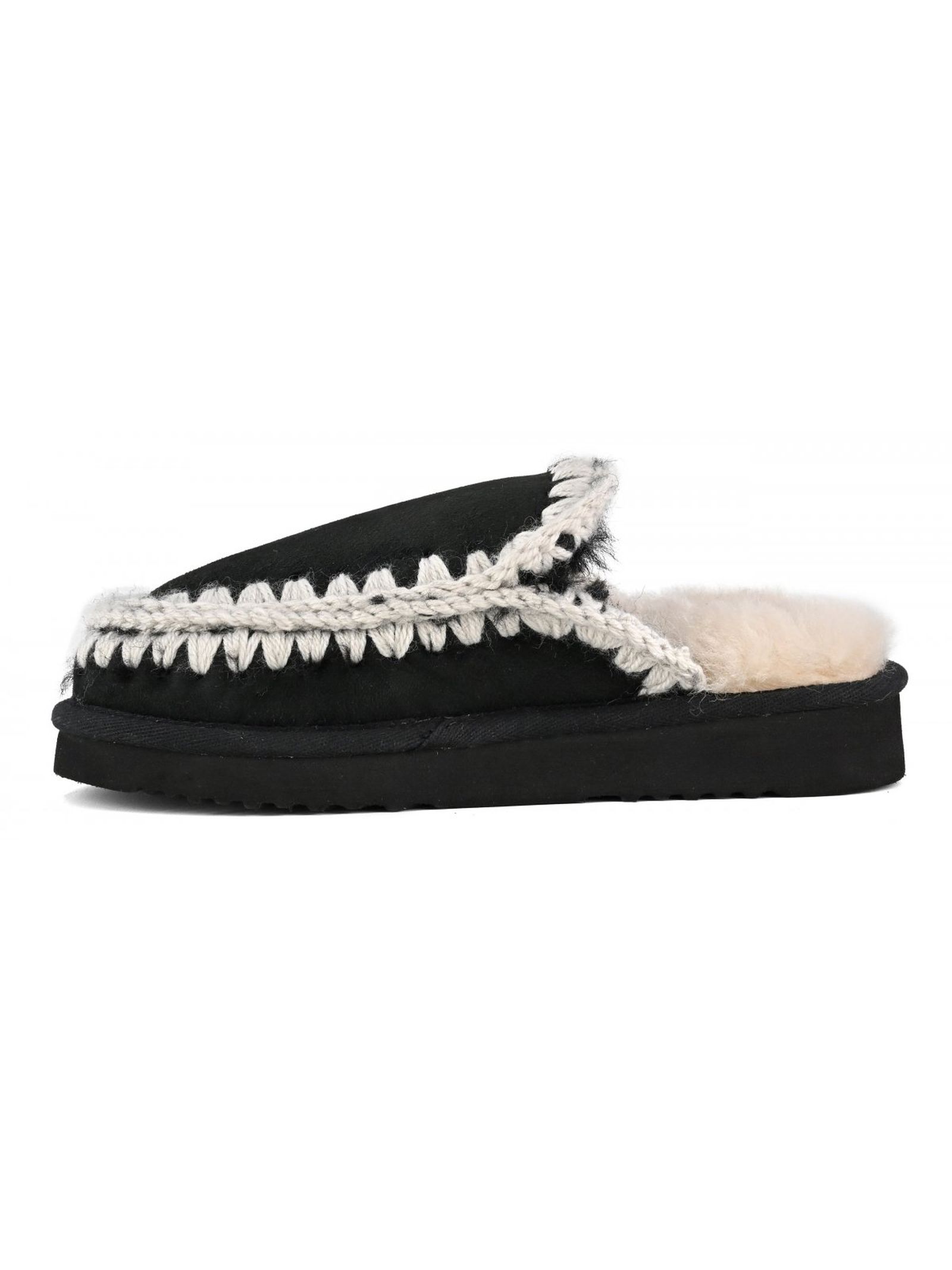 Eskimo slipper in pelle di montone double-face nero con cuciture in lana all'uncinetto, suola esterna in EVA & gomma