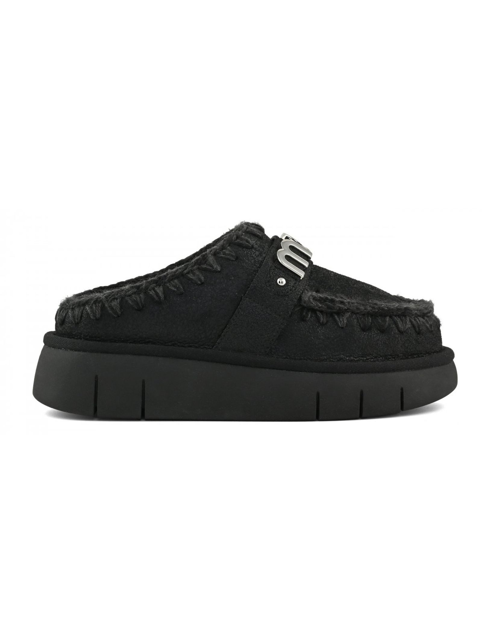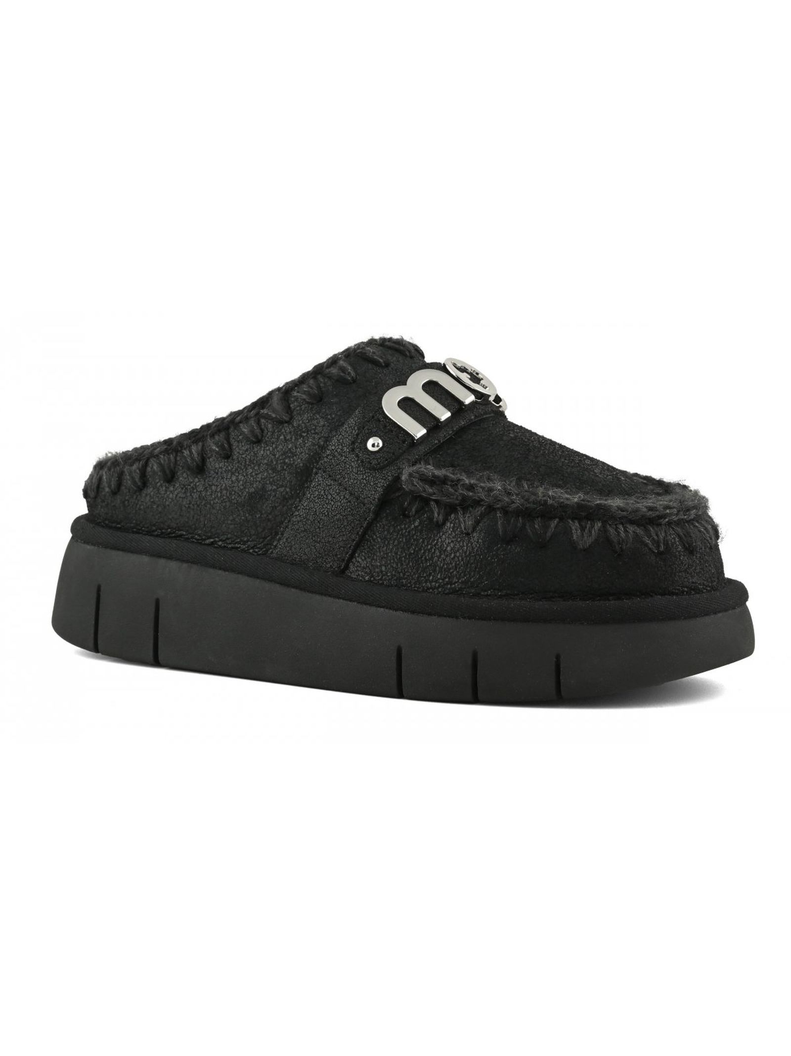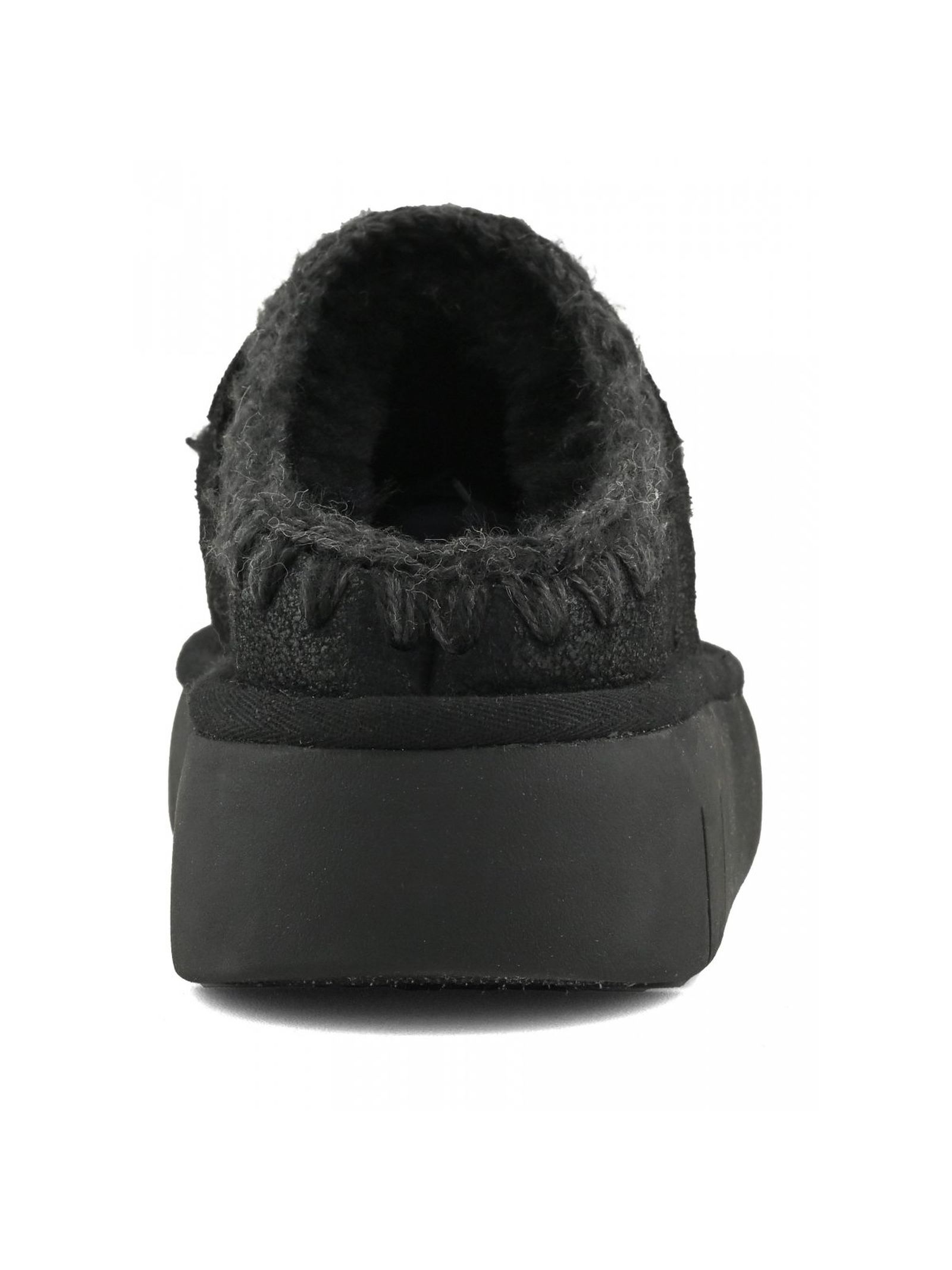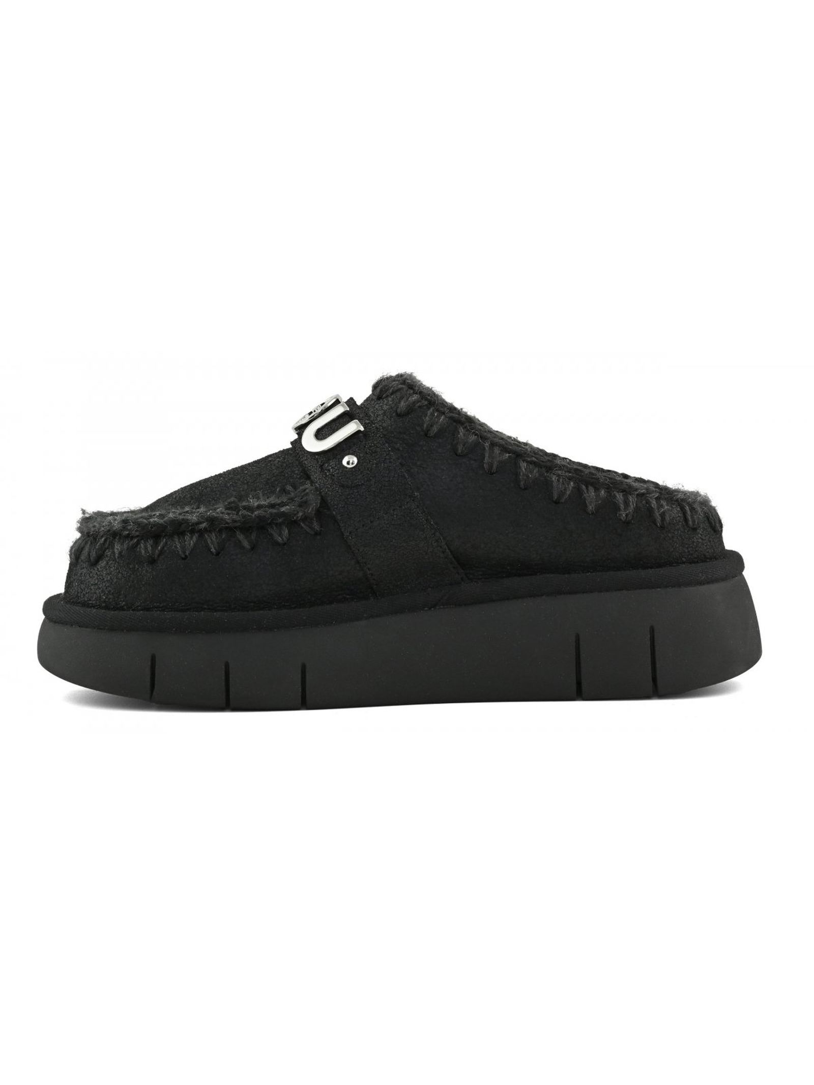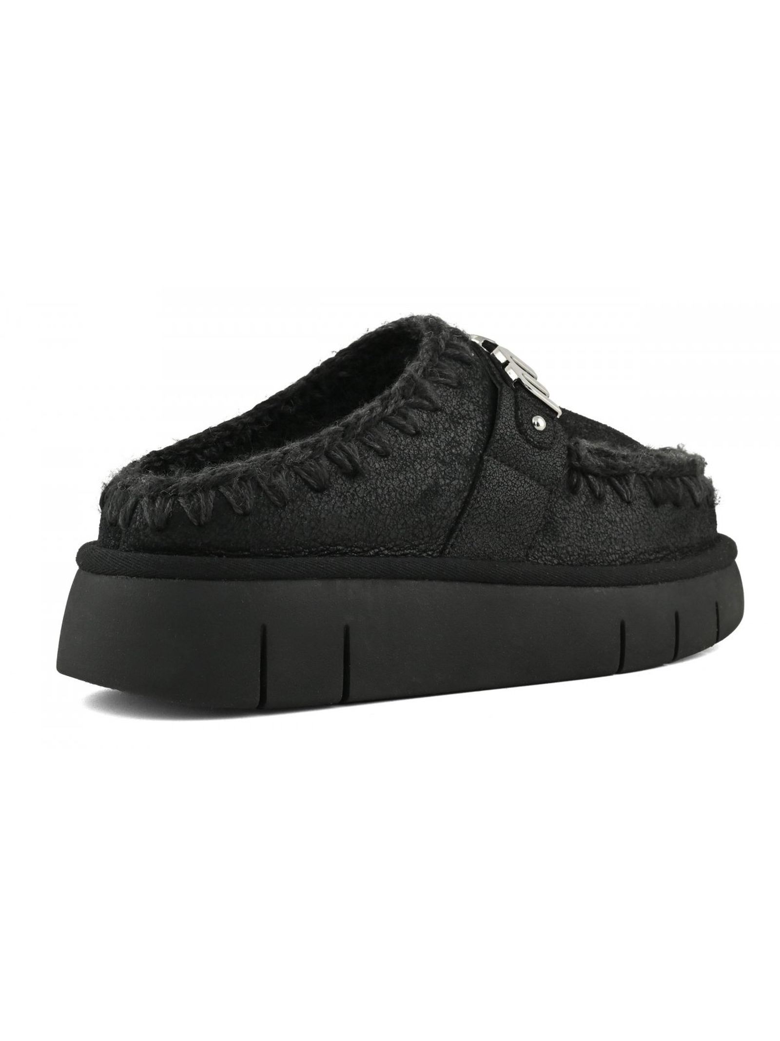 Zoccolo in pelle di montone double face nero e dettagli all'uncinetto, plantare imbottito in pelle e la suola leggera in EVA & gomma