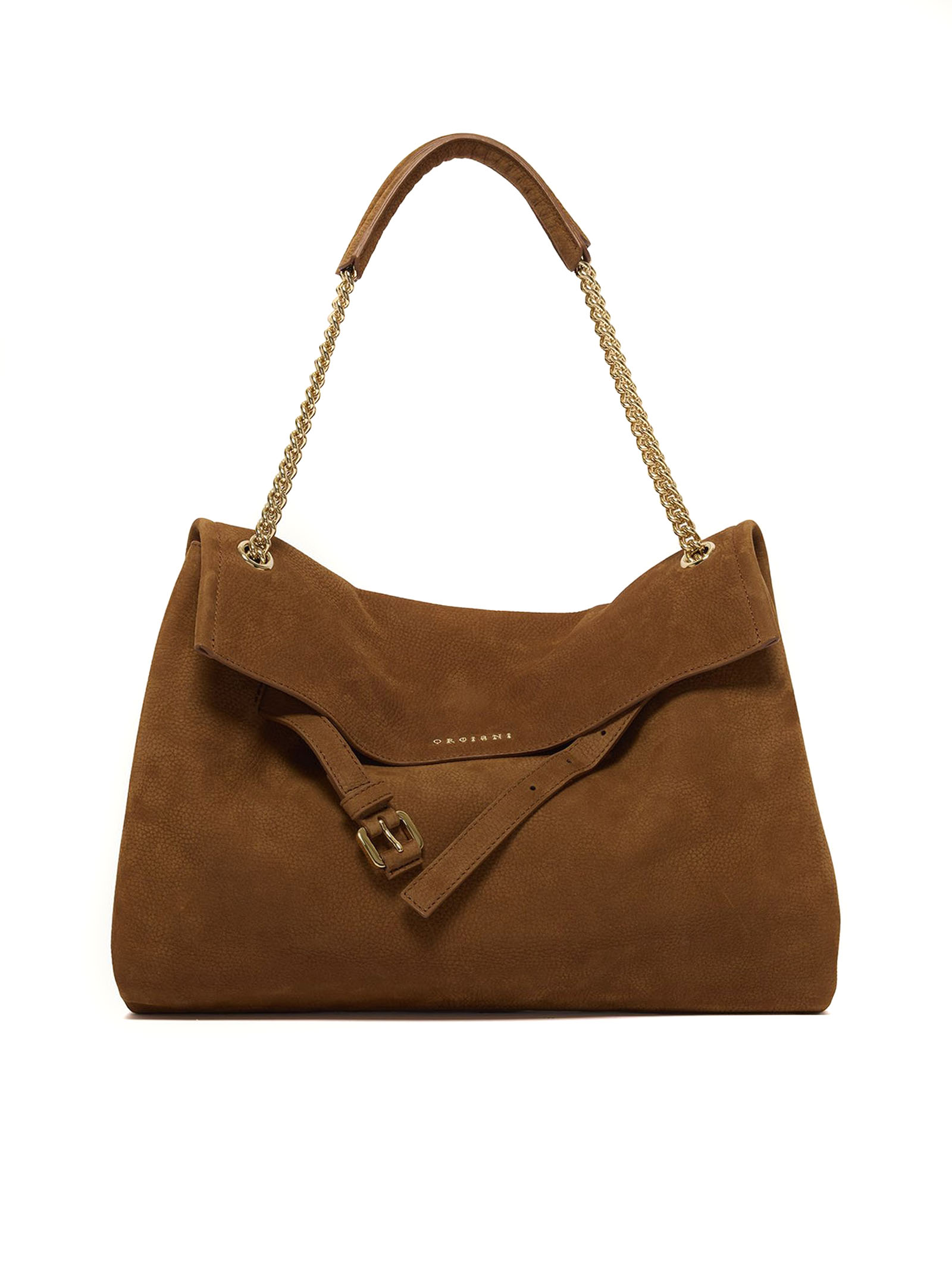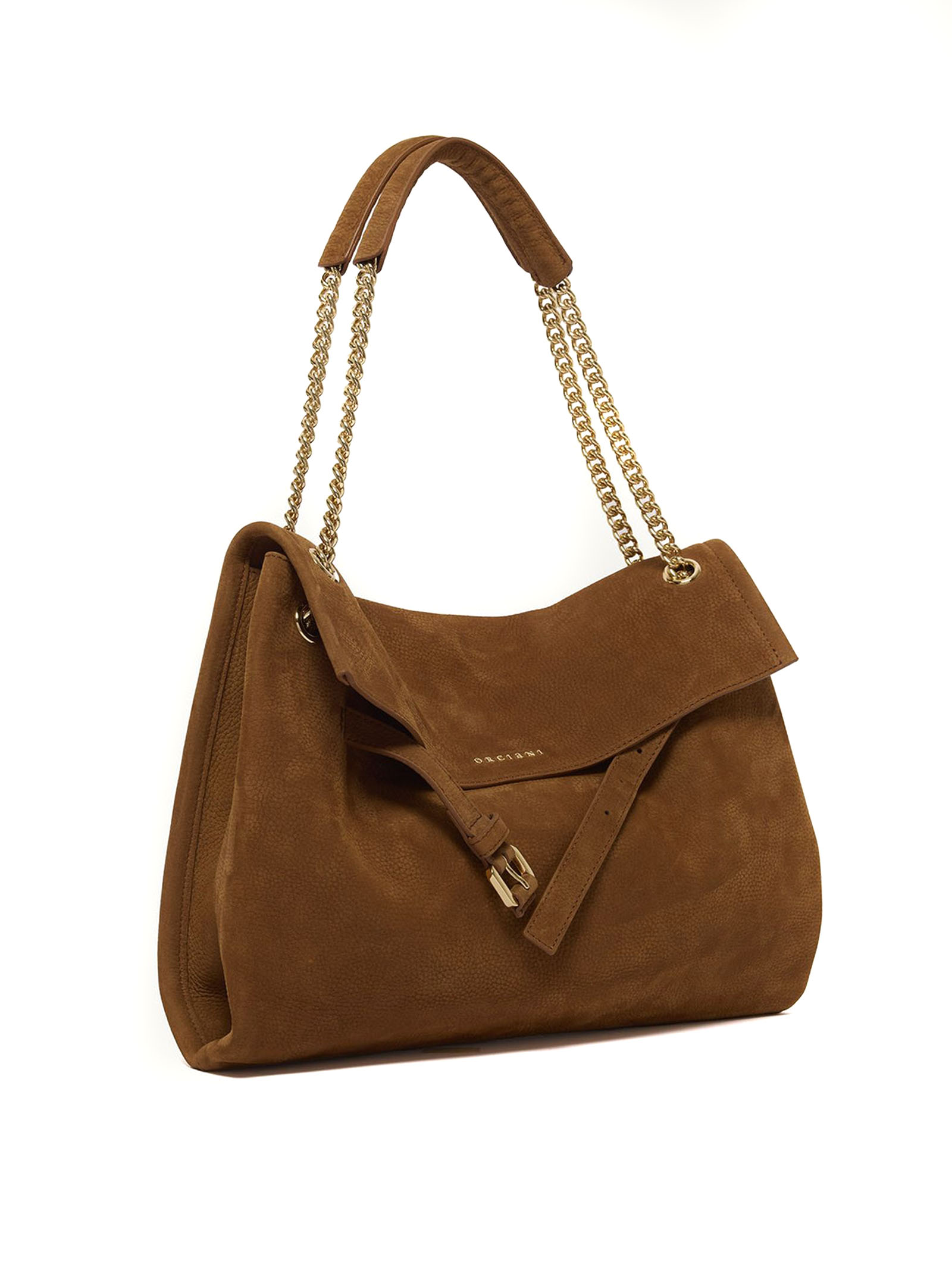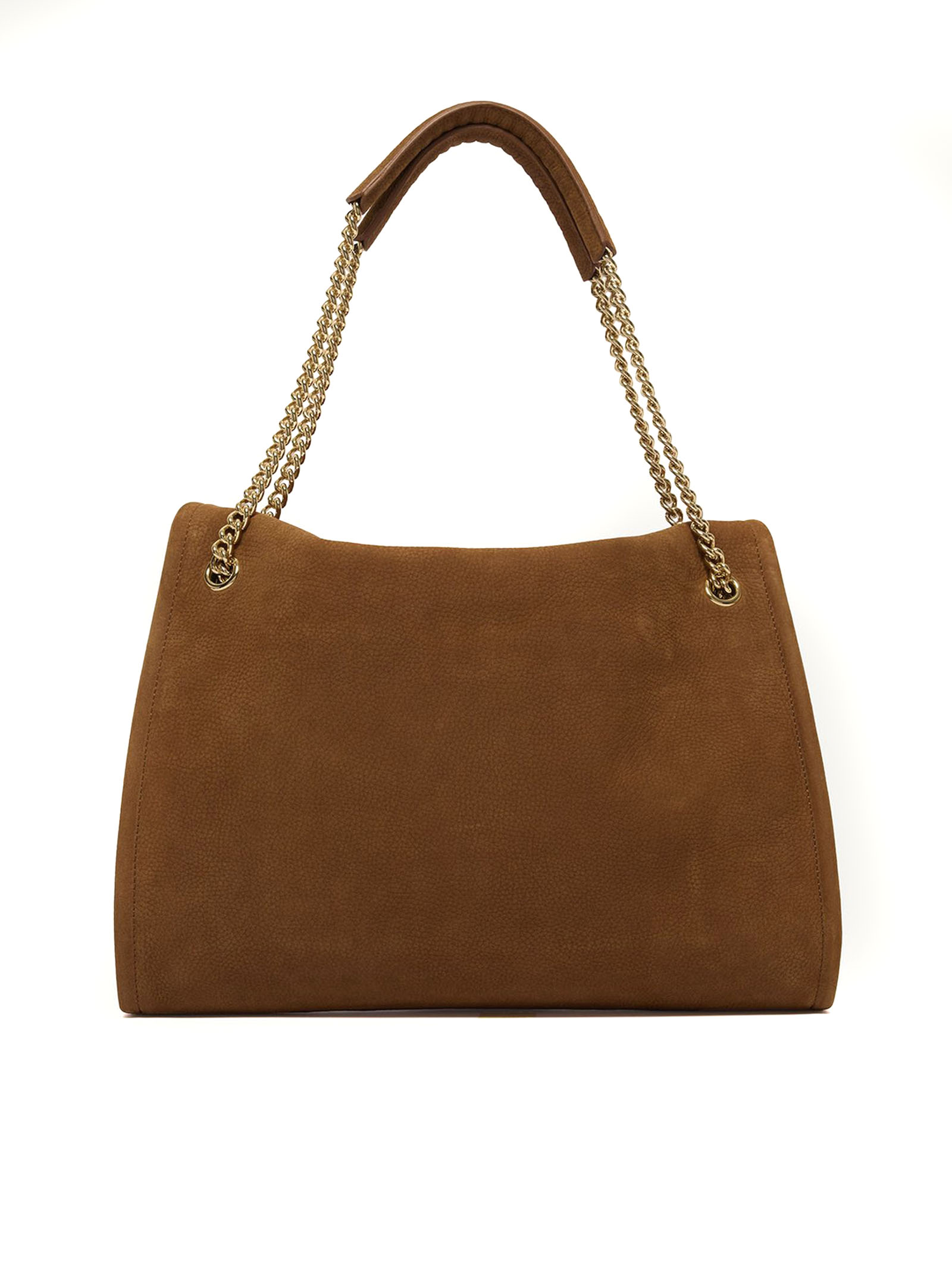 Borsa Venus Nabucco Midi a spalla in pelle nabuk, Tasche: tre taschini interni di cui uno con zip, chiusura: con patta e bottoni magnetici, dettaglio fibbia, funzionalità: manici a spalla in catena e pelle, dettagli: metallerie finitura oro lucido, Larghezza: 40 cm, Altezza: 30 cm, Profondità: 10 cm