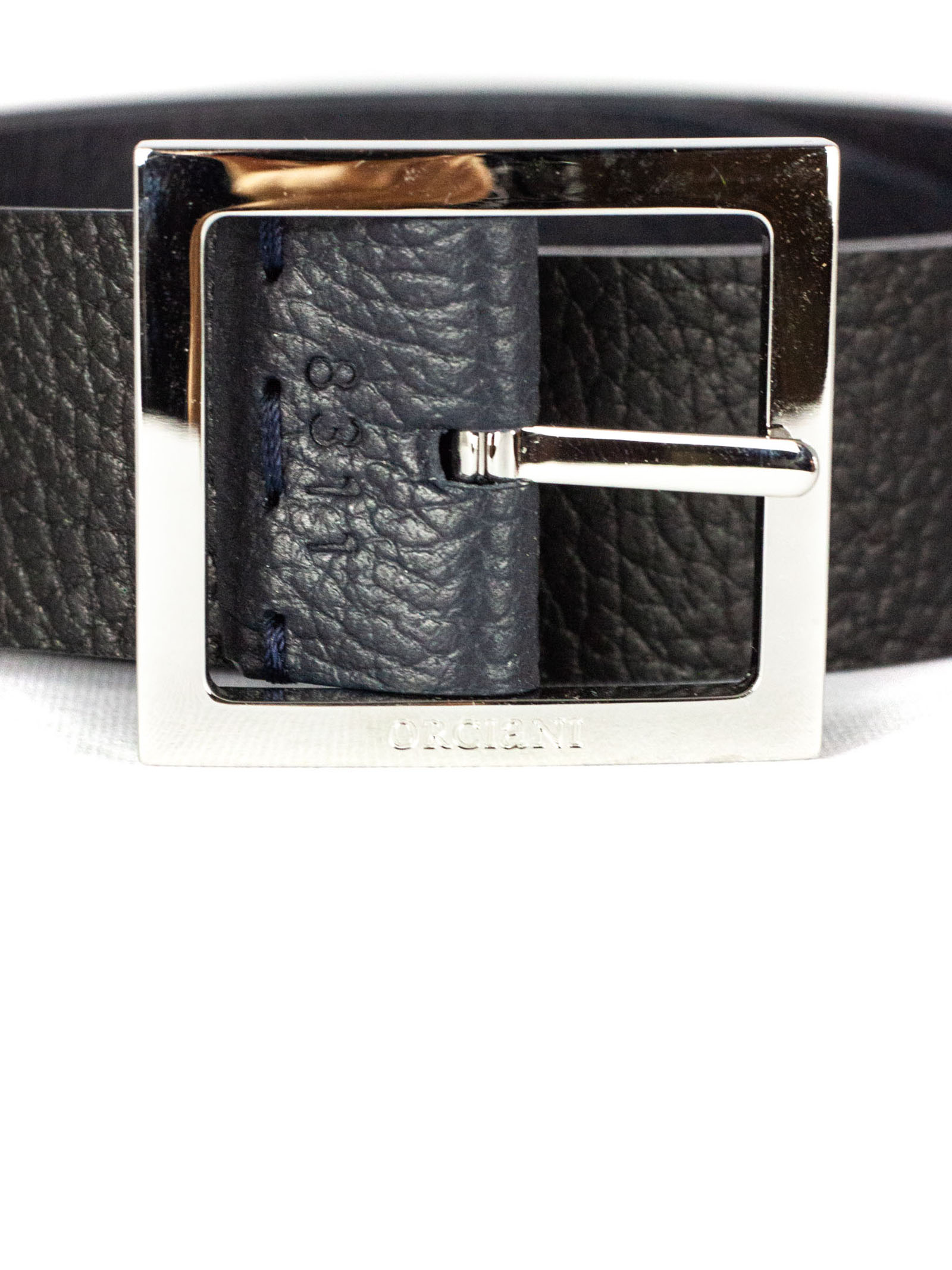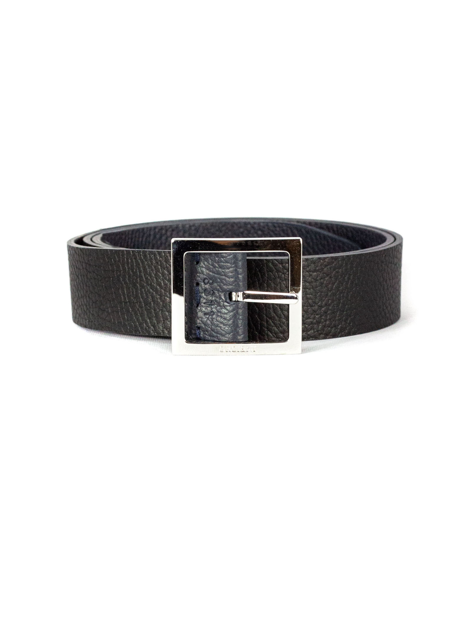 Cintura in pelle martellata nera e blu, double face con fibbia logata in palladio, altezza 3 cm