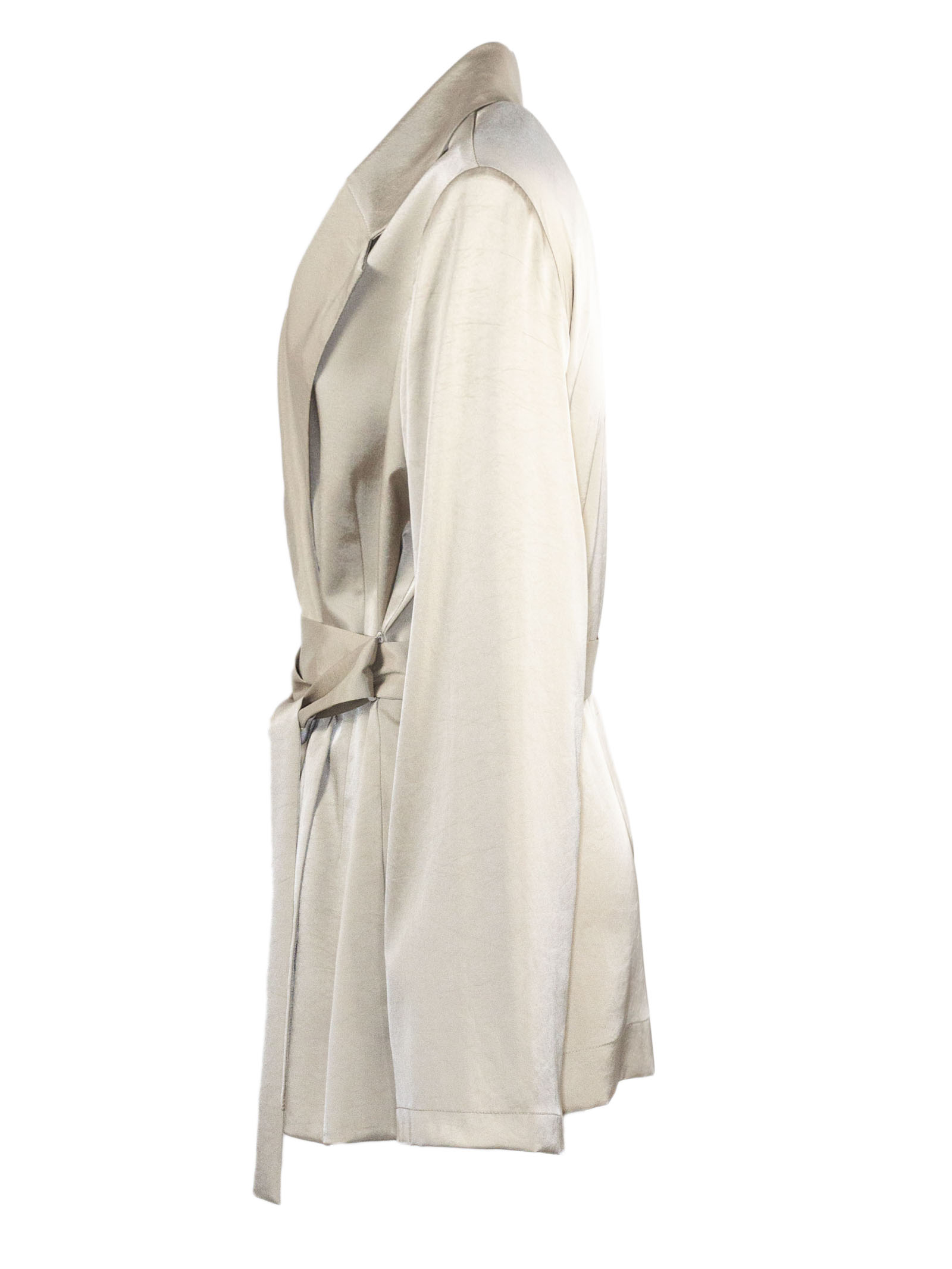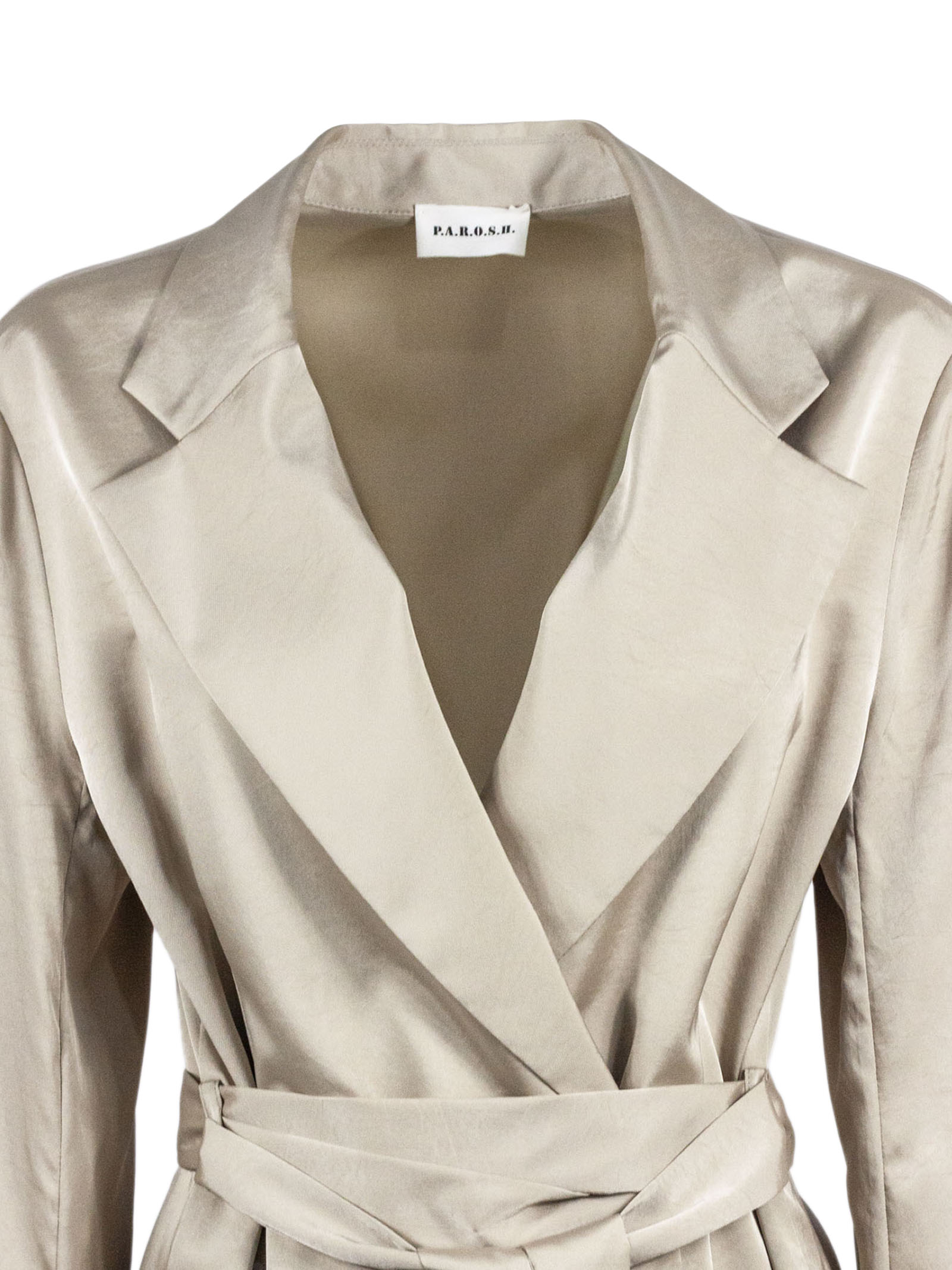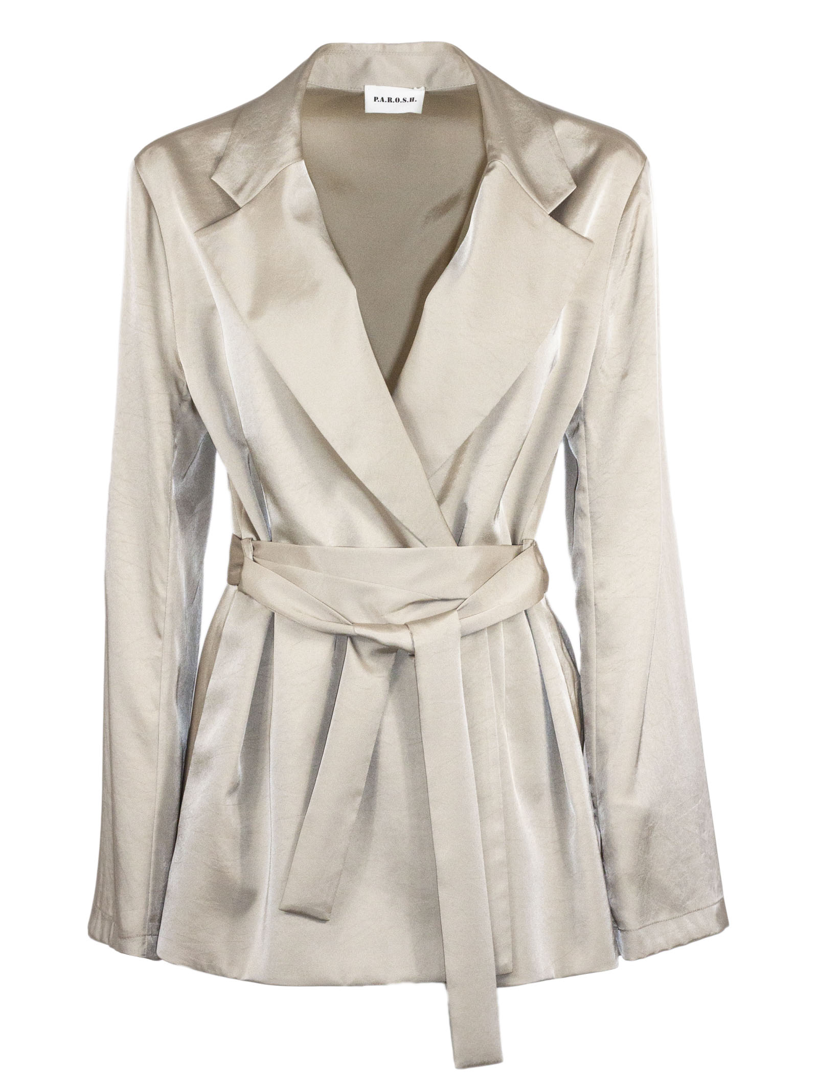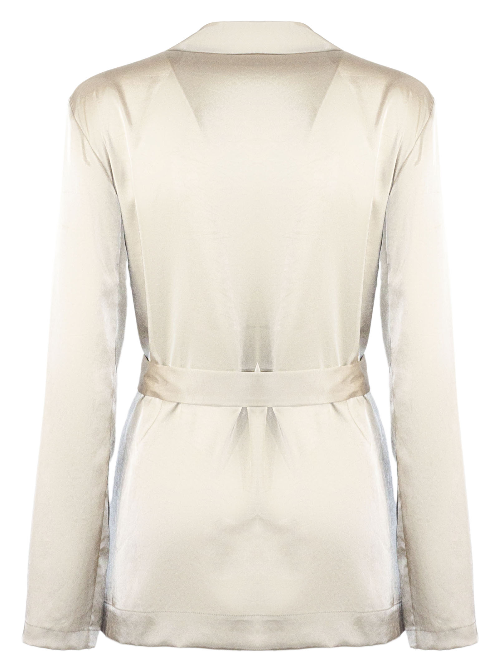 Blazer in tessuto fluido beige dalla finitura luminosa, presenta rever classici, chiusura incrociata e cintura in vita tono su tono da annodare, maniche lunghe