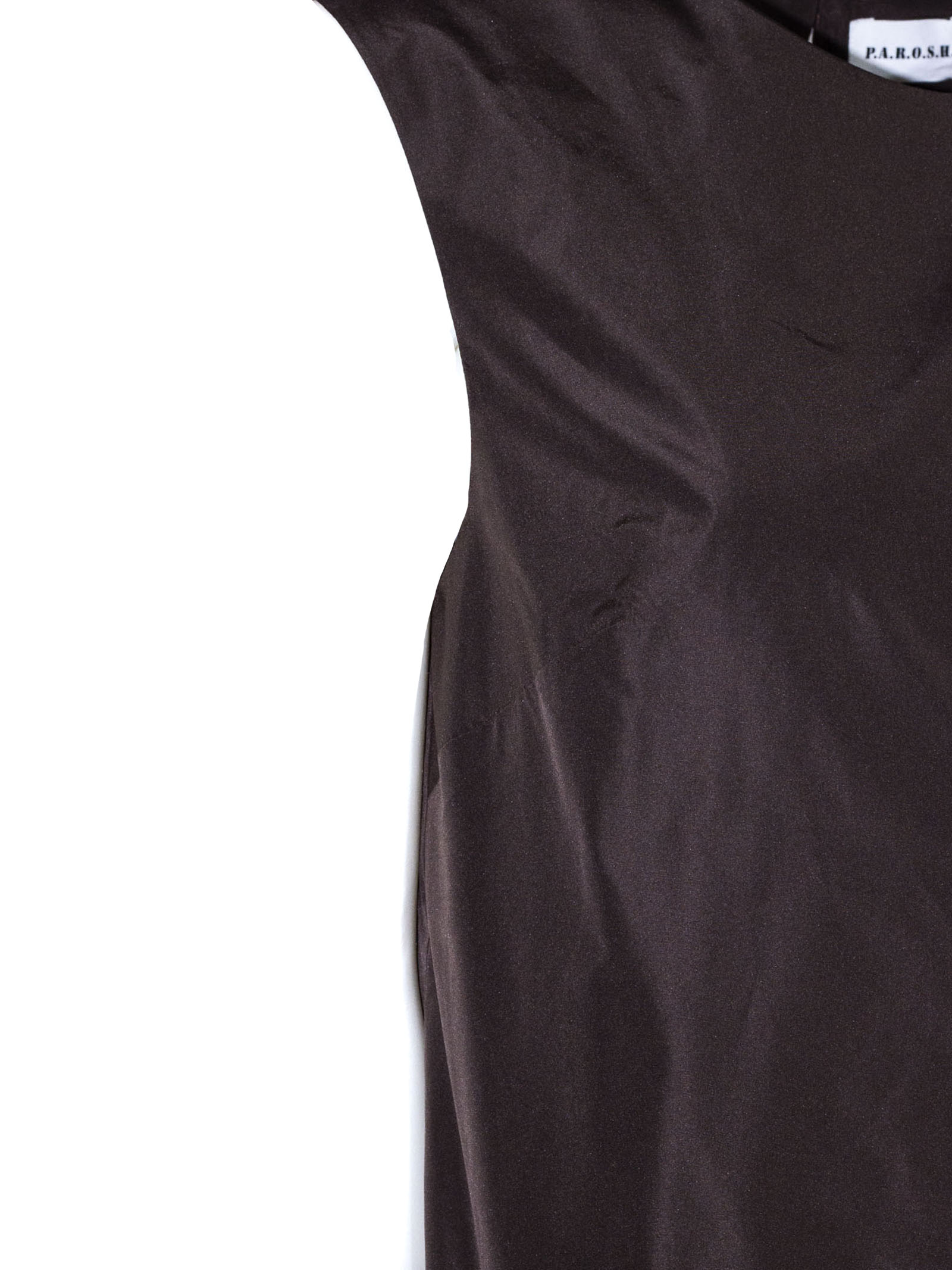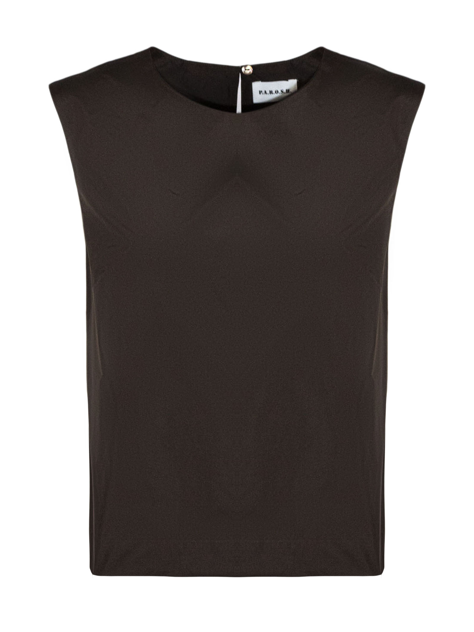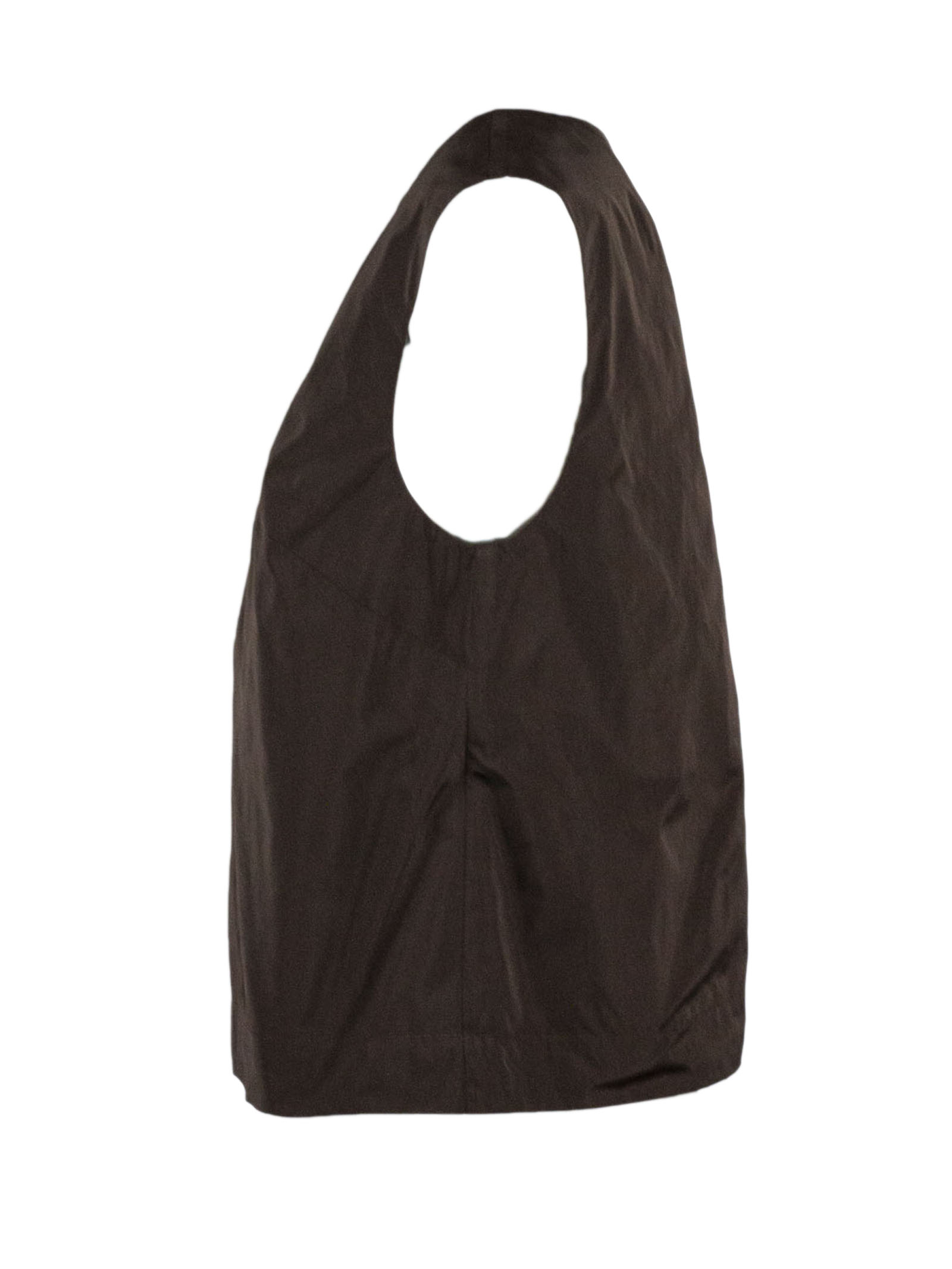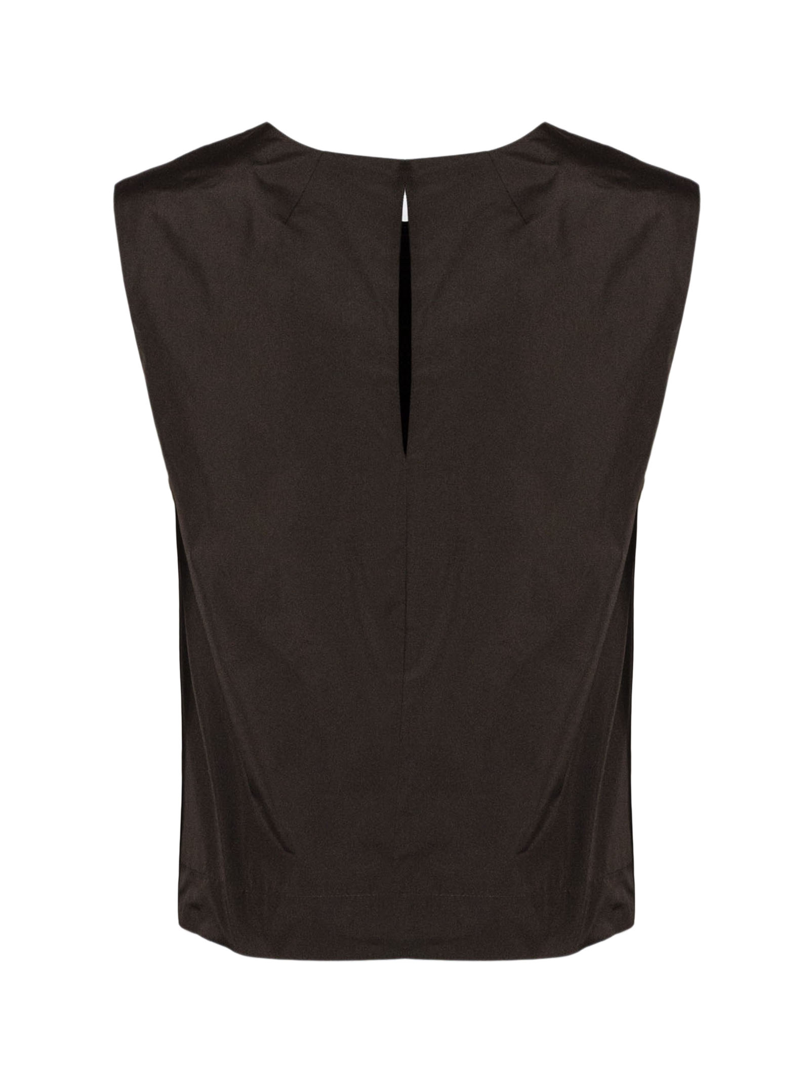 Blusa in taffetà marrone con girocollo, senza maniche, chiusura sul retro con bottone