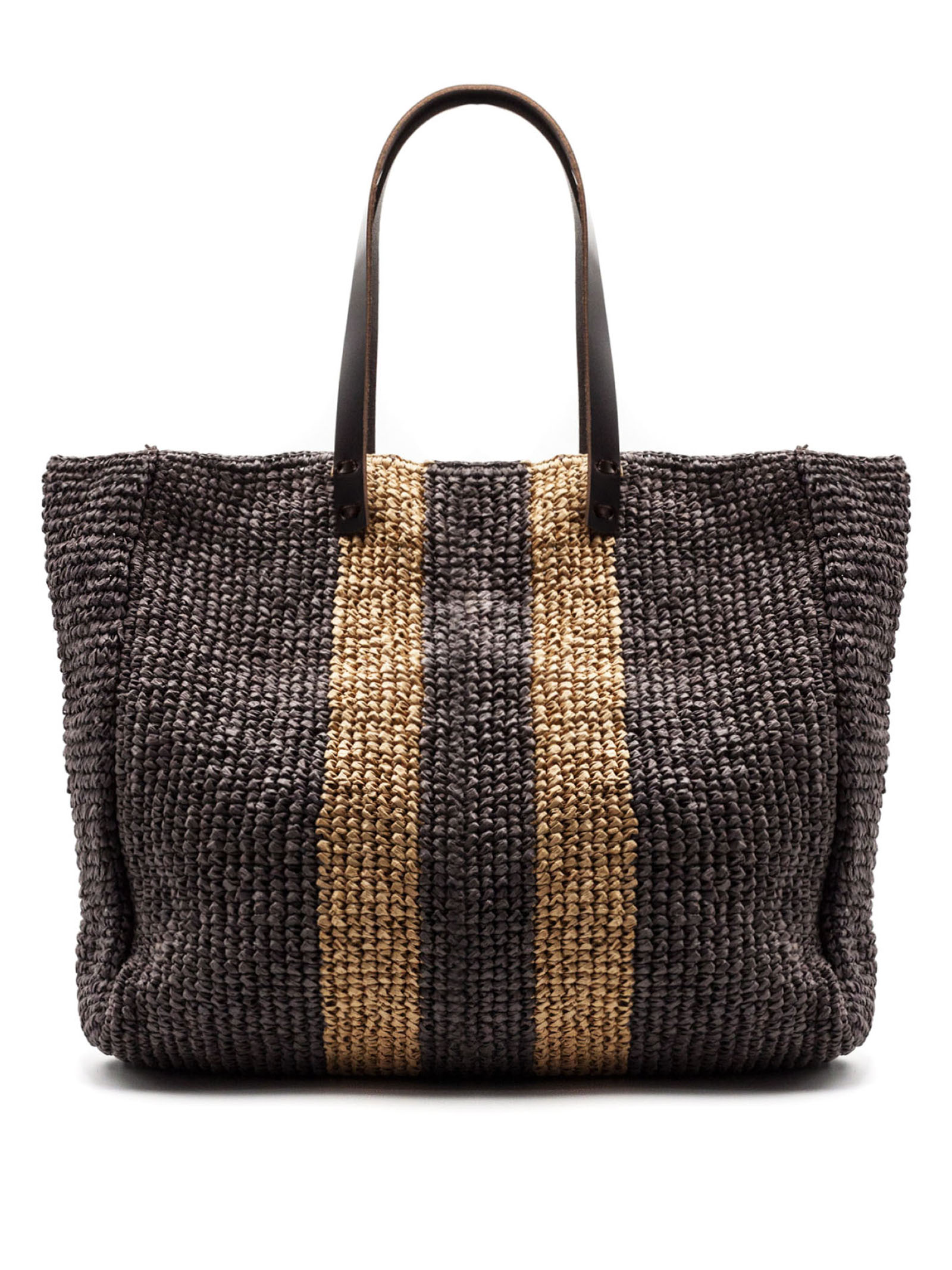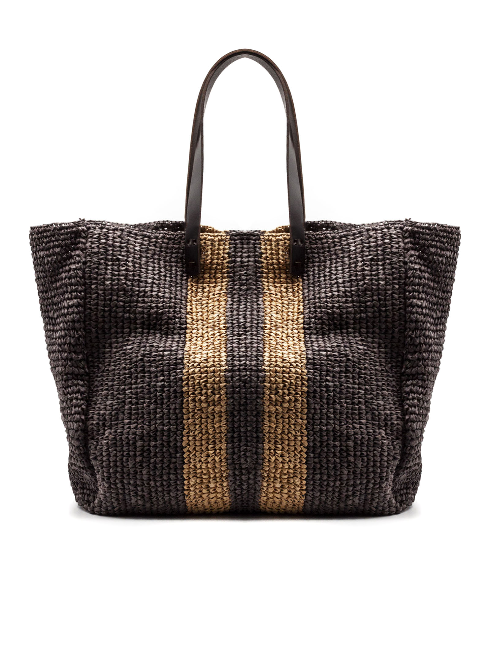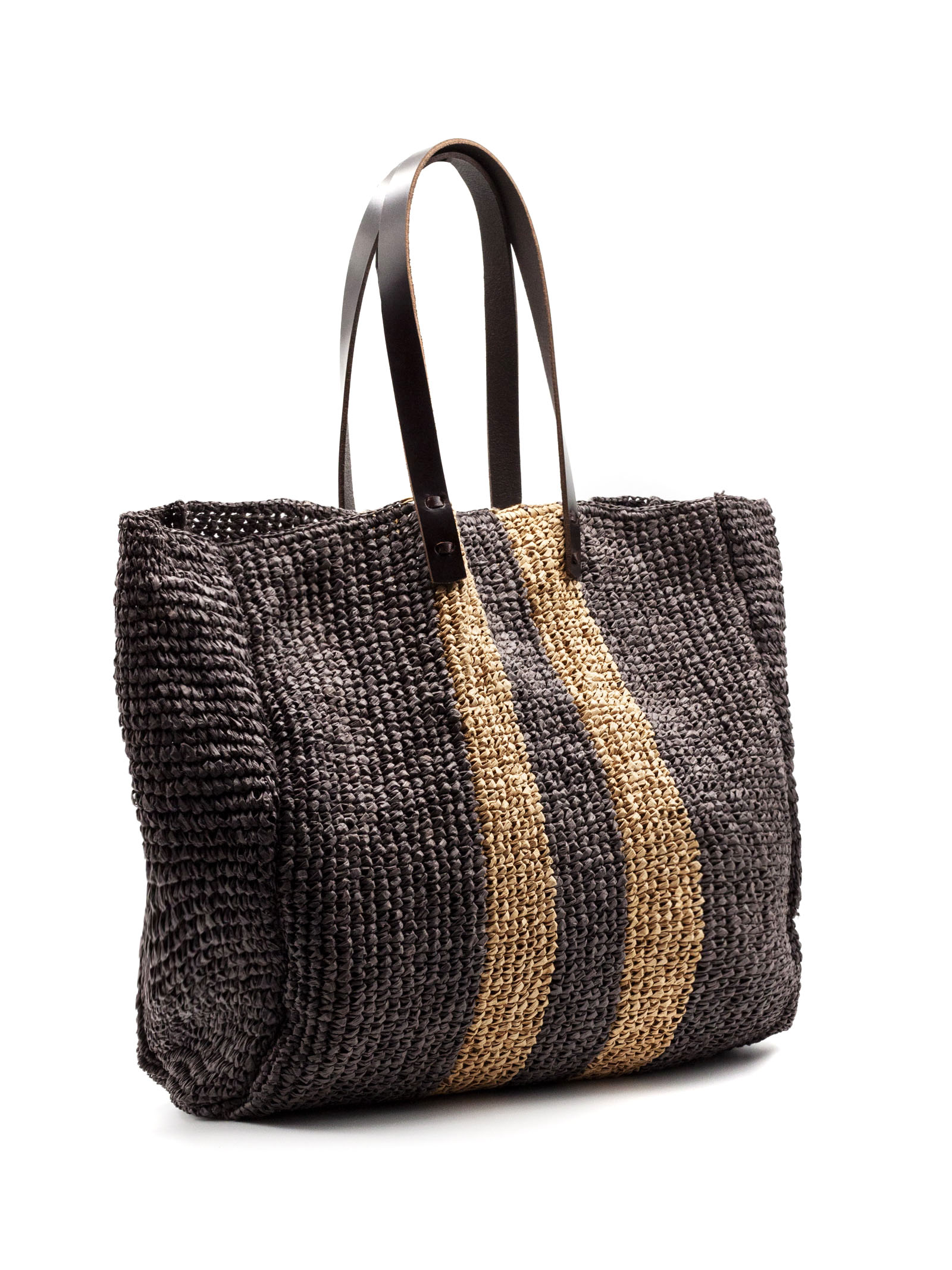 Borsa shopper in fibra intrecciata testa di moro con motivo a righe verticali, design leggero e capiente, dotata di sacca interna in cotone, doppi manici in pelle, dimensioni L40 x A35 x P20 cm