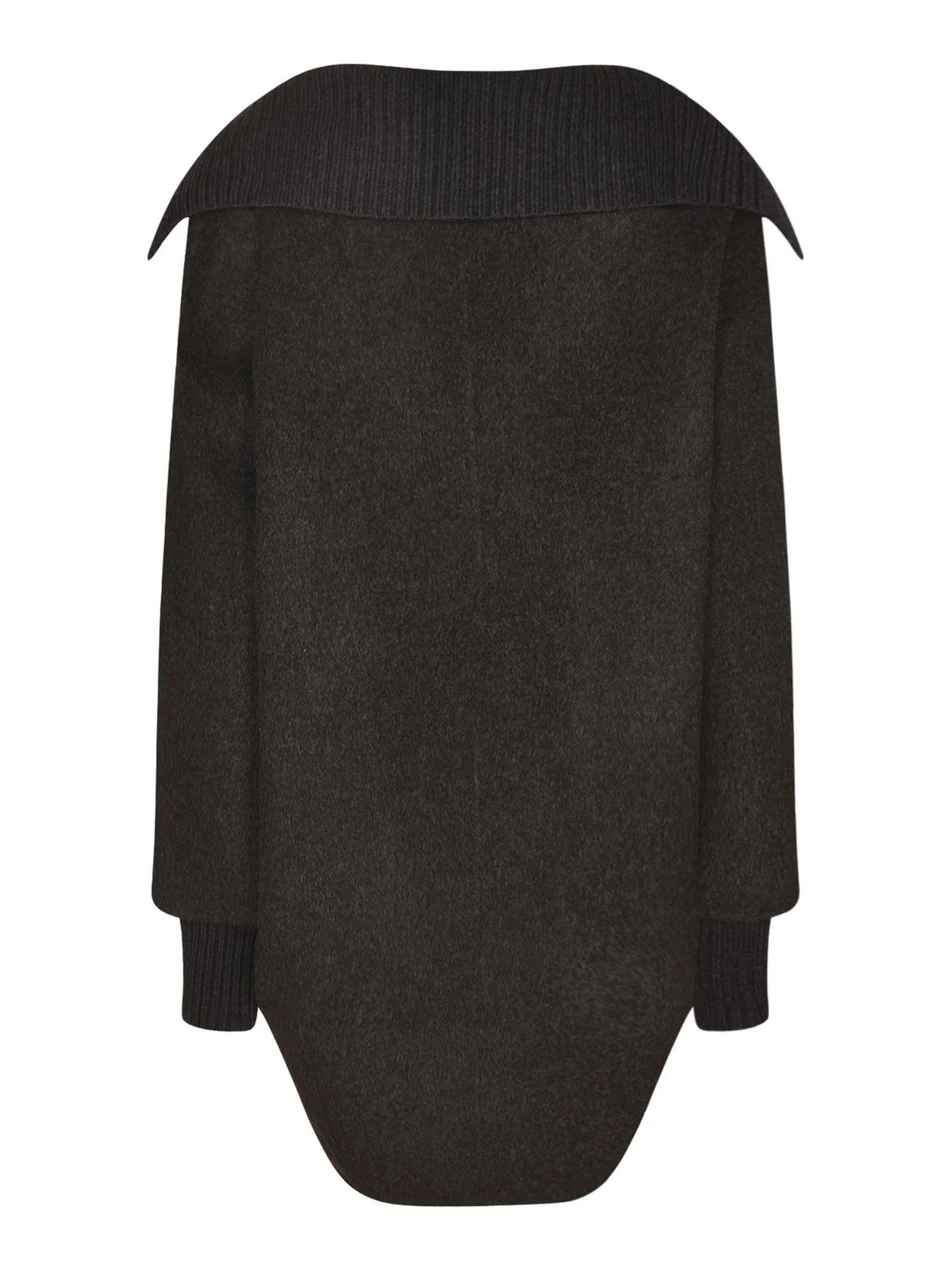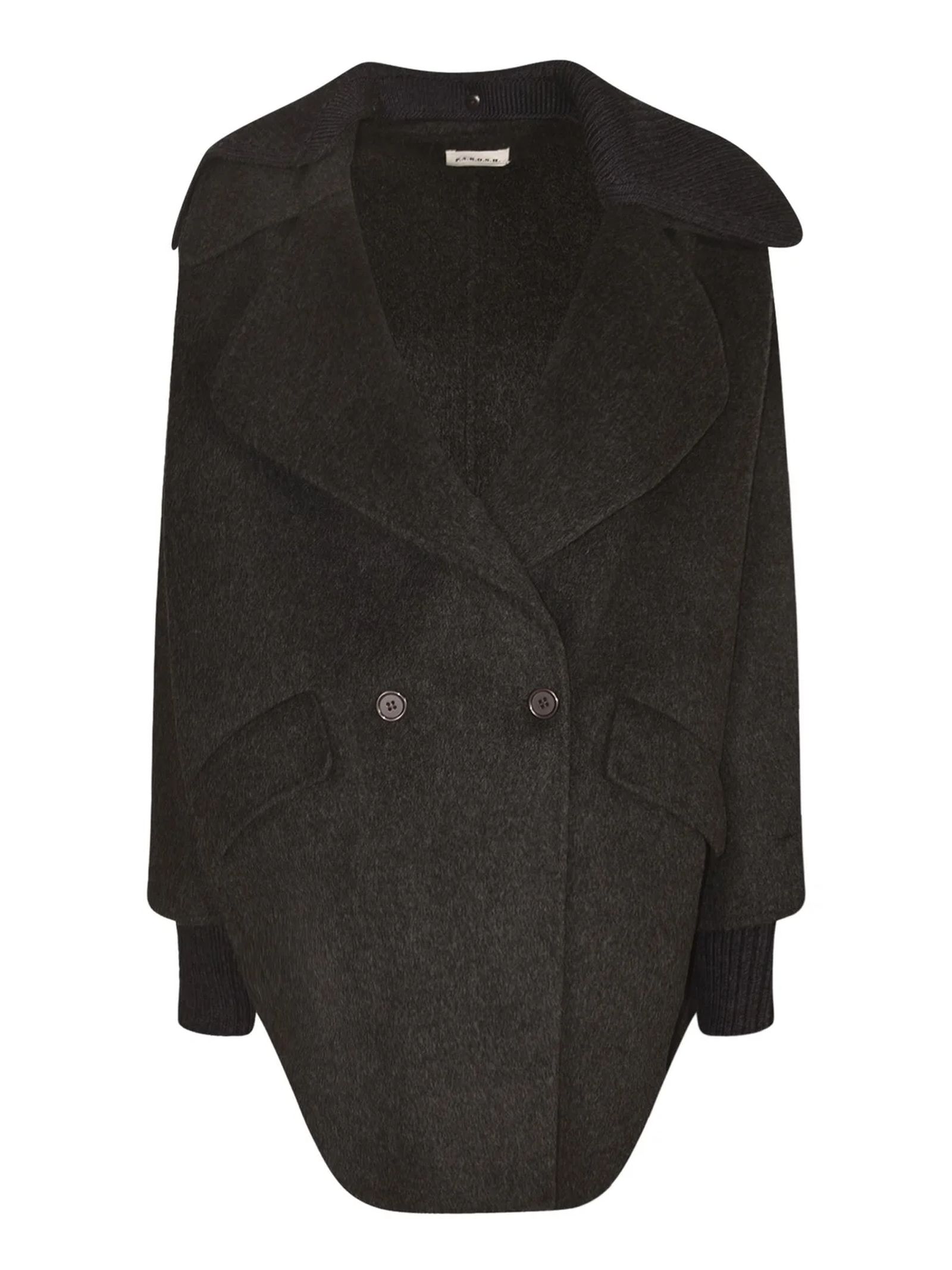 Cappotto in lana grigio, chiusura frontale con abbottonatura, tasche laterali con patta, revers larghi, maniche lunghe