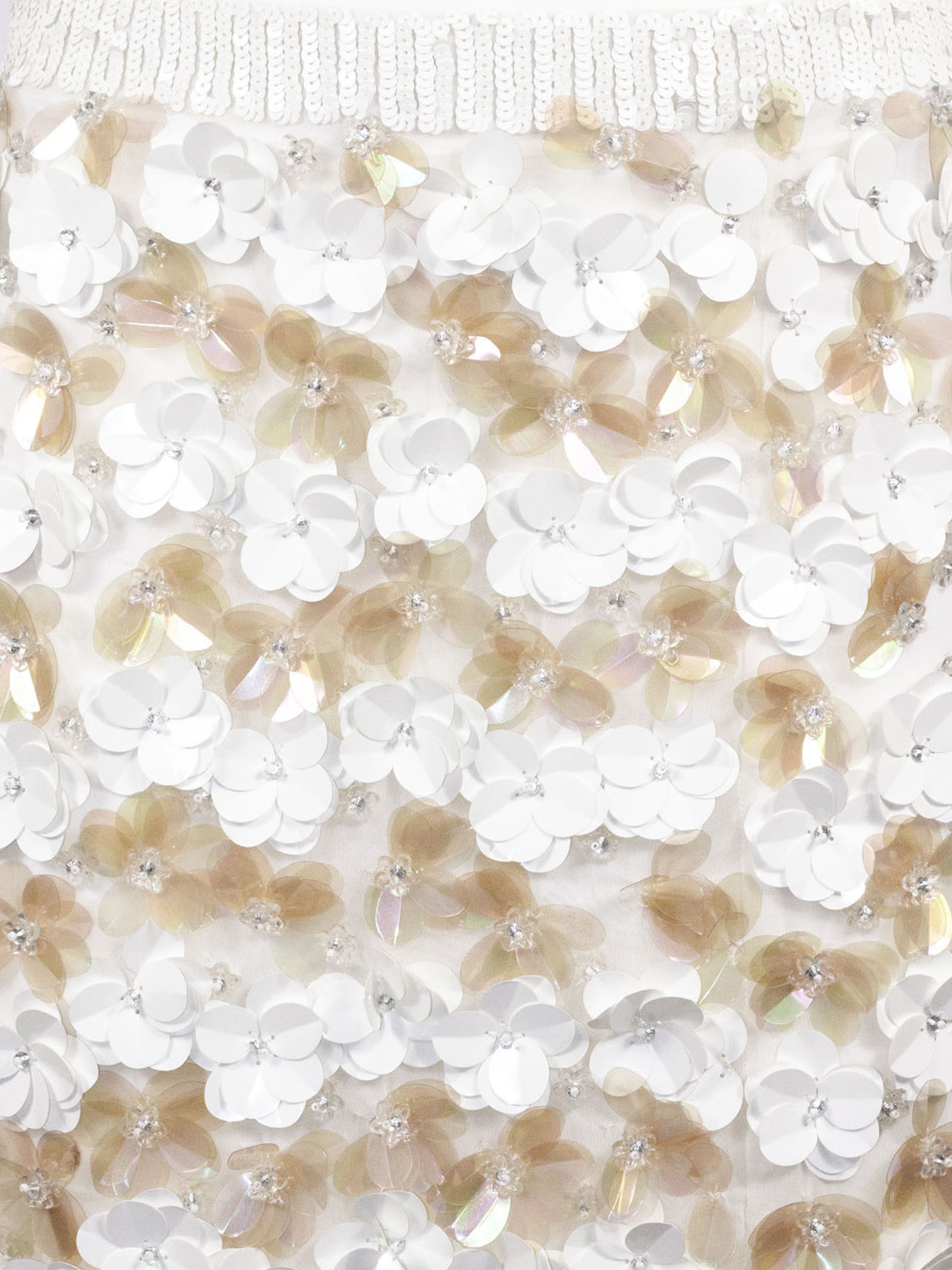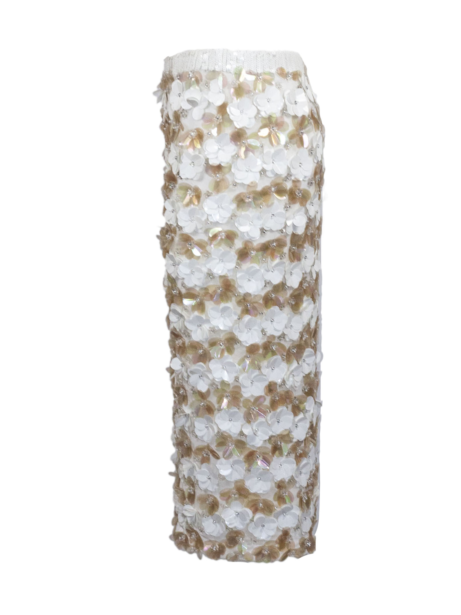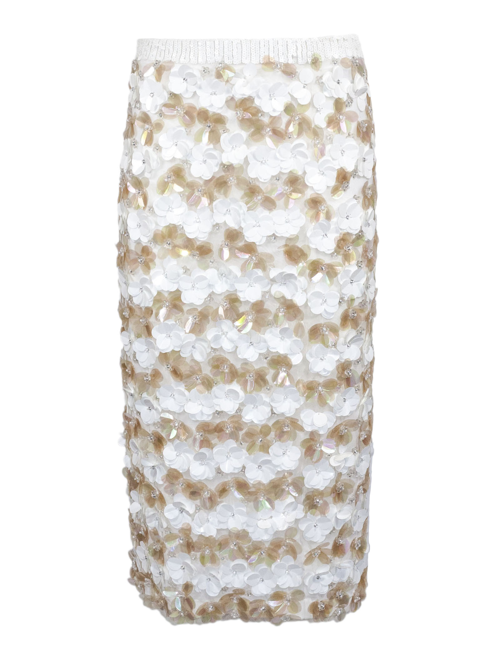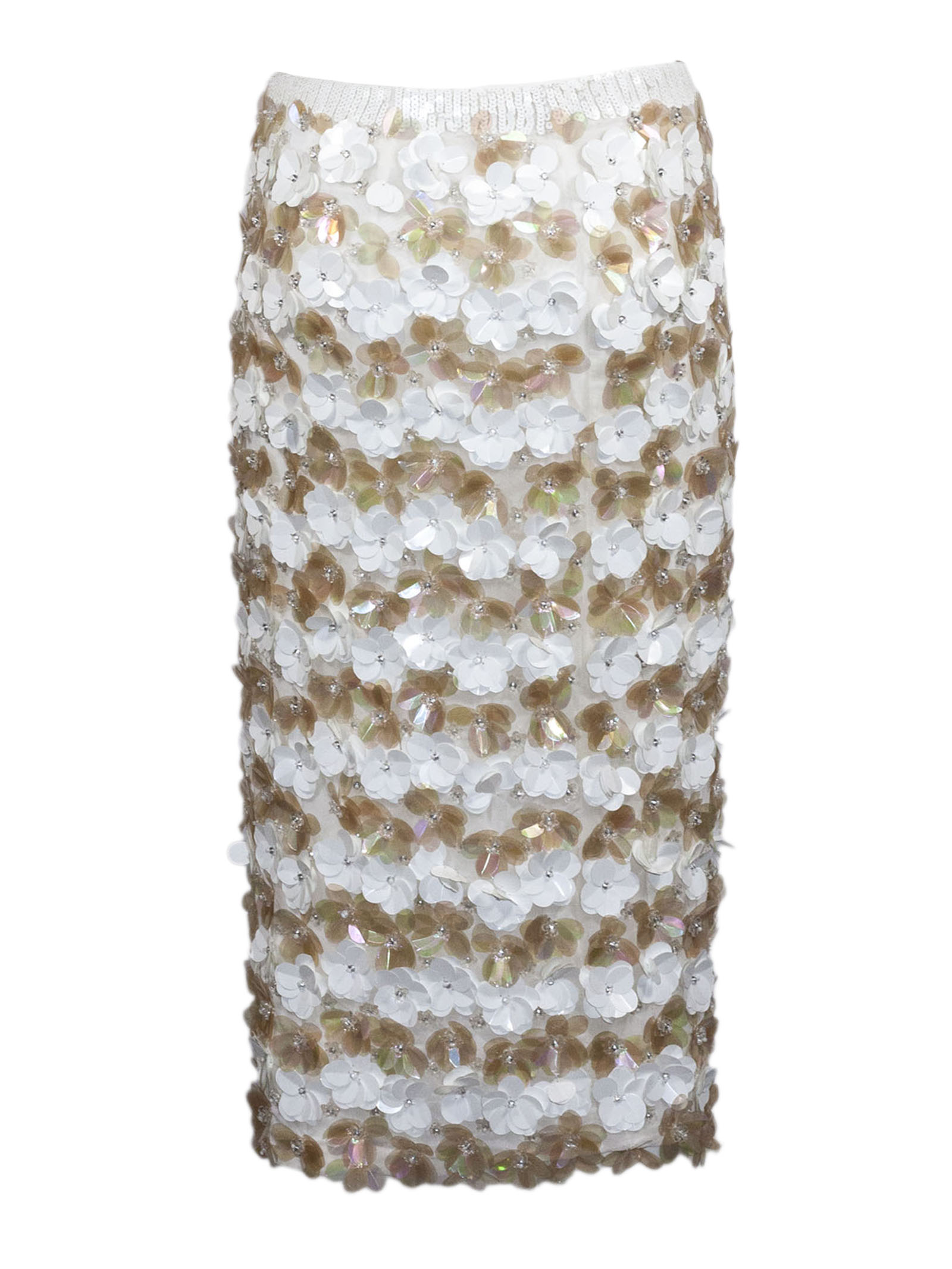 Gonna lunga in maxi paillettes a fiori bianca e marrone, vita elasticizzata, interno foderato