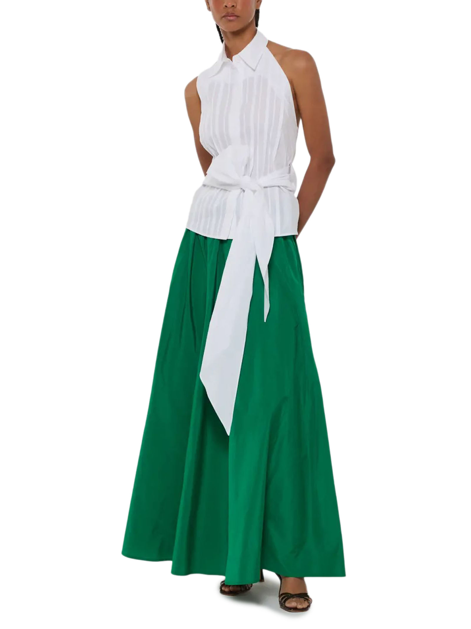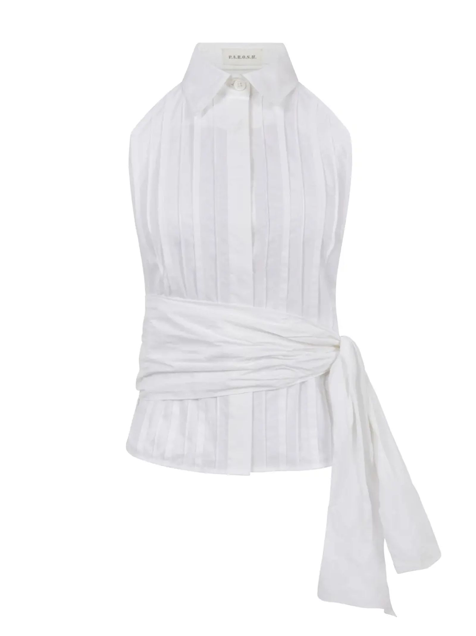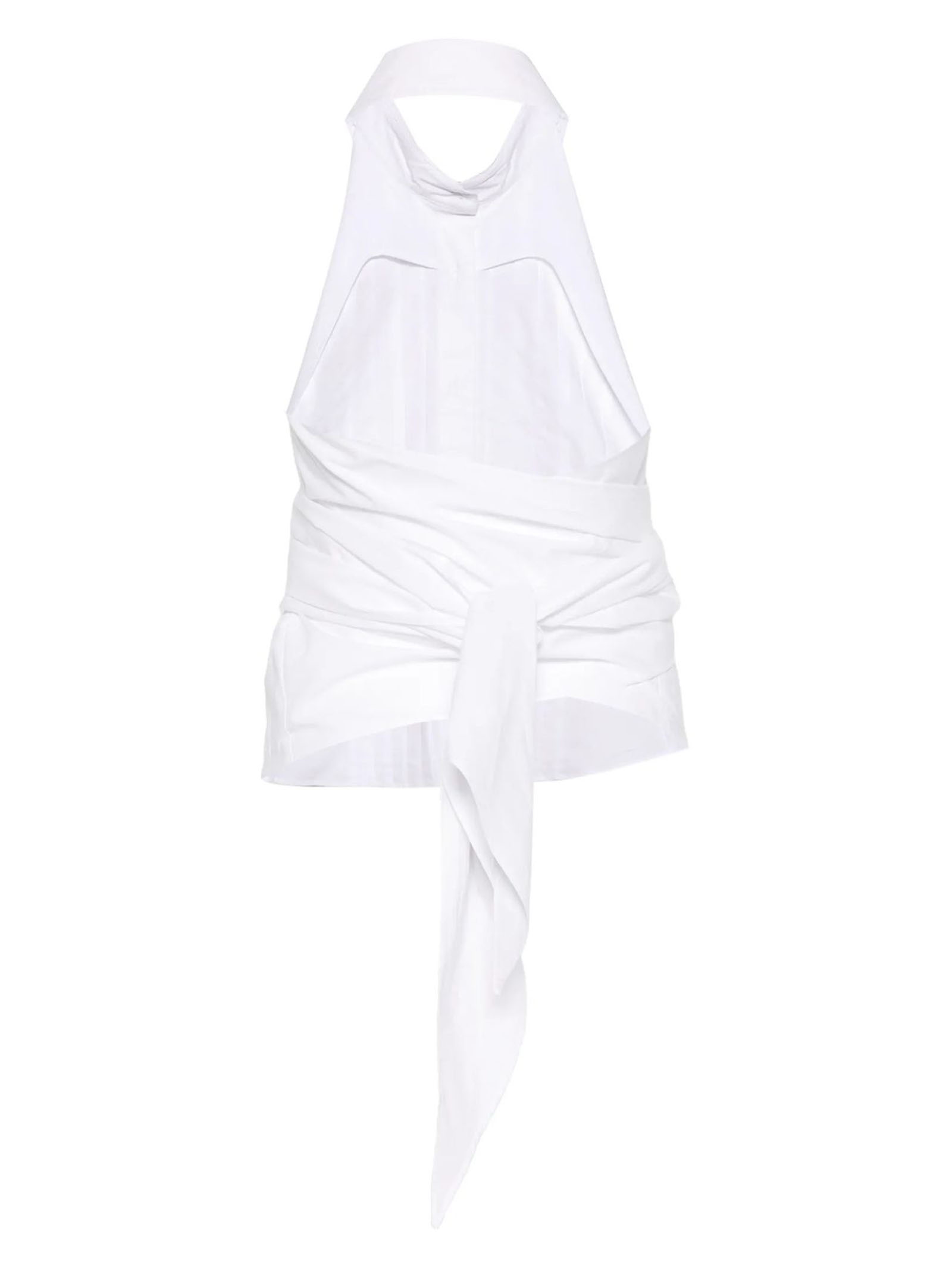 Top plissettato in cotone bianco, pieghe, scollo sul retro, schiena scoperta, chiusura con nodo, senza maniche